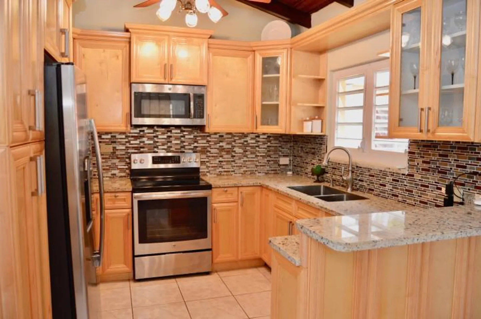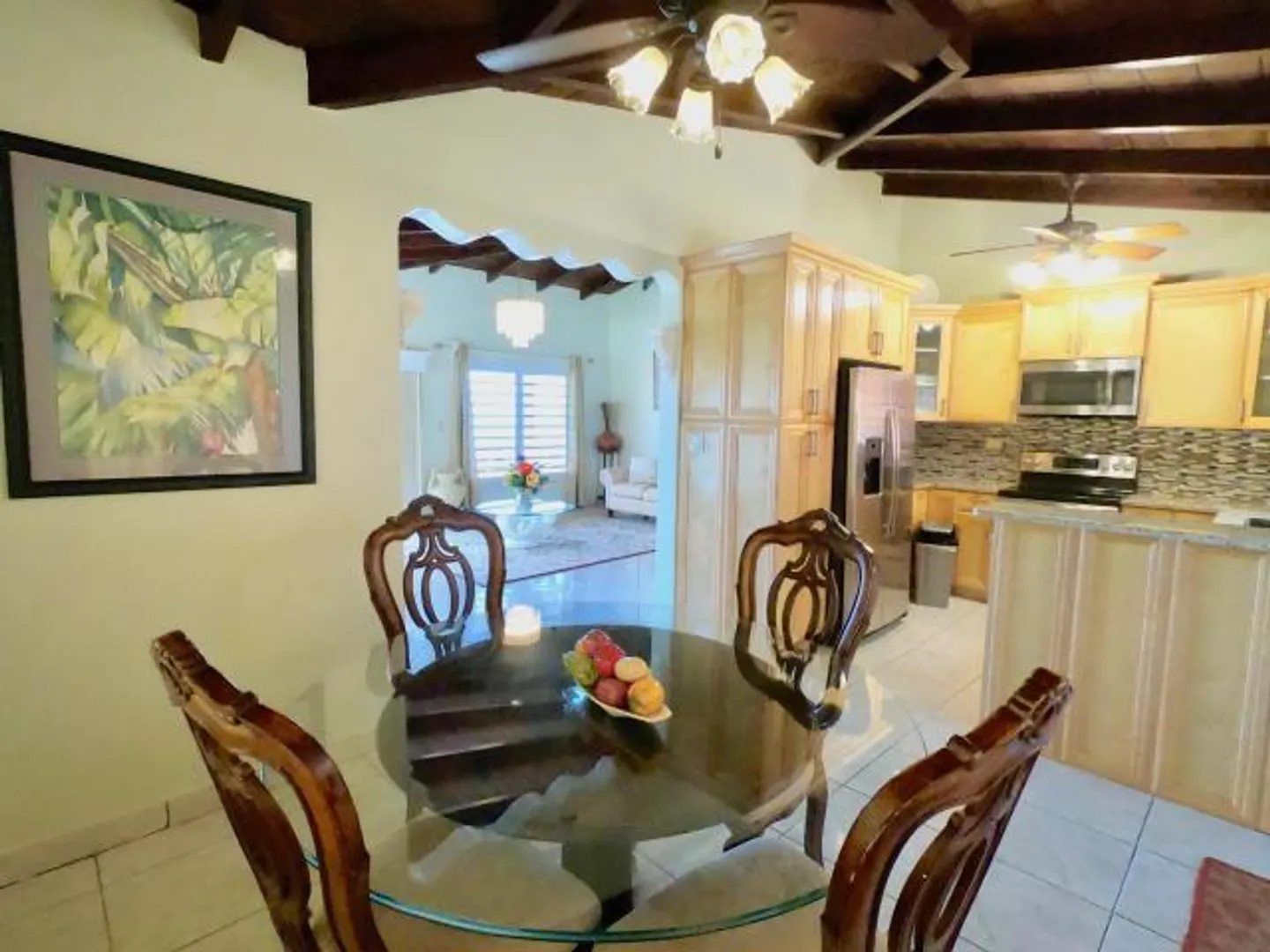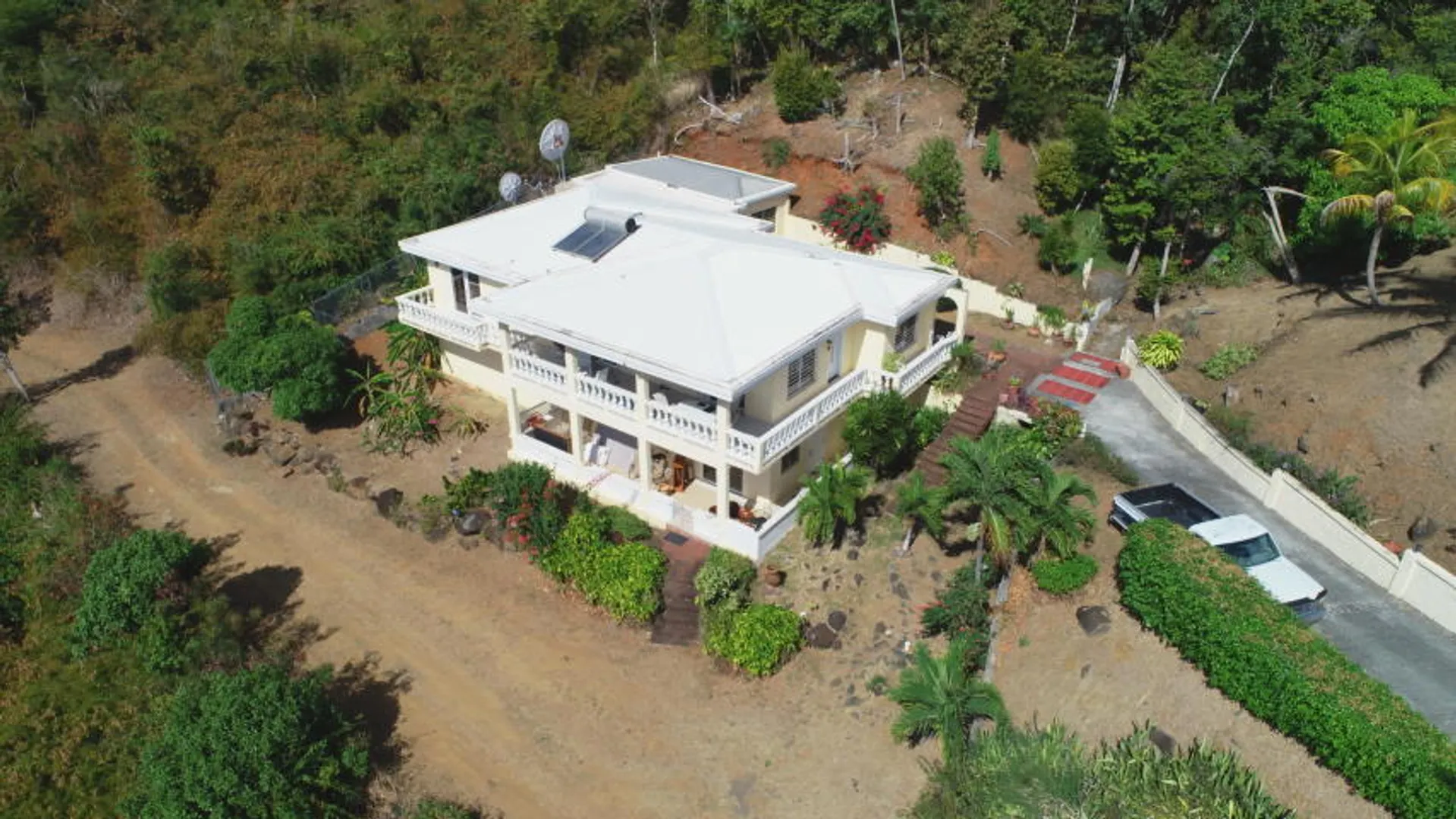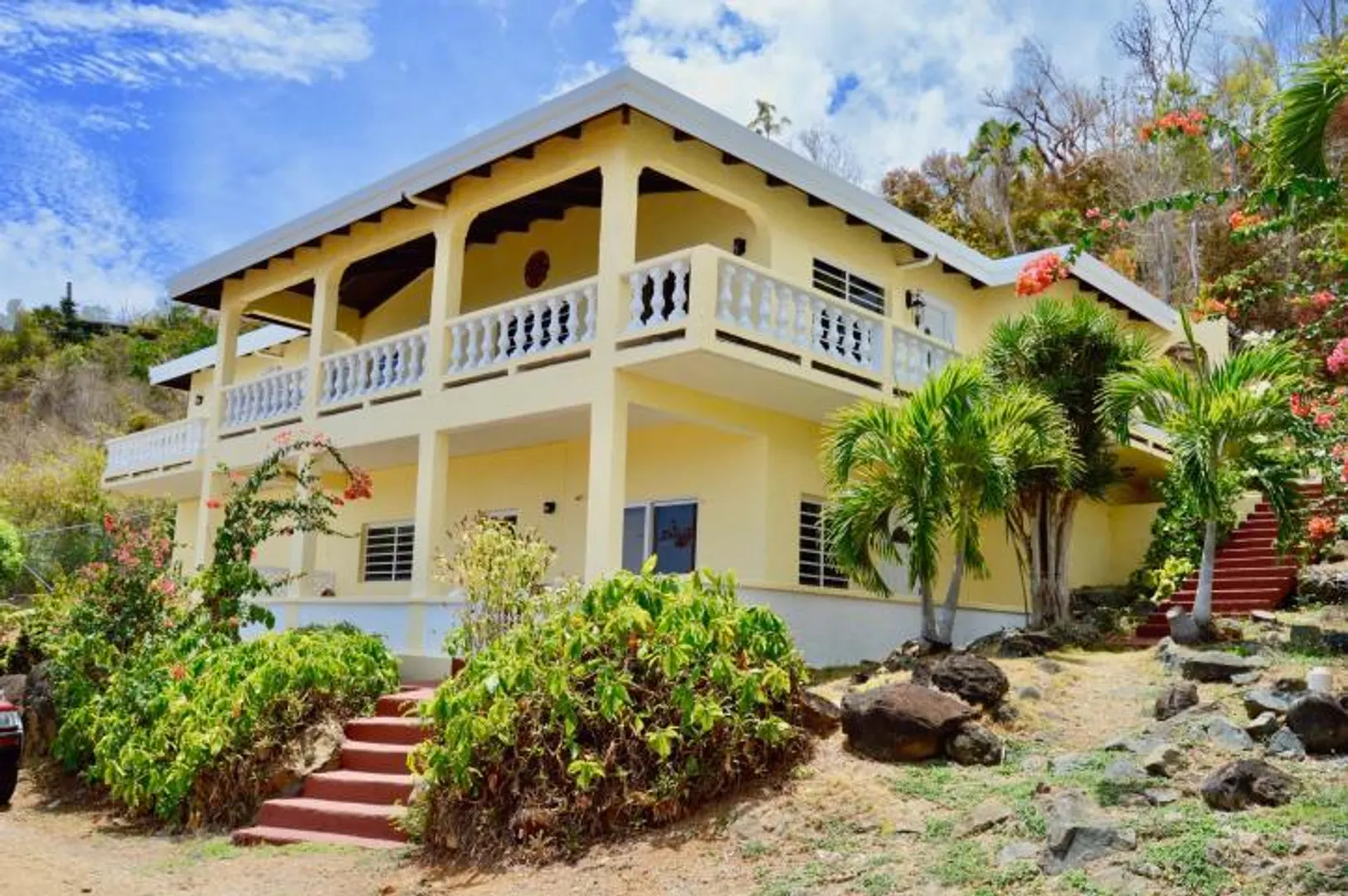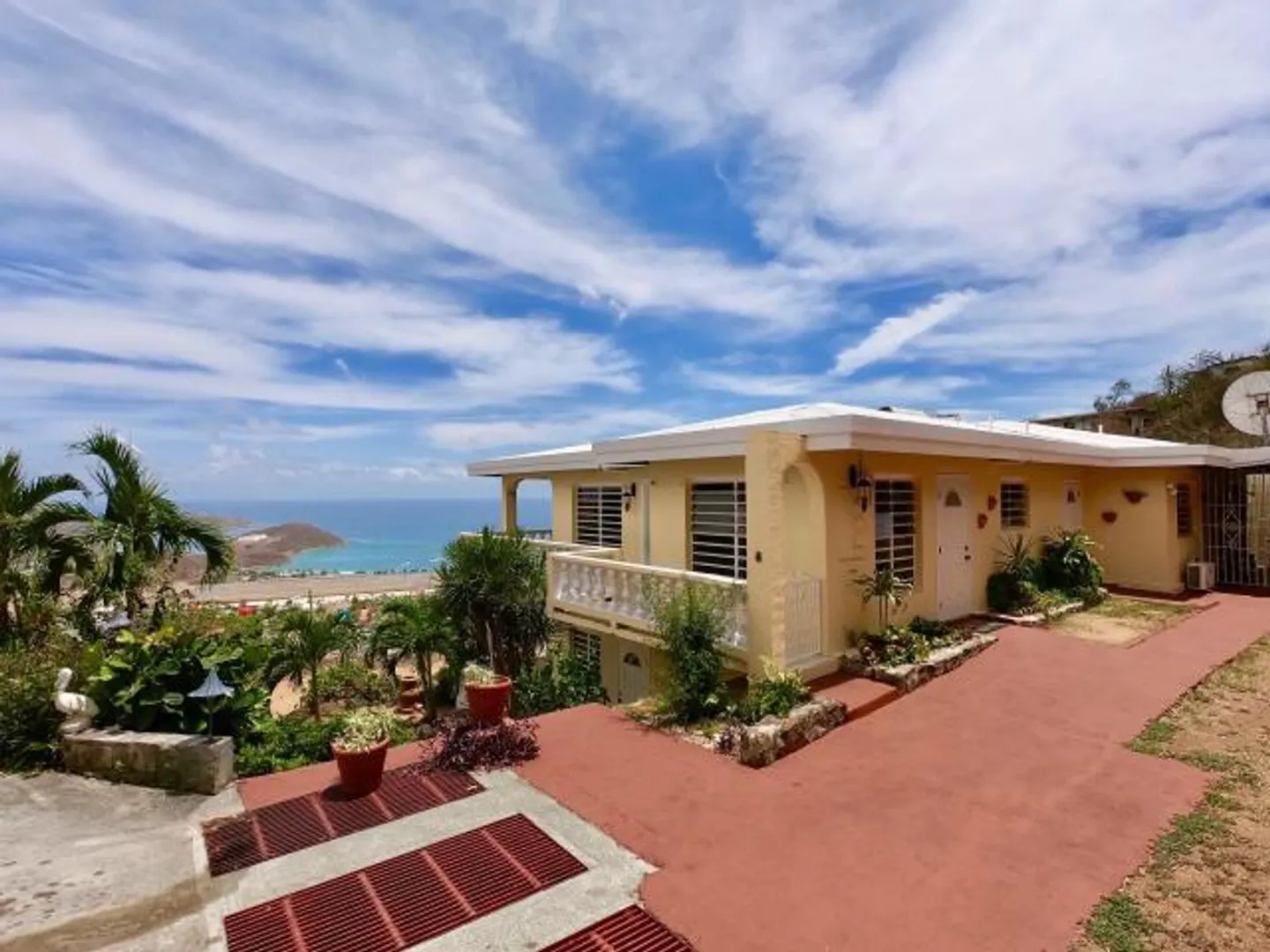 Lovely tropical views from the breezy balconies of this immaculate 5BR/3BA home Easy access to the airport and town. Vaulted ceilings and sparkling tile floors throughout . Detached laundry room and exercise room. Honey colored custom kitchen with stainless steel appliances, solar hot water heater. 4 Mango trees mature excellent landscaping. Double pillars @ entrance w/ concrete palm lined driveway for plenty of parking. No hurricane damage to this well built cinder block and poured concrete home. 1/1 delightful downstairs furnished 1Bed/1 Bath apt w/ separate entrance beautiful gardens, off street parking 6+cars . kitchen with double sink , electric stove /oven, stainless steel fridge, long counter tops & bar w/ stools & flat screen TV