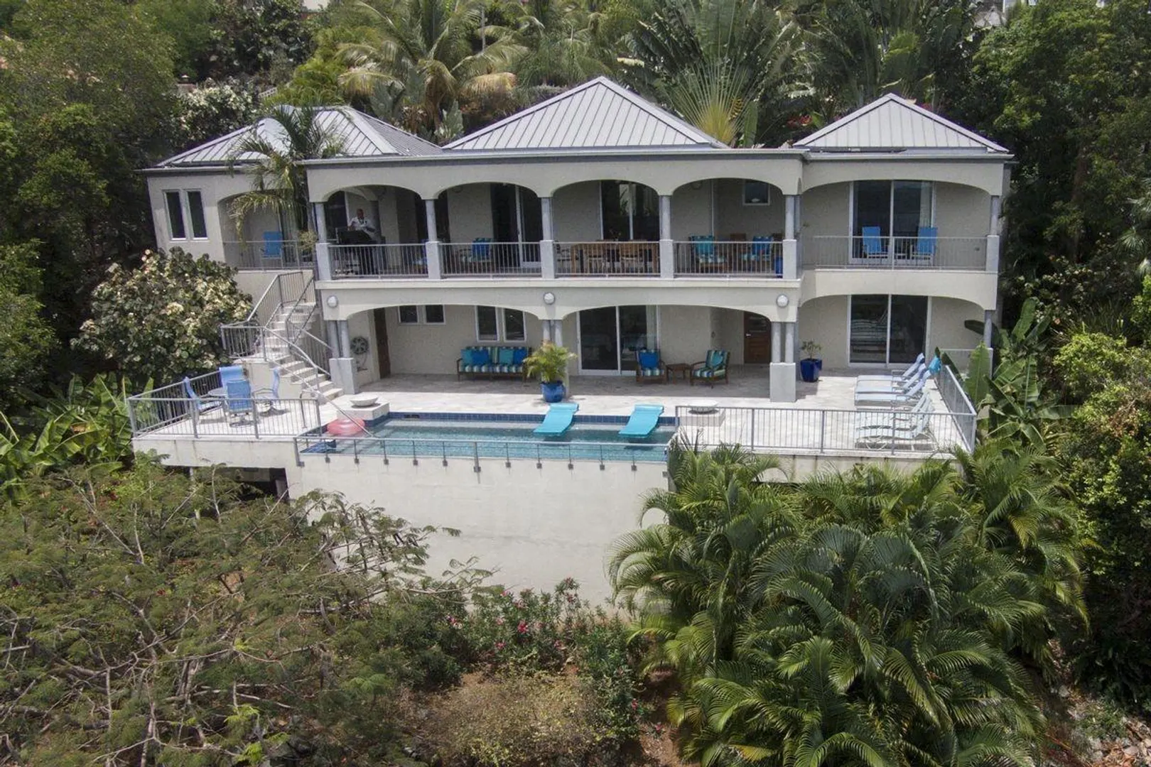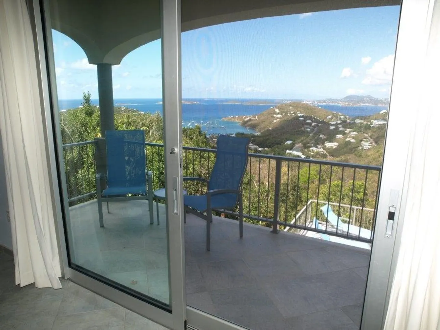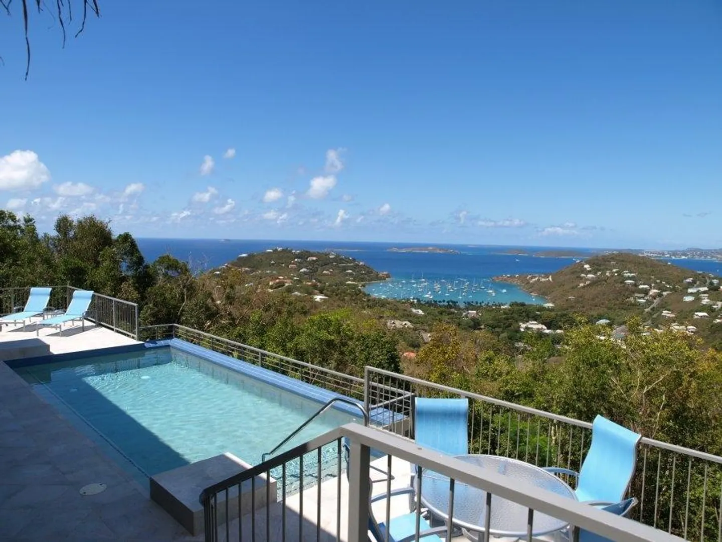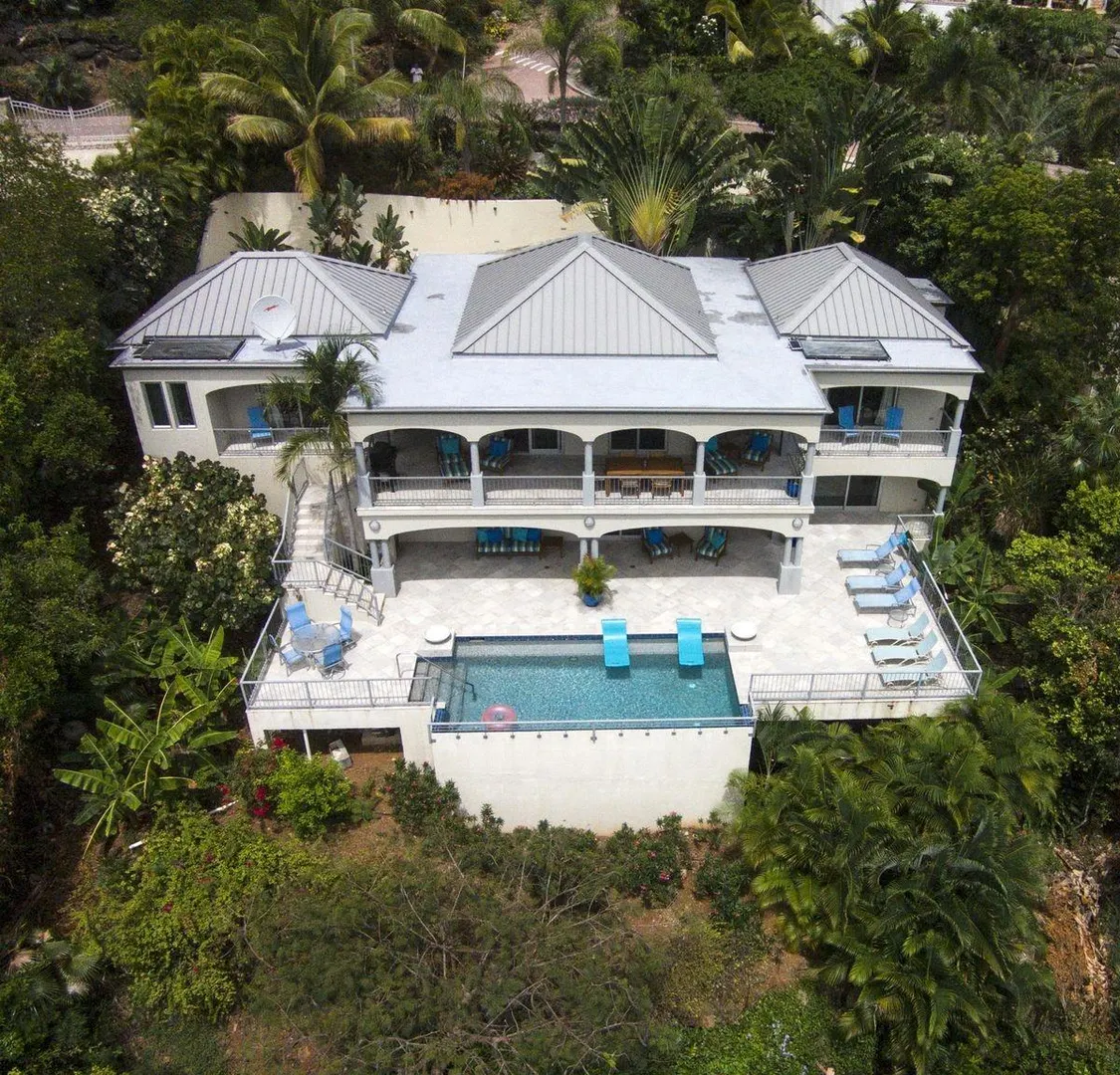 INFINITY is a spectacular villa with a unique blend of West Indian and contemporary architecture designed by local architect, Rob Crane. Situated in the gated community of Virgin Grand Estates, this luxurious home features breathtaking views of St. Thomas and the surrounding islands. The gourmet kitchen offers custom mahogany cabinets, beautiful Silestone counter tops and KitchenAid appliances. Other amenities include exquisite Italian tile floors, stylish furnishings, custom mahogany and glass doors, Fleetwood sliding doors, designer lighting and hardware, and two tasteful one-half baths. All four spacious air-conditioned bedroom suites are accessible from the inside. This successful rental villa offers views from every room as well as colorful sunsets from the inviting 24 ft. pool.