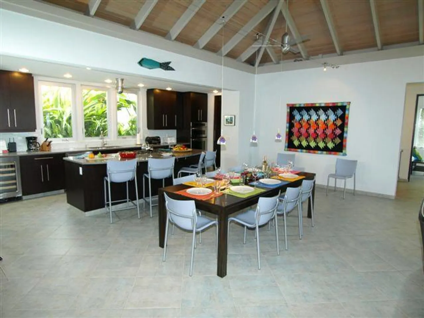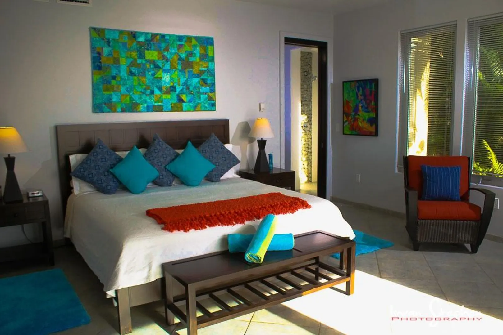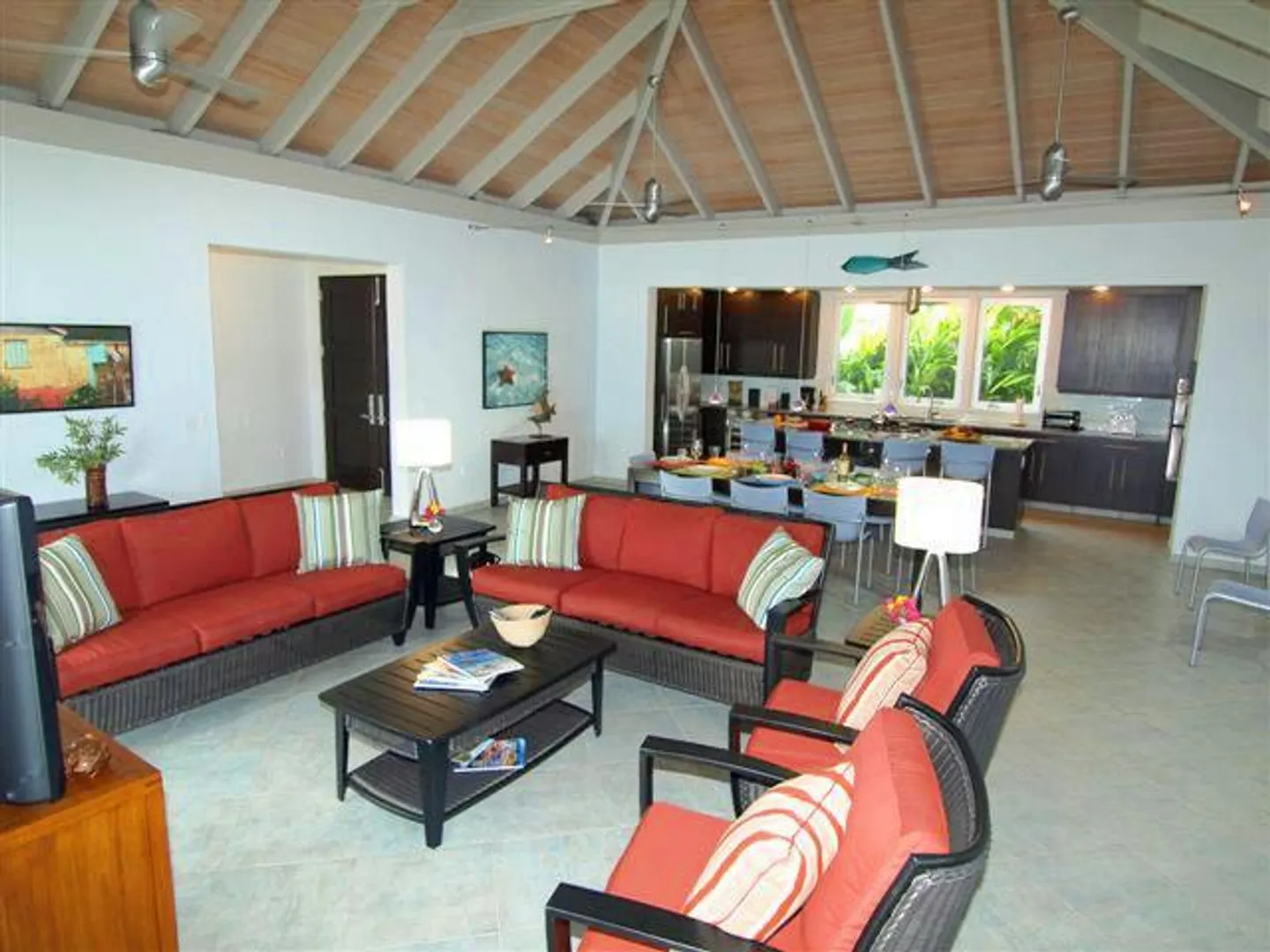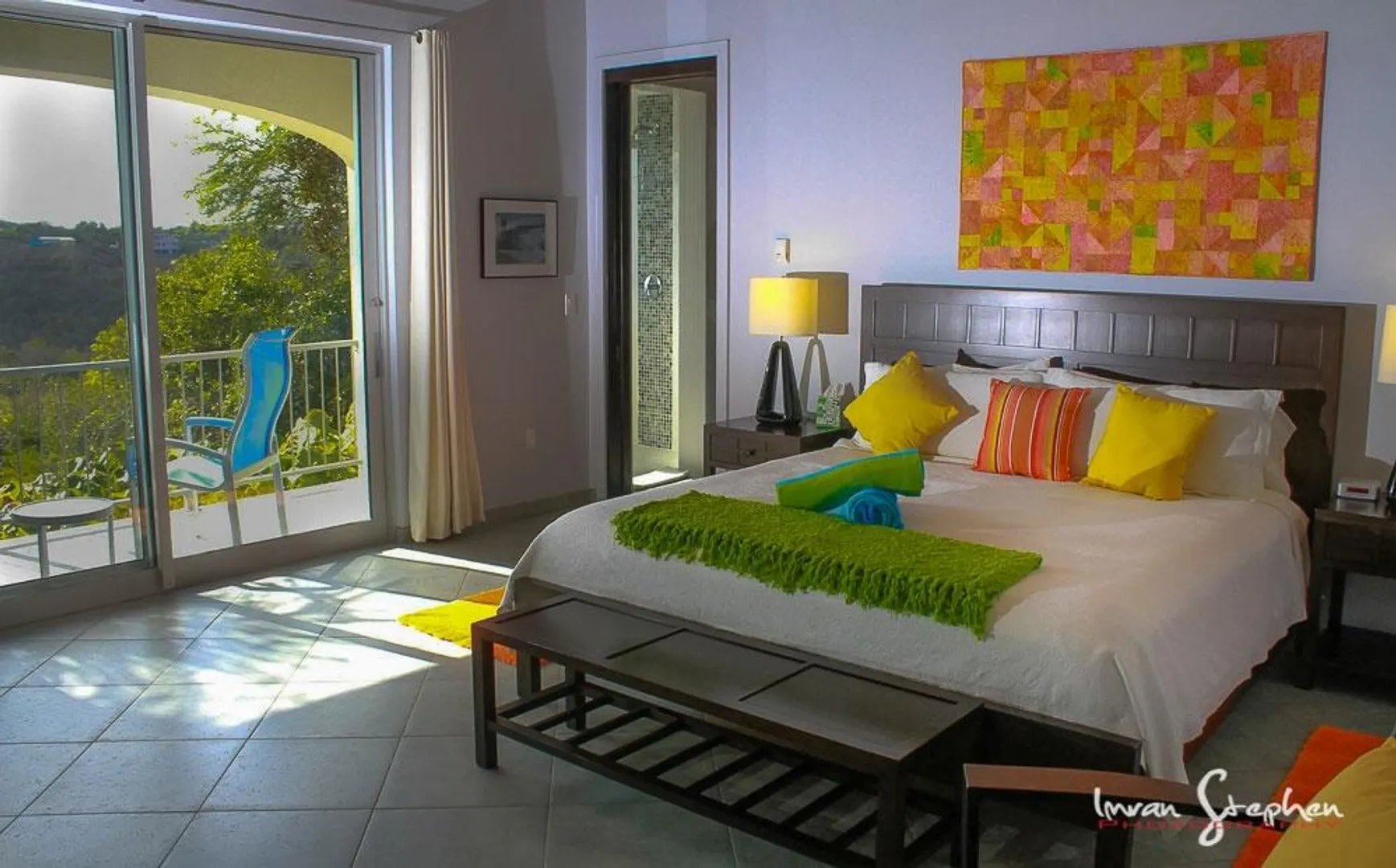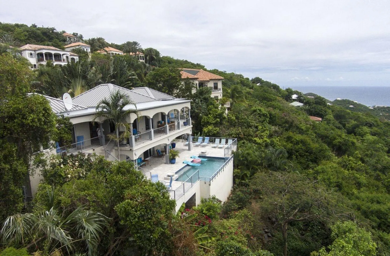 INFINITY is a spectacular villa with a unique blend of West Indian and contemporary architecture designed by local architect, Rob Crane. Situated in the gated community of Virgin Grand Estates, this luxurious home features breathtaking views of St. Thomas and the surrounding islands. The gourmet kitchen offers custom mahogany cabinets, beautiful Silestone counter tops and KitchenAid appliances. Other amenities include exquisite Italian tile floors, stylish furnishings, custom mahogany and glass doors, Fleetwood sliding doors, designer lighting and hardware, and two tasteful one-half baths. All four spacious air-conditioned bedroom suites are accessible from the inside. This successful rental villa offers views from every room as well as colorful sunsets from the inviting 24 ft. pool.