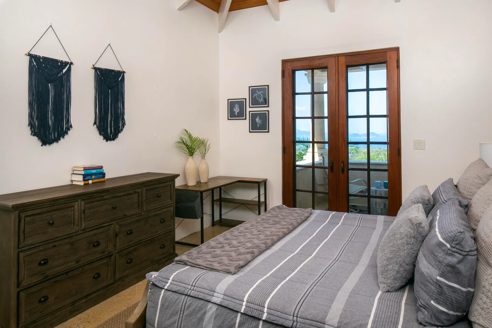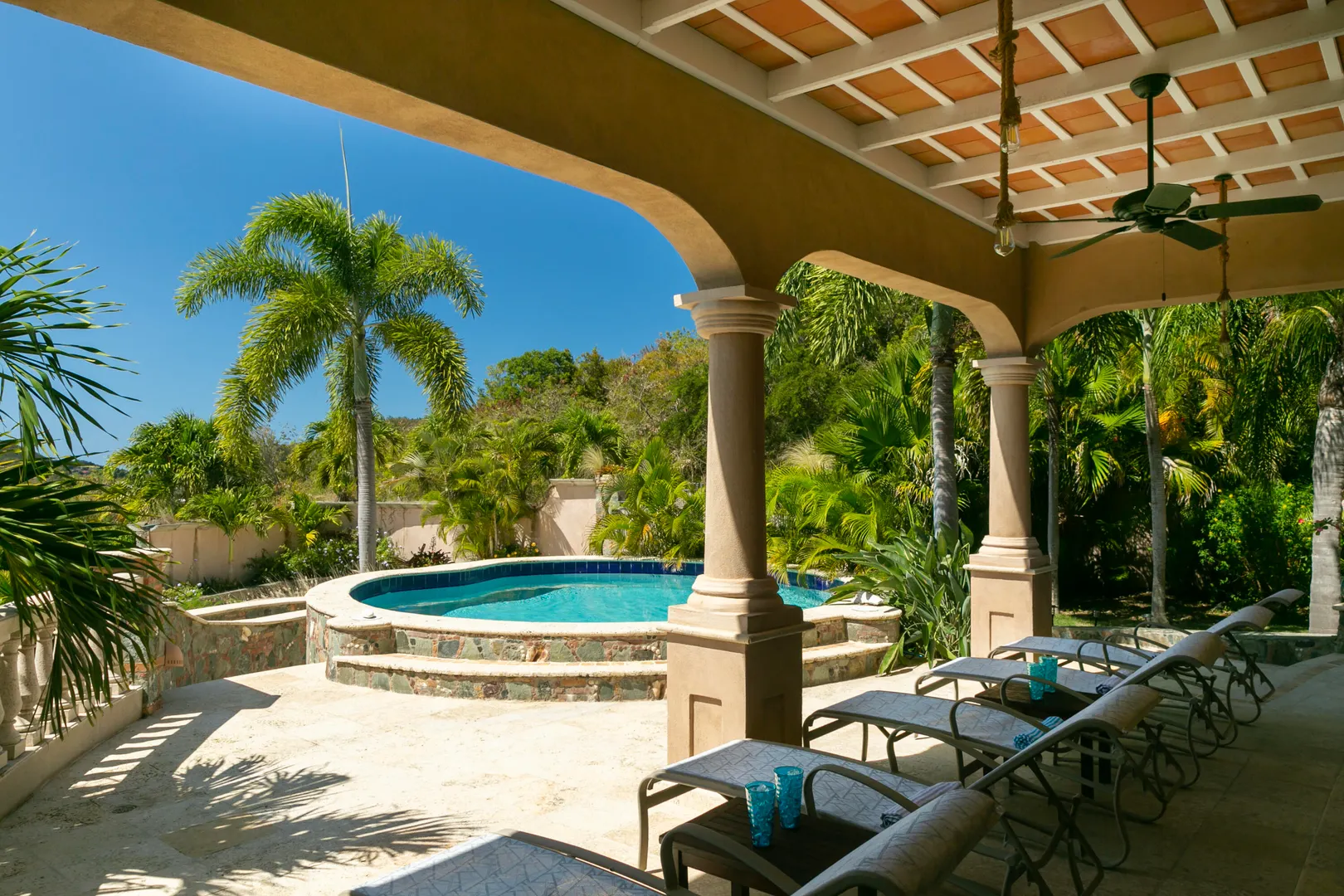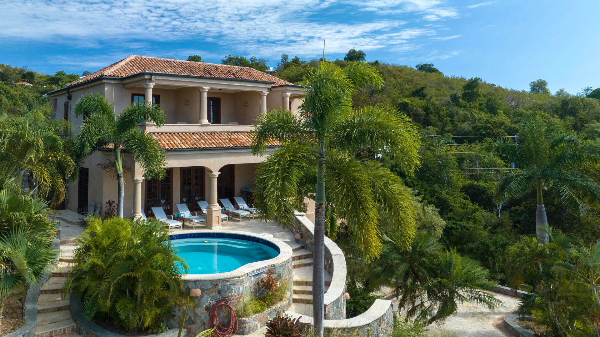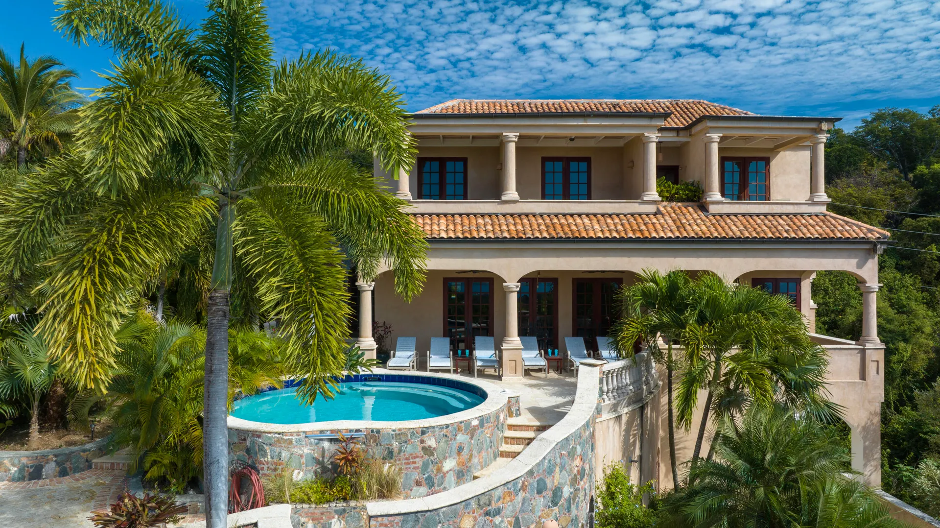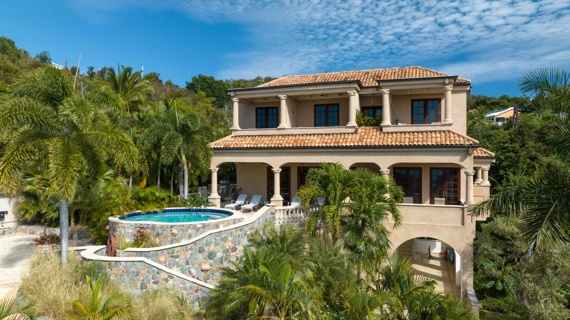 Casa Sonadores, the Dreamers' House, lives up to its name. Set within the gated heights of Virgin Grande Estates and framed by sweeping south-to-west views that capture St. Croix, Pillsbury Sound, and year-round sunsets, this elegantly crafted Michael Oxman villa blends timeless Caribbean design with thoughtful modern upgrades. A private gated entry leads to a gracious courtyard and stonework details that set the tone for the home's quality. Coral stone floors, custom mahogany doors and windows, soaring 12-foot ceilings, and hand-selected architectural finishes run throughout. The main terrace features a round pool and generous outdoor dining. A true Dreamers' House--crafted with vision, enhanced with care, and ready for its next chapter.The residence offers spacious bedroom suites with King beds, private verandas, travertine-and-coral stone baths, and two outdoor showers. Below, a 1,000-sq-ft game and bunk room creates a retreat of its own with TVs, billiard tables, two sets of bunks and arcade gamesideal as an extra space for fun and extra sleeping accommodation.
