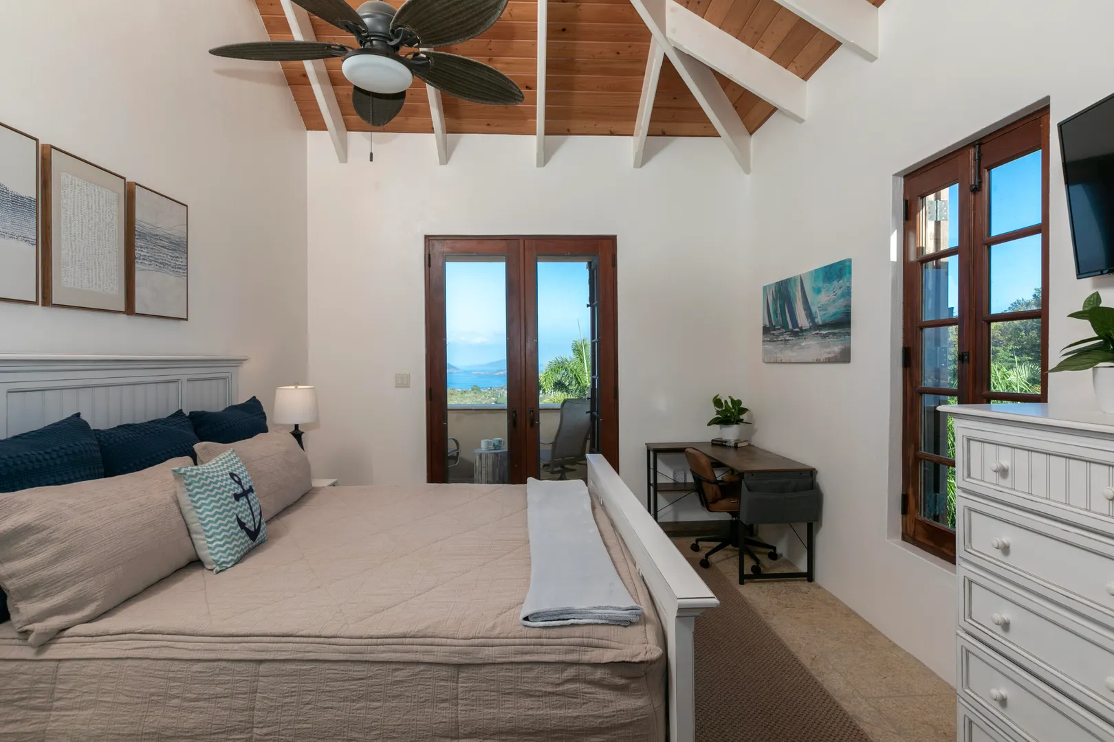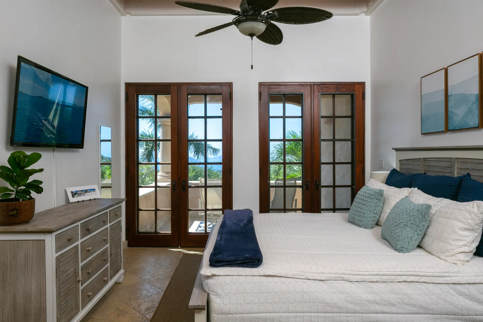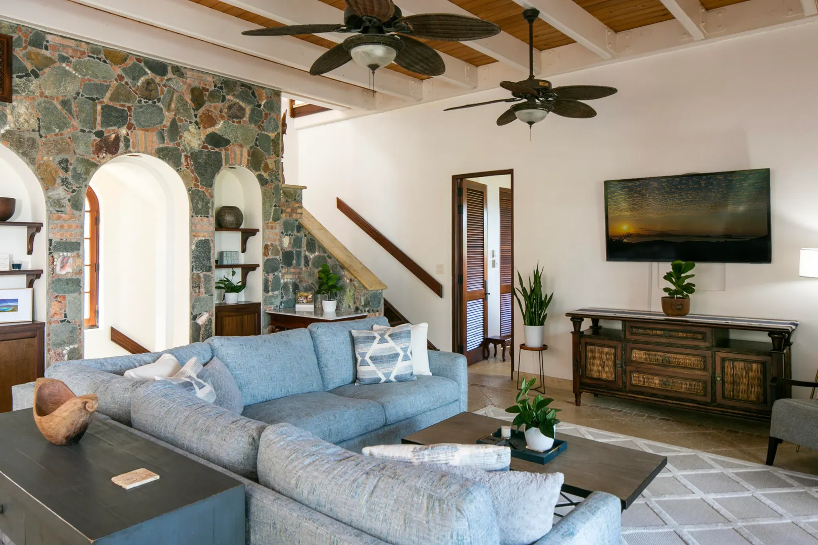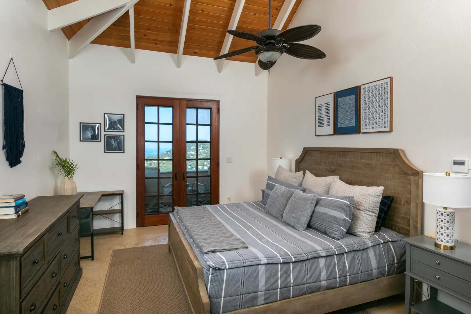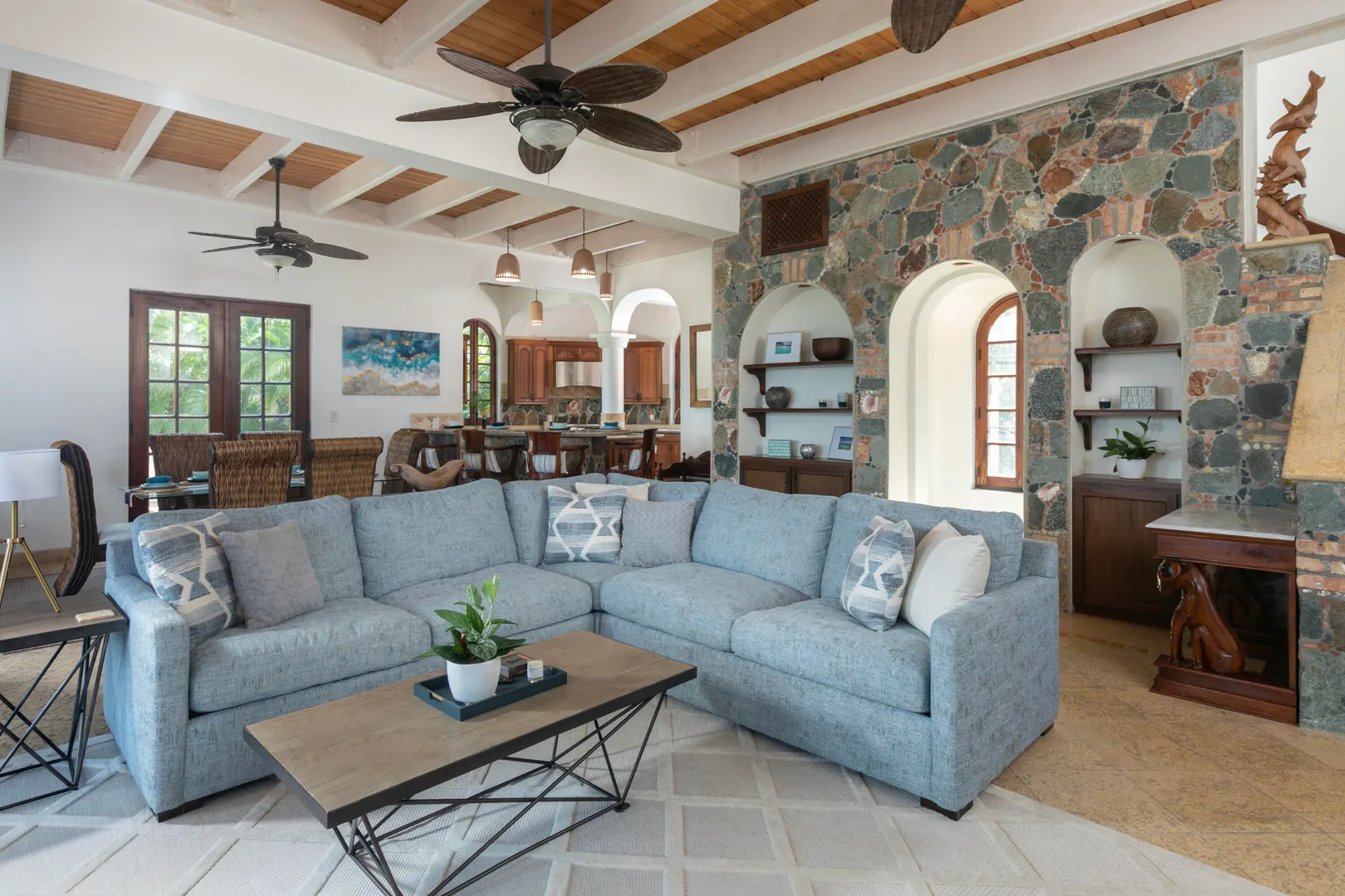 Casa Sonadores, the Dreamers' House, lives up to its name. Set within the gated heights of Virgin Grande Estates and framed by sweeping south-to-west views that capture St. Croix, Pillsbury Sound, and year-round sunsets, this elegantly crafted Michael Oxman villa blends timeless Caribbean design with thoughtful modern upgrades. A private gated entry leads to a gracious courtyard and stonework details that set the tone for the home's quality. Coral stone floors, custom mahogany doors and windows, soaring 12-foot ceilings, and hand-selected architectural finishes run throughout. The main terrace features a round pool and generous outdoor dining. A true Dreamers' House--crafted with vision, enhanced with care, and ready for its next chapter.The residence offers spacious bedroom suites with King beds, private verandas, travertine-and-coral stone baths, and two outdoor showers. Below, a 1,000-sq-ft game and bunk room creates a retreat of its own with TVs, billiard tables, two sets of bunks and arcade gamesideal as an extra space for fun and extra sleeping accommodation.