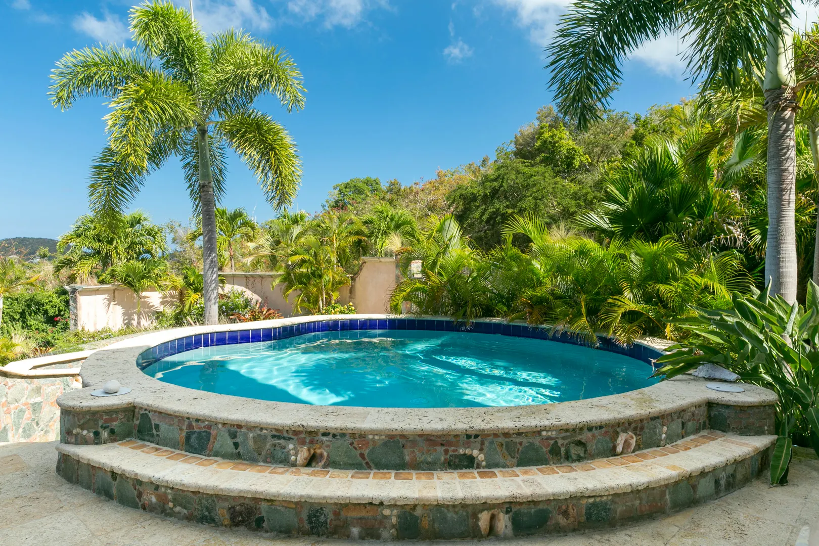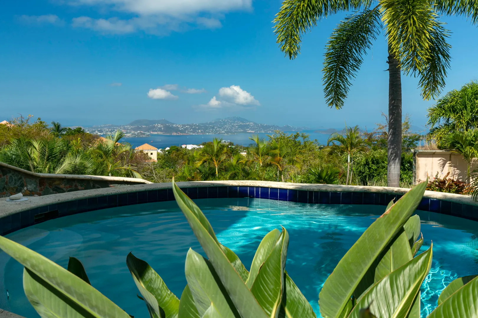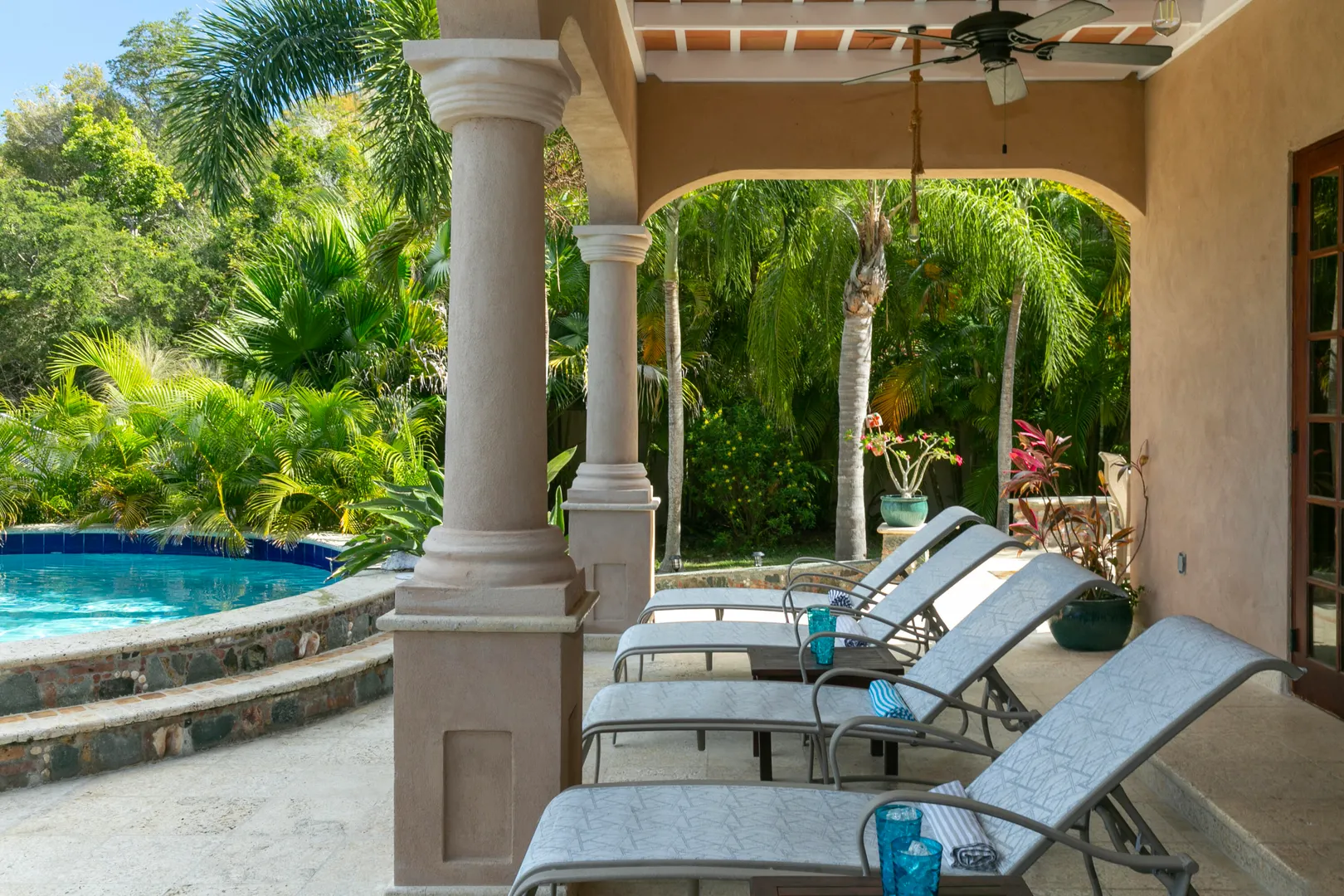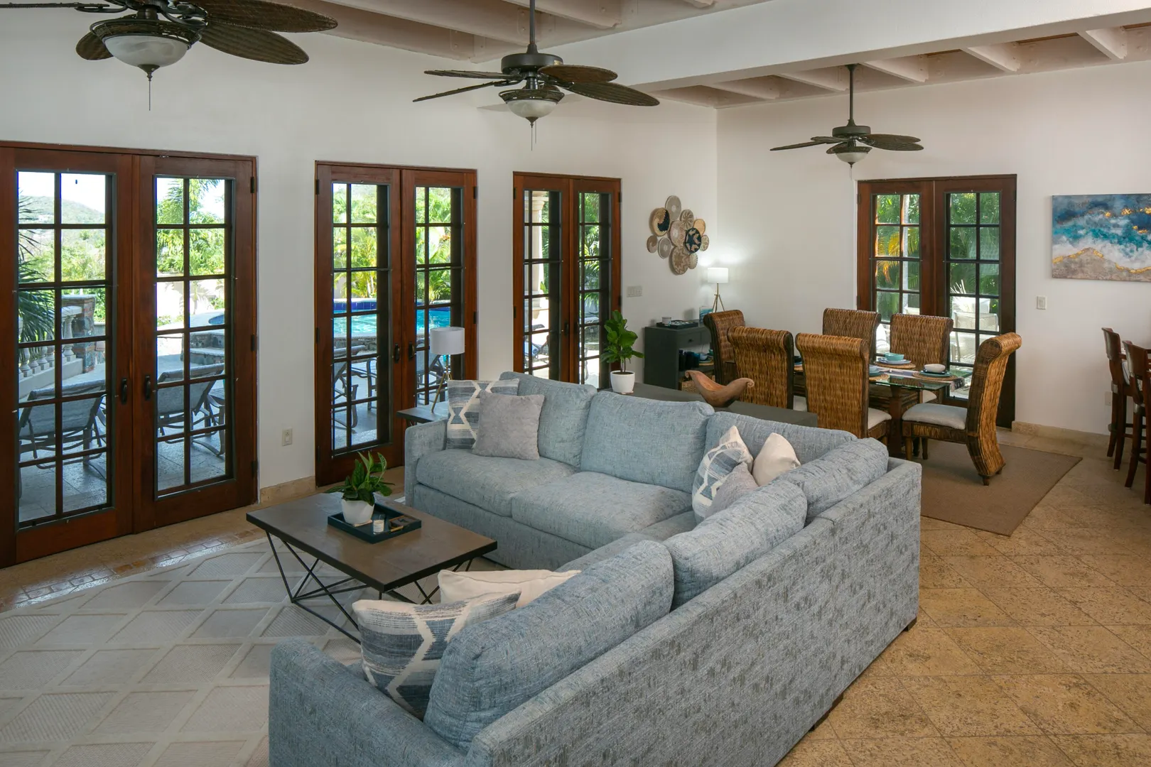 Casa Sonadores, the Dreamers' House, lives up to its name. Set within the gated heights of Virgin Grande Estates and framed by sweeping south-to-west views that capture St. Croix, Pillsbury Sound, and year-round sunsets, this elegantly crafted Michael Oxman villa blends timeless Caribbean design with thoughtful modern upgrades. A private gated entry leads to a gracious courtyard and stonework details that set the tone for the home's quality. Coral stone floors, custom mahogany doors and windows, soaring 12-foot ceilings, and hand-selected architectural finishes run throughout. The main terrace features a round pool and generous outdoor dining. A true Dreamers' House--crafted with vision, enhanced with care, and ready for its next chapter.The residence offers spacious bedroom suites with King beds, private verandas, travertine-and-coral stone baths, and two outdoor showers. Below, a 1,000-sq-ft game and bunk room creates a retreat of its own with TVs, billiard tables, two sets of bunks and arcade gamesideal as an extra space for fun and extra sleeping accommodation.