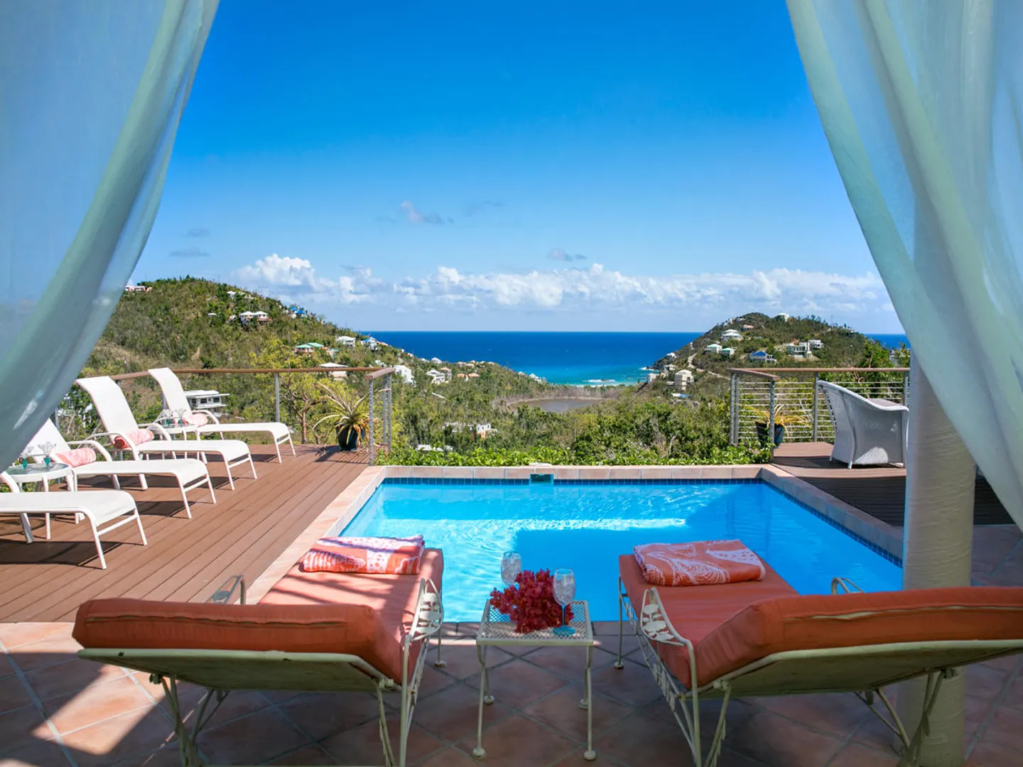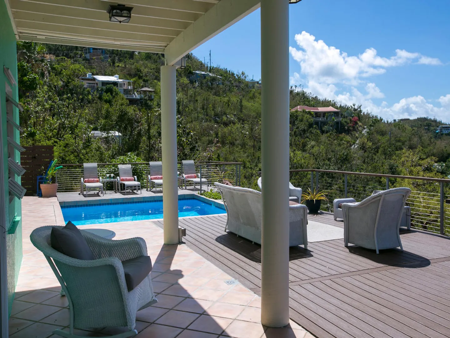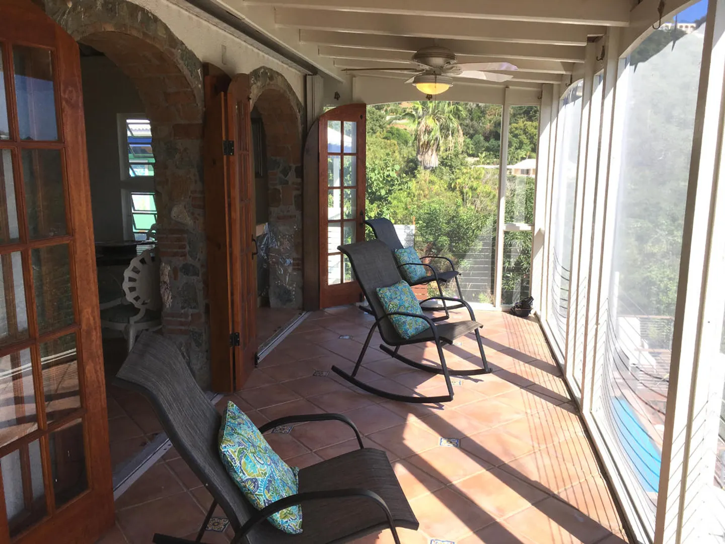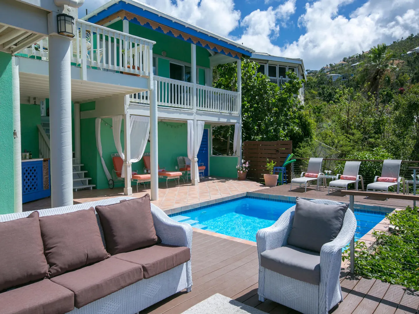 'Caribbean Colors' is a recently renovated all masonry home in upscale Chocolate Hole North. Motivated sellers. Features include a large pool deck, native stone arches, and an interior staircase to lower bedrooms. It faces southeast to catch the tradewind breezes, sun and moon rises and water views of Chocolate Hole, Hart Bay and the South Shore.Just minutes from Cruz Bay and a short walk to the Westin Resort. There are many custom features such as tile floors inlaid with Mexican accent tiles, mahogany trim, hand painted bathroom sinks, and vaulted cypress ceilings. The covered, screened gallery is wonderfully cool and breezy. Other features include brand new custom kitchen, professional colorful landscaping, fruit trees, fire pit and storm shutters.