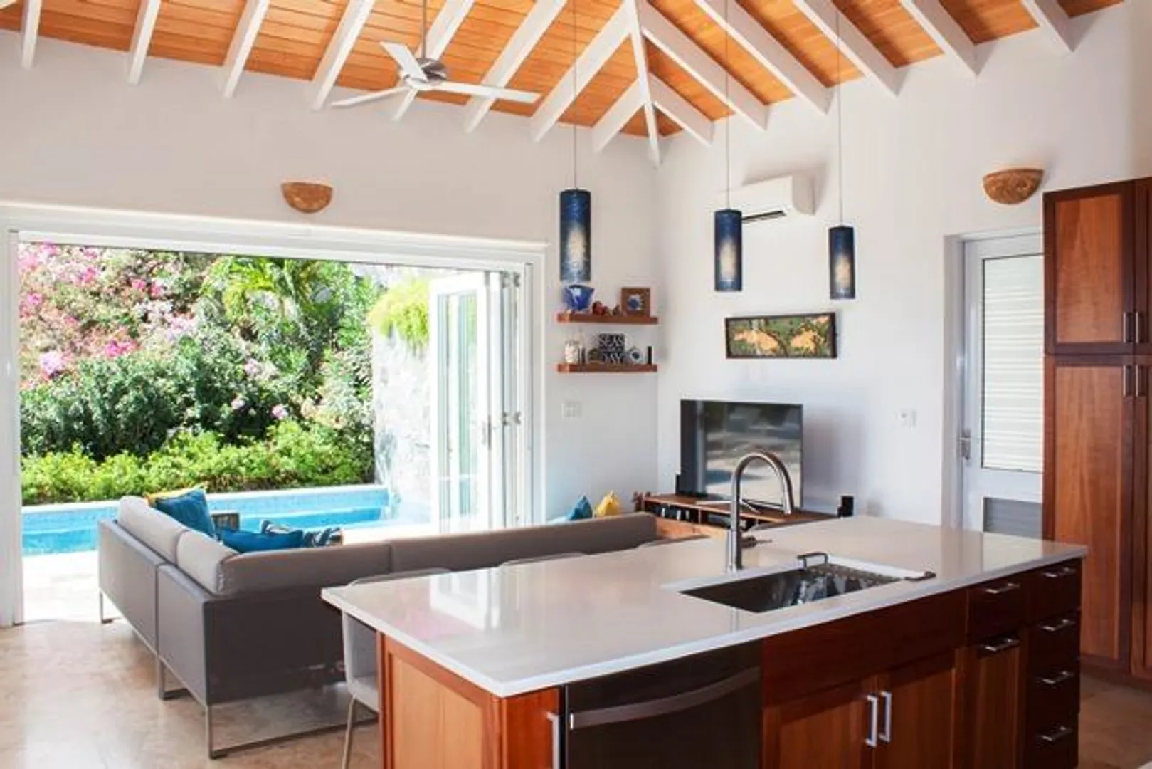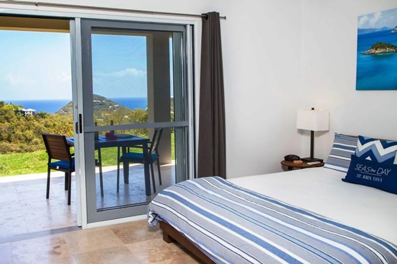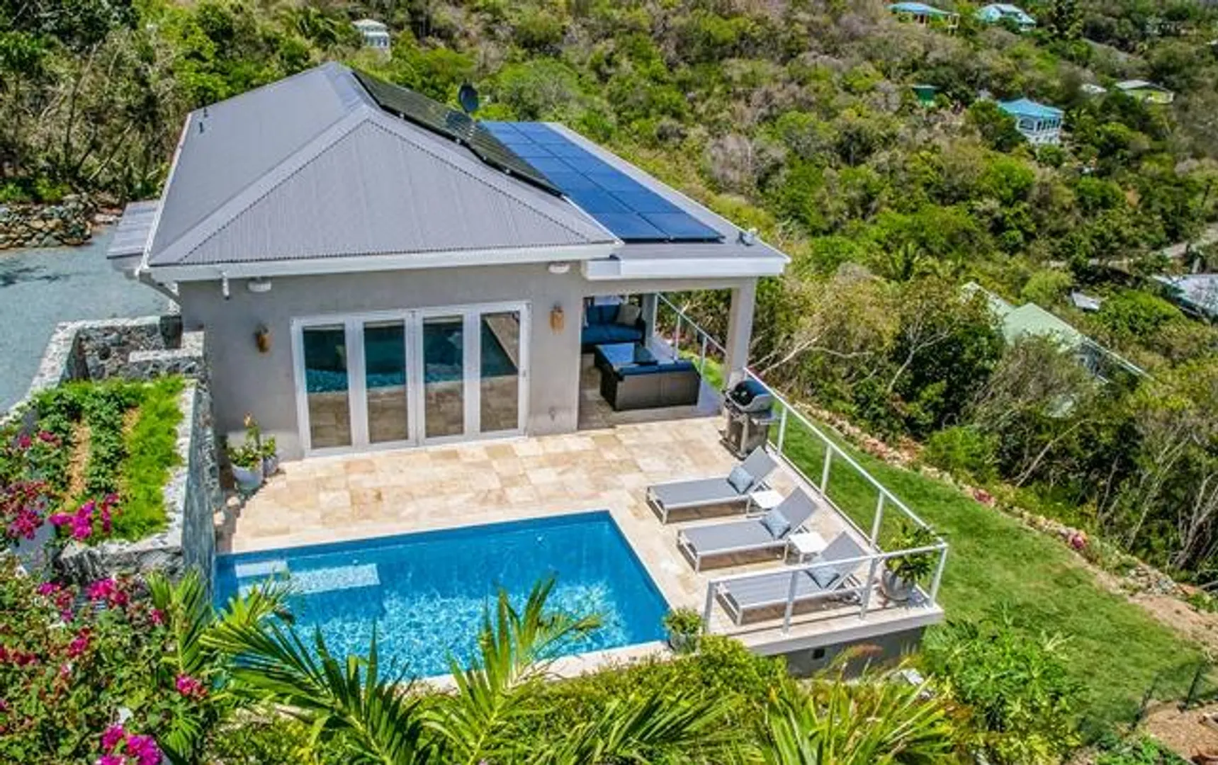 Completed in 2015, Seas the Day is a three bedroom, three bath pool villa sited on a beautifully landscaped grassy knoll in North Chocolate Hole. This villa's sleek contemporary design with multi-folding doors and rollaway screens highlights a seamless flow from indoor to outdoor living. The open layout ensures that from each fully air conditioned room you enjoy beautiful views over the Caribbean Sea out to St. Croix. Featuring high end finishes of Travertine tiled floors, Caesarstone quartz countertops and custom mahogany cabinetry, this tastefully furnished home is also highly energy efficient. Its Solar PV system with battery backup ensures you will never have power interruption and will see zero to low monthly power bills. The villa is a well known, income producing short term rental. Additional items of note include; pool heater, UV water filtration, cistern level monitoring, impact glass doors and windows and custom designed hurricane shuttering/screening system.