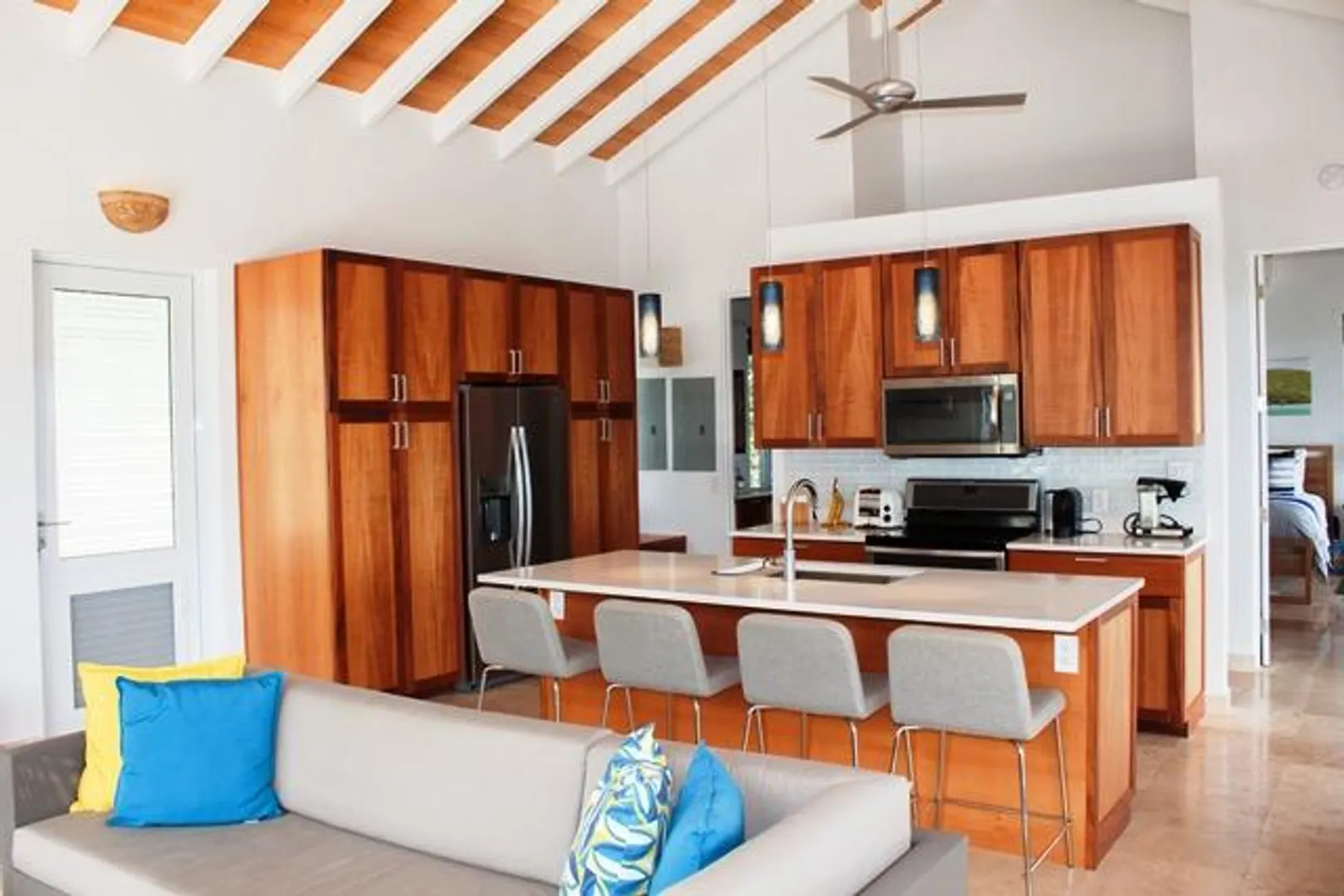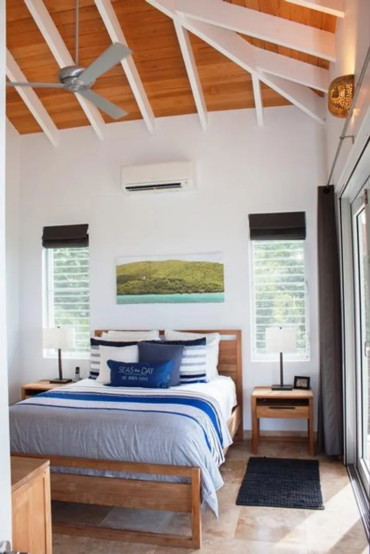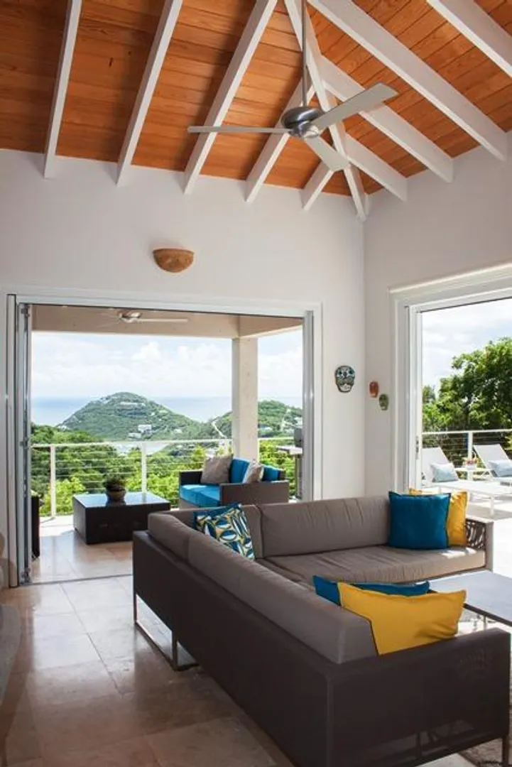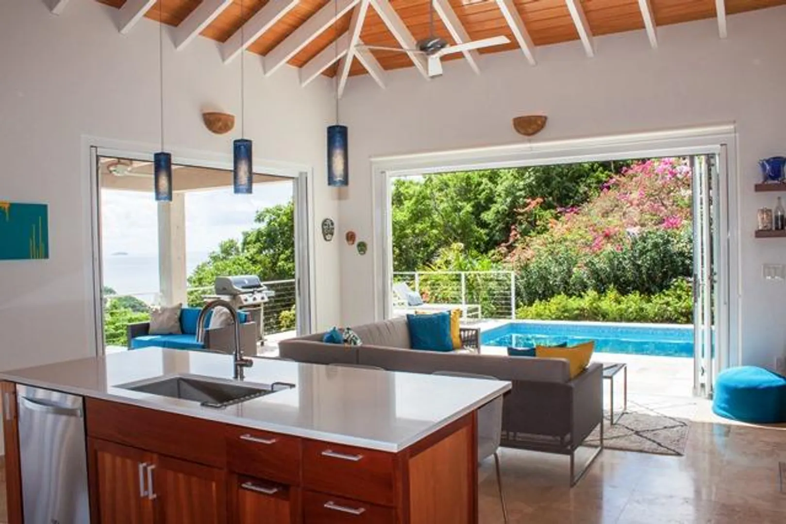 Completed in 2015, Seas the Day is a three bedroom, three bath pool villa sited on a beautifully landscaped grassy knoll in North Chocolate Hole. This villa's sleek contemporary design with multi-folding doors and rollaway screens highlights a seamless flow from indoor to outdoor living. The open layout ensures that from each fully air conditioned room you enjoy beautiful views over the Caribbean Sea out to St. Croix. Featuring high end finishes of Travertine tiled floors, Caesarstone quartz countertops and custom mahogany cabinetry, this tastefully furnished home is also highly energy efficient. Its Solar PV system with battery backup ensures you will never have power interruption and will see zero to low monthly power bills. The villa is a well known, income producing short term rental. Additional items of note include; pool heater, UV water filtration, cistern level monitoring, impact glass doors and windows and custom designed hurricane shuttering/screening system.