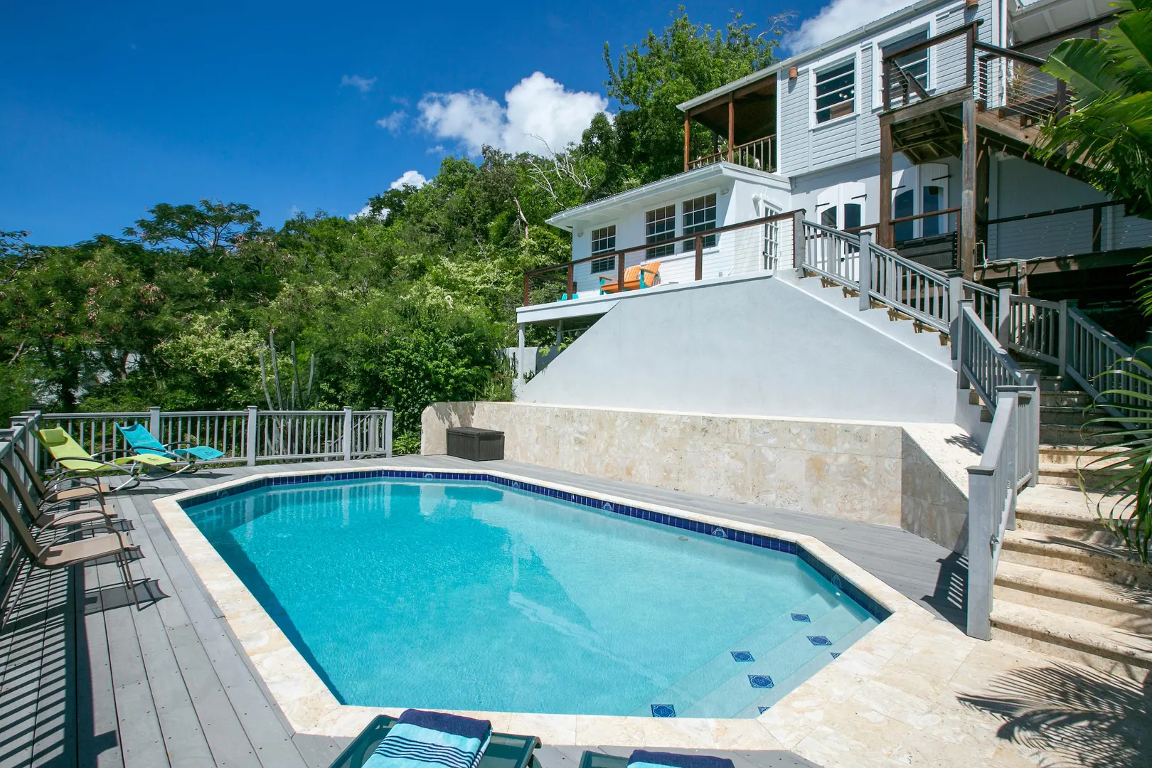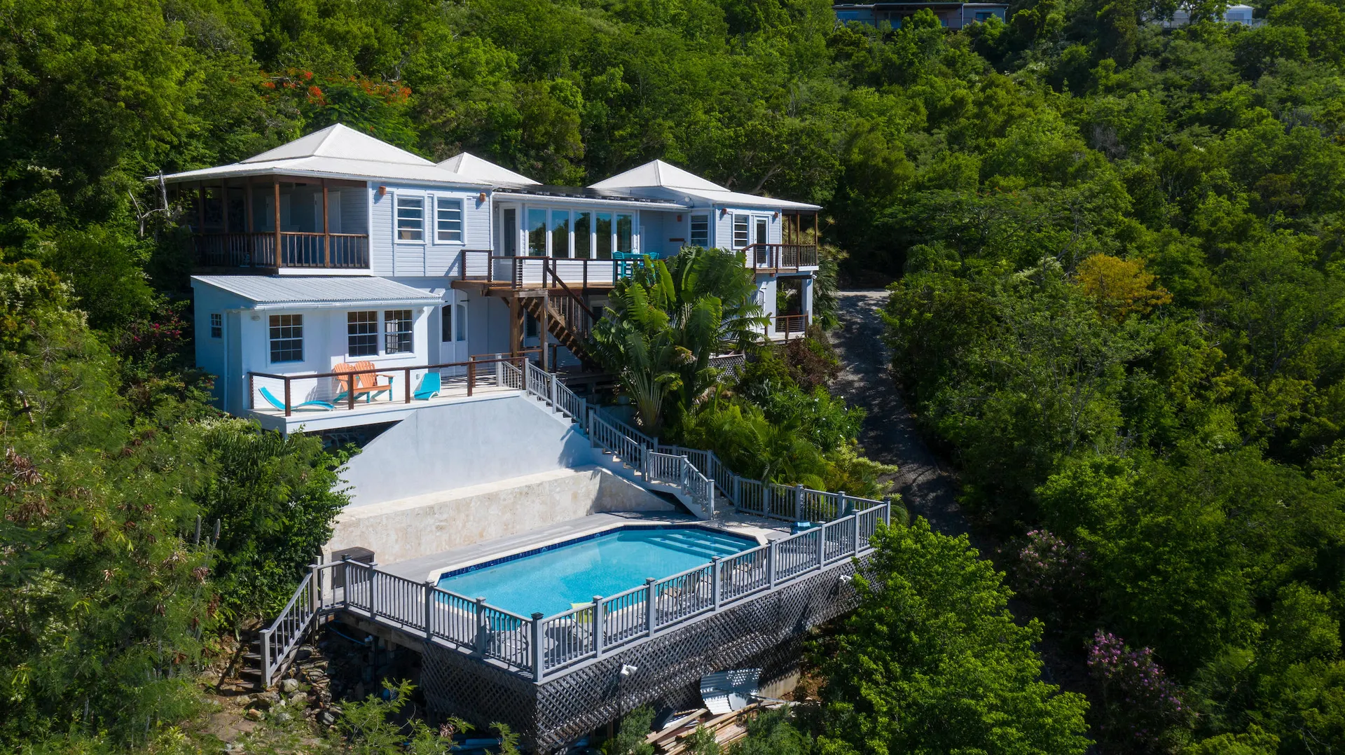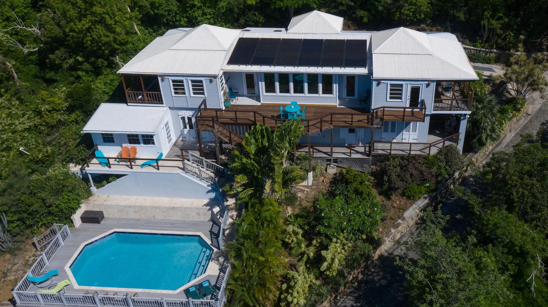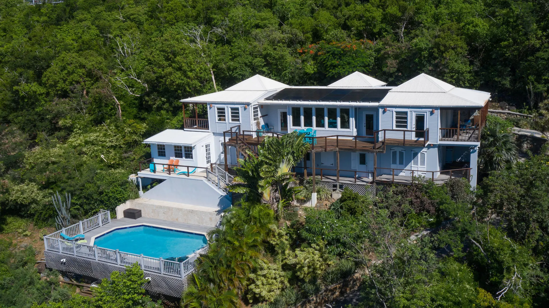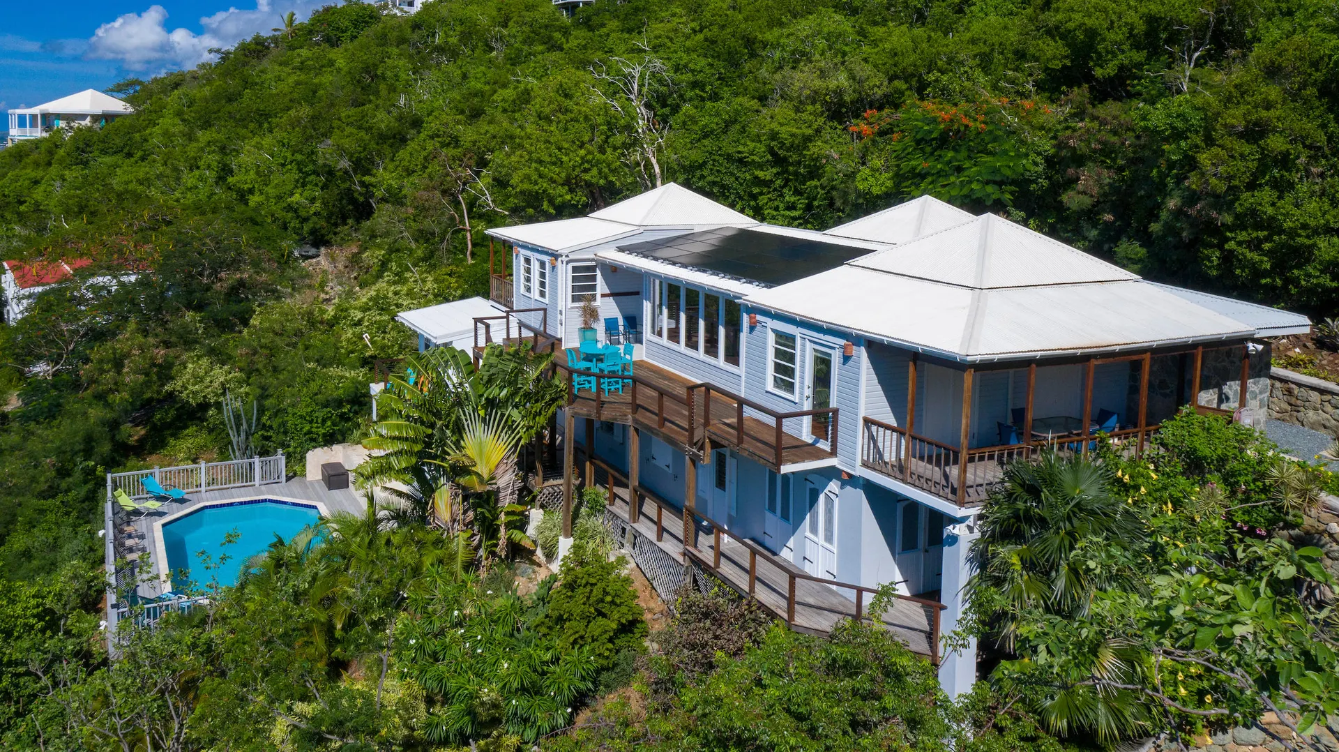 Newly renovated, fully air conditioned tropical hardwood and masonry home located in Chocolate Hole North on a private end of road site. Amenities inclue a large pool surrounded by lush landscaping, Solar power with 2 Tesla walls for backup, and expansive private and common area decks and patios. The large, bright new kitchen with eat-in bar overlooks a sunken living/dining area. Three very private bedrooms with baths en-suite plus caretaker's studio unit and 5th bedroom (currently used as owner storage). Just minutes from Cruz Bay, this location is ideal for an island home or as short term rental. New furnishings throughout complete the package.