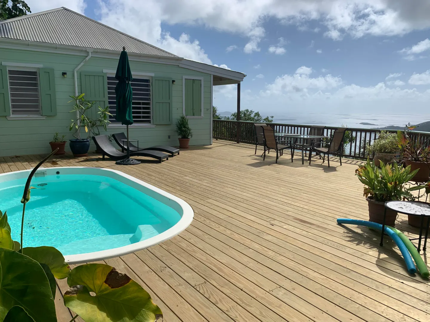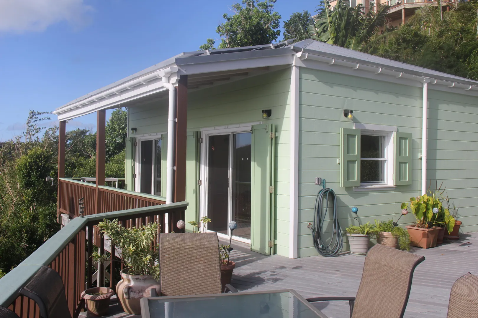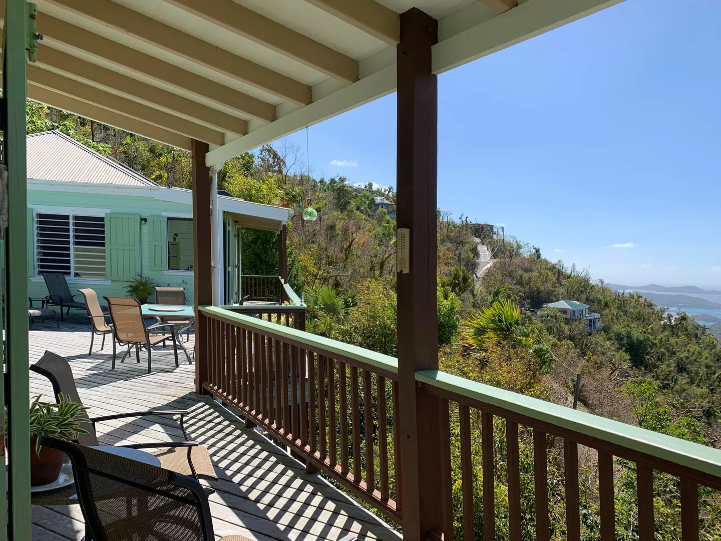 Caribbean style home in a lush, private setting with breath-taking ocean and mountain views. Located high on Ajax Peak just a short drive to Coral Bay or the famed National Park beaches. This wood frame withstood two Cat5 hurricanes perfectly; with full hurricane shutters, solar net metering and a Tesla Powerwall that provides backup power within seconds of an outage. Layout consists of a main living area and building with two bedrooms on one level joined together by a pool and NEW deck. The lower level is a gracious guest bedroom suite and a large workshop area that could be converted to additional living space, a bedroom or a garage. Sunflower villa is the perfect turn key package...short term rental, solar, excellent location, views & pool!!