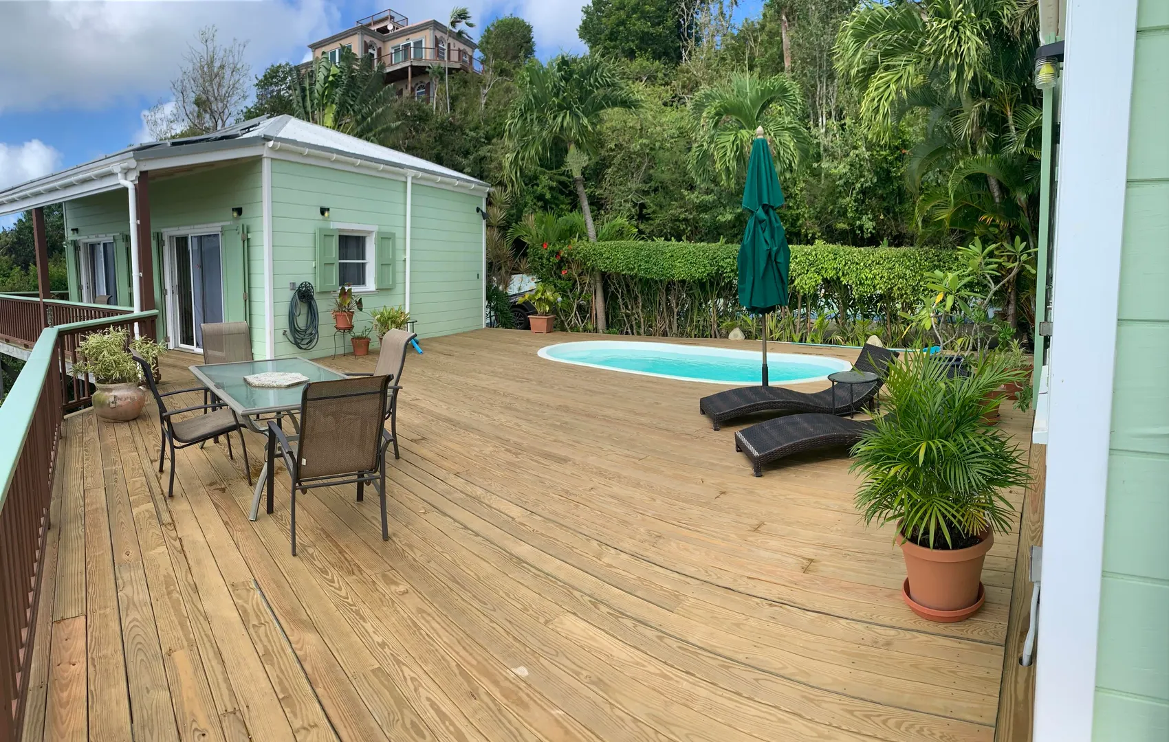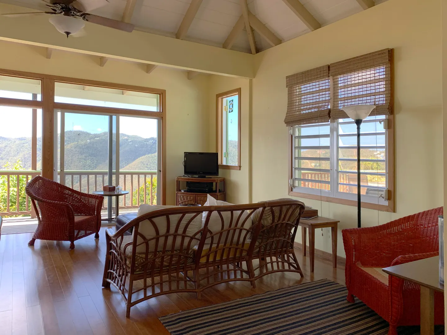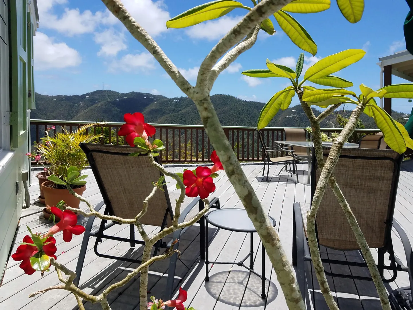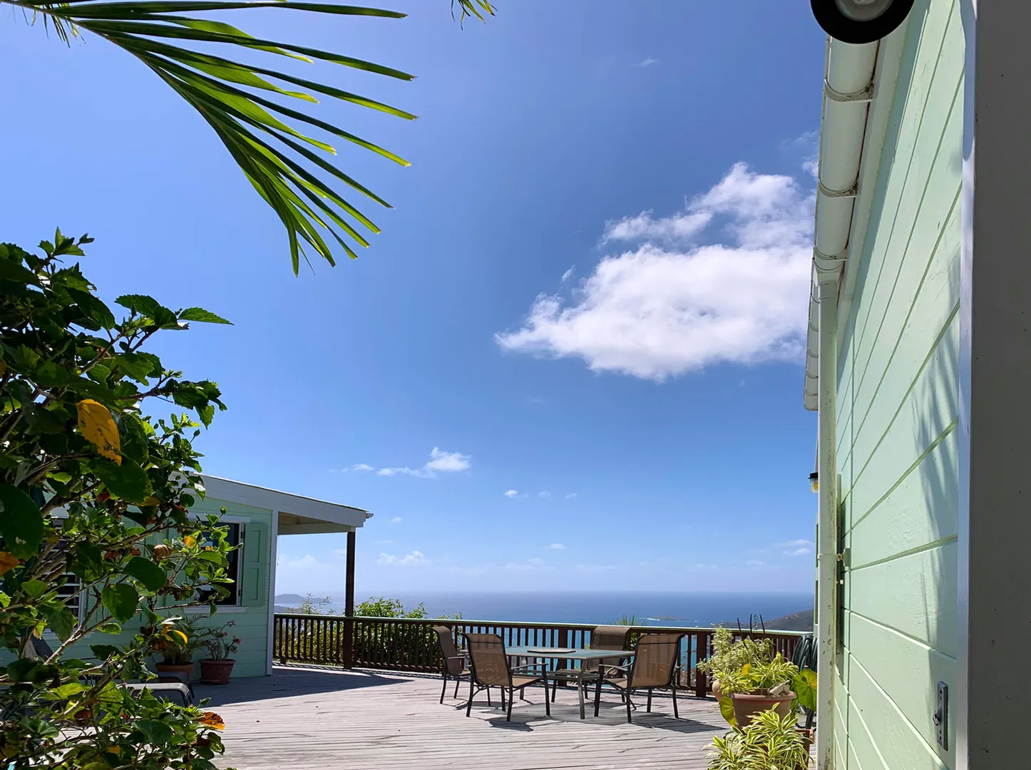 Caribbean style home in a lush, private setting with breath-taking ocean and mountain views. Located high on Ajax Peak just a short drive to Coral Bay or the famed National Park beaches. This wood frame withstood two Cat5 hurricanes perfectly; with full hurricane shutters, solar net metering and a Tesla Powerwall that provides backup power within seconds of an outage. Layout consists of a main living area and building with two bedrooms on one level joined together by a pool and NEW deck. The lower level is a gracious guest bedroom suite and a large workshop area that could be converted to additional living space, a bedroom or a garage. Sunflower villa is the perfect turn key package...short term rental, solar, excellent location, views & pool!!