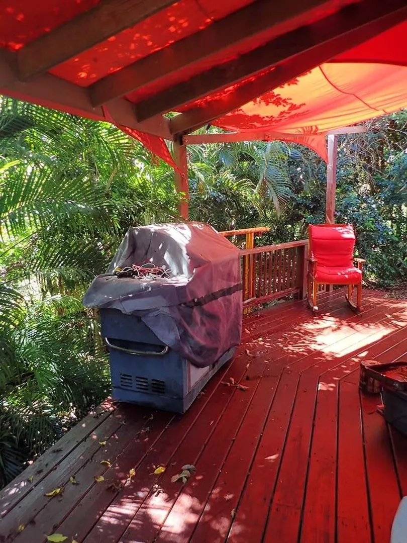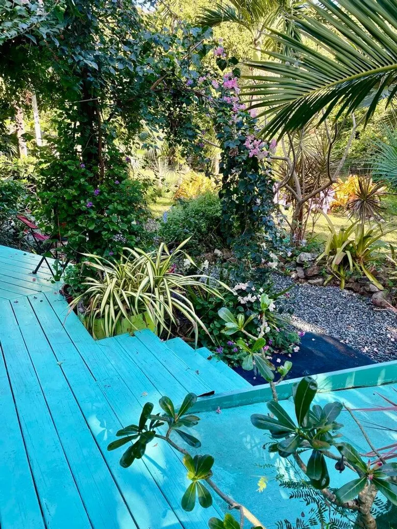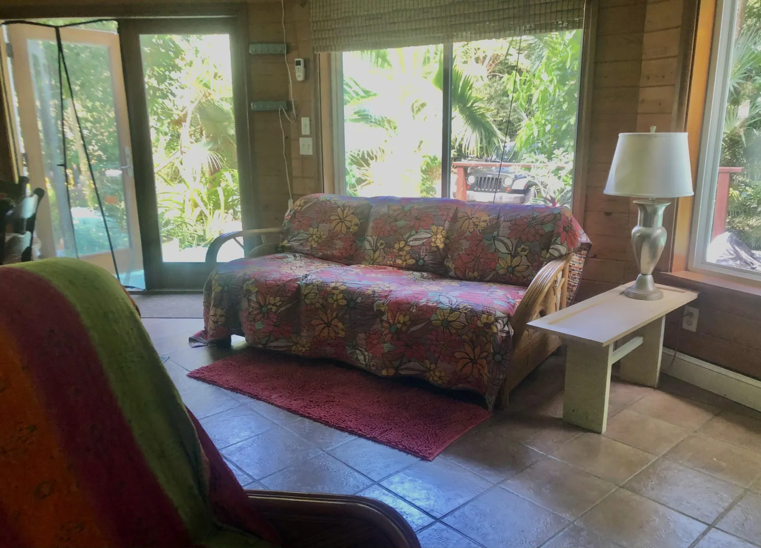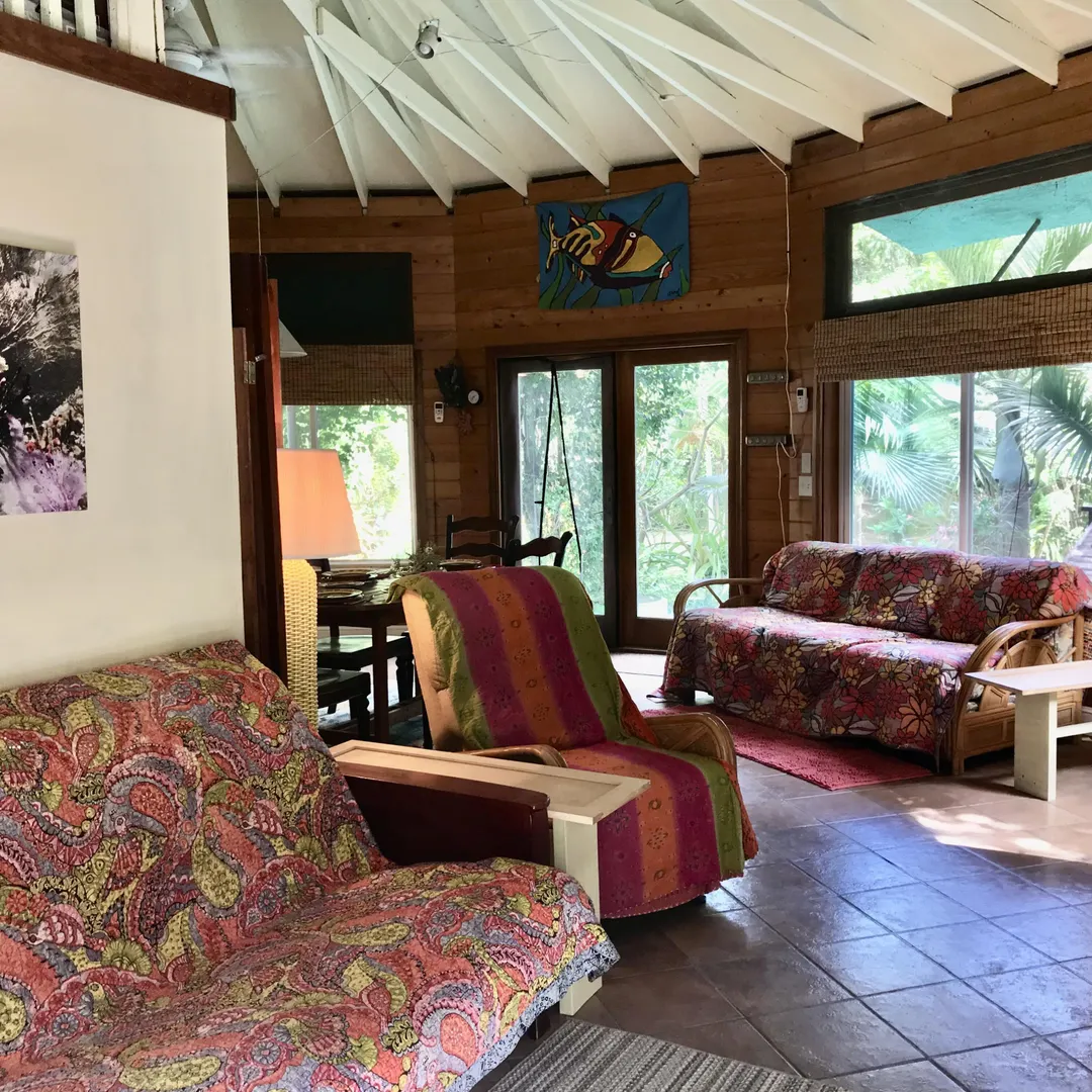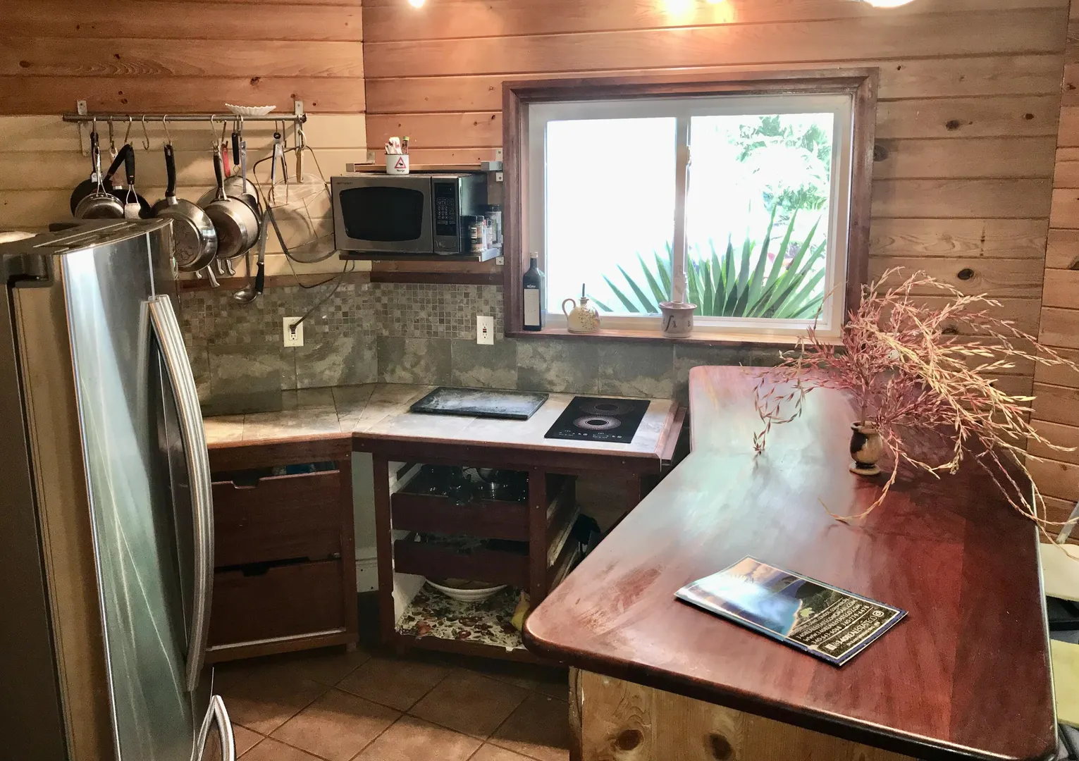 Gardeners Oasis! Flat lot with mature fruit trees and plantings with room for another small home and/or pool. Home has a certificate of occupancy and permanent power. Deltec home with deck surround. Another bedroom could be easily added, mahogany wood panels available to screen area for second bedroom. Deltec homes have flexibility because interior partition walls are non load bearing. Paved driveway to the front door allows for easy access and disability access. There is a concrete slab for a hot tub/spa off the deck. Small shed has electricity and serves as an artist's studio. Outside living space with decks wrap around most of the home.Kitchen Island is movable and can be refigured to accommodate a full range in the kitchen.Aqua clear waste treatment used on plants rated for 3 BR house