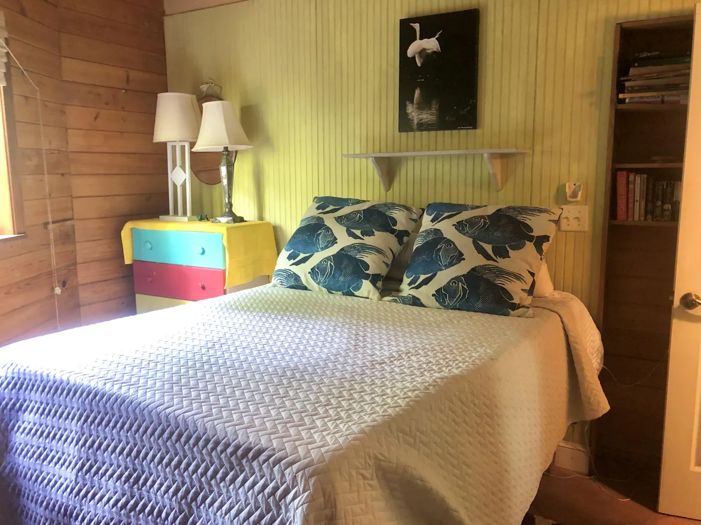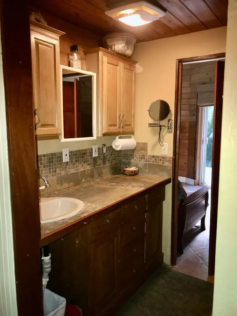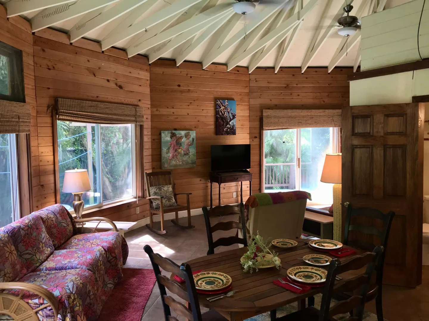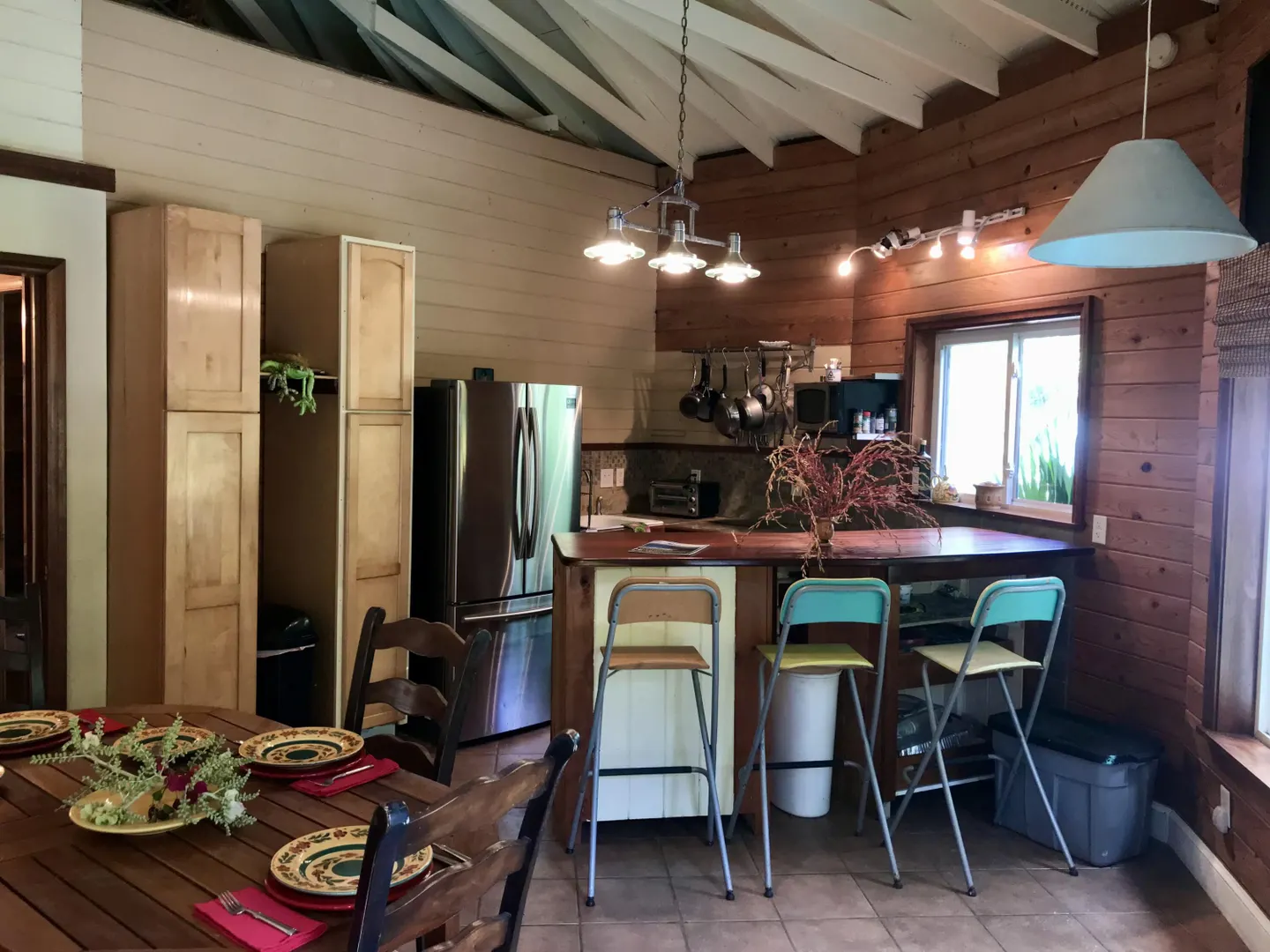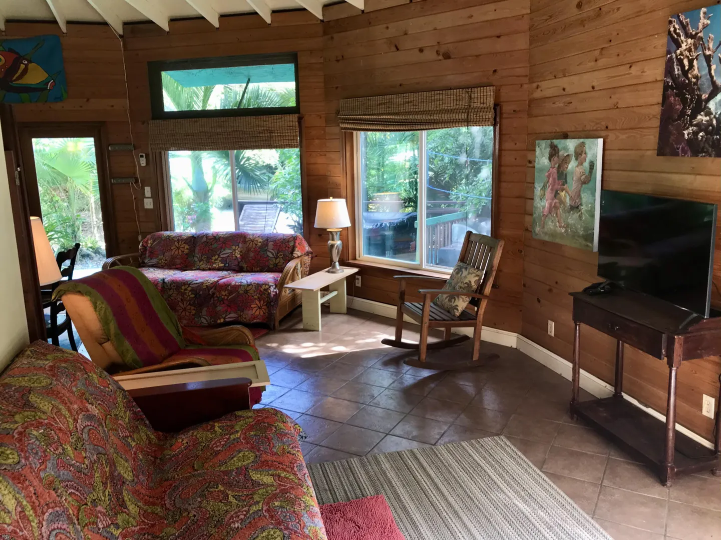 Gardeners Oasis! Flat lot with mature fruit trees and plantings with room for another small home and/or pool. Home has a certificate of occupancy and permanent power. Deltec home with deck surround. Another bedroom could be easily added, mahogany wood panels available to screen area for second bedroom. Deltec homes have flexibility because interior partition walls are non load bearing. Paved driveway to the front door allows for easy access and disability access. There is a concrete slab for a hot tub/spa off the deck. Small shed has electricity and serves as an artist's studio. Outside living space with decks wrap around most of the home.Kitchen Island is movable and can be refigured to accommodate a full range in the kitchen.Aqua clear waste treatment used on plants rated for 3 BR house
