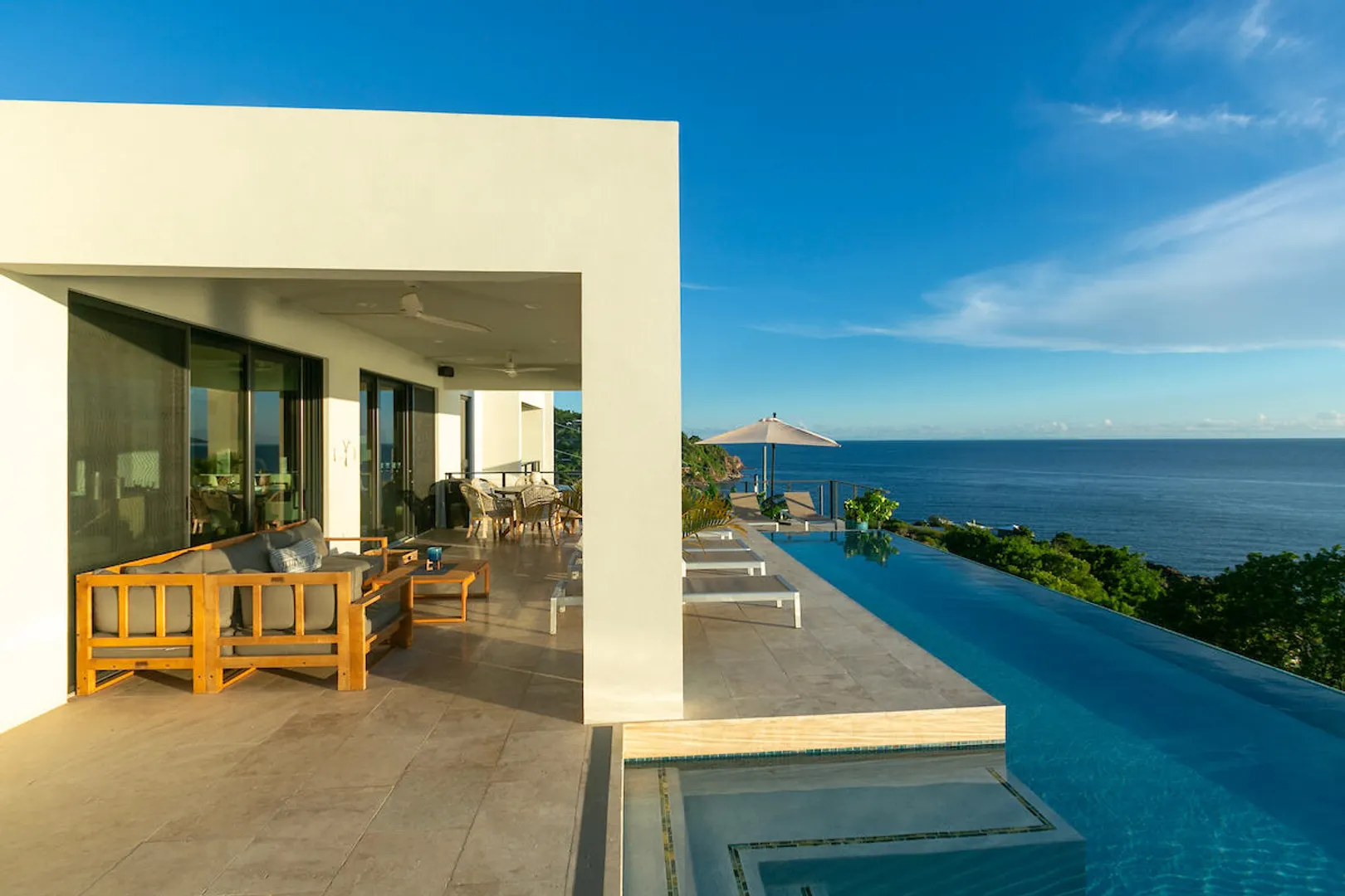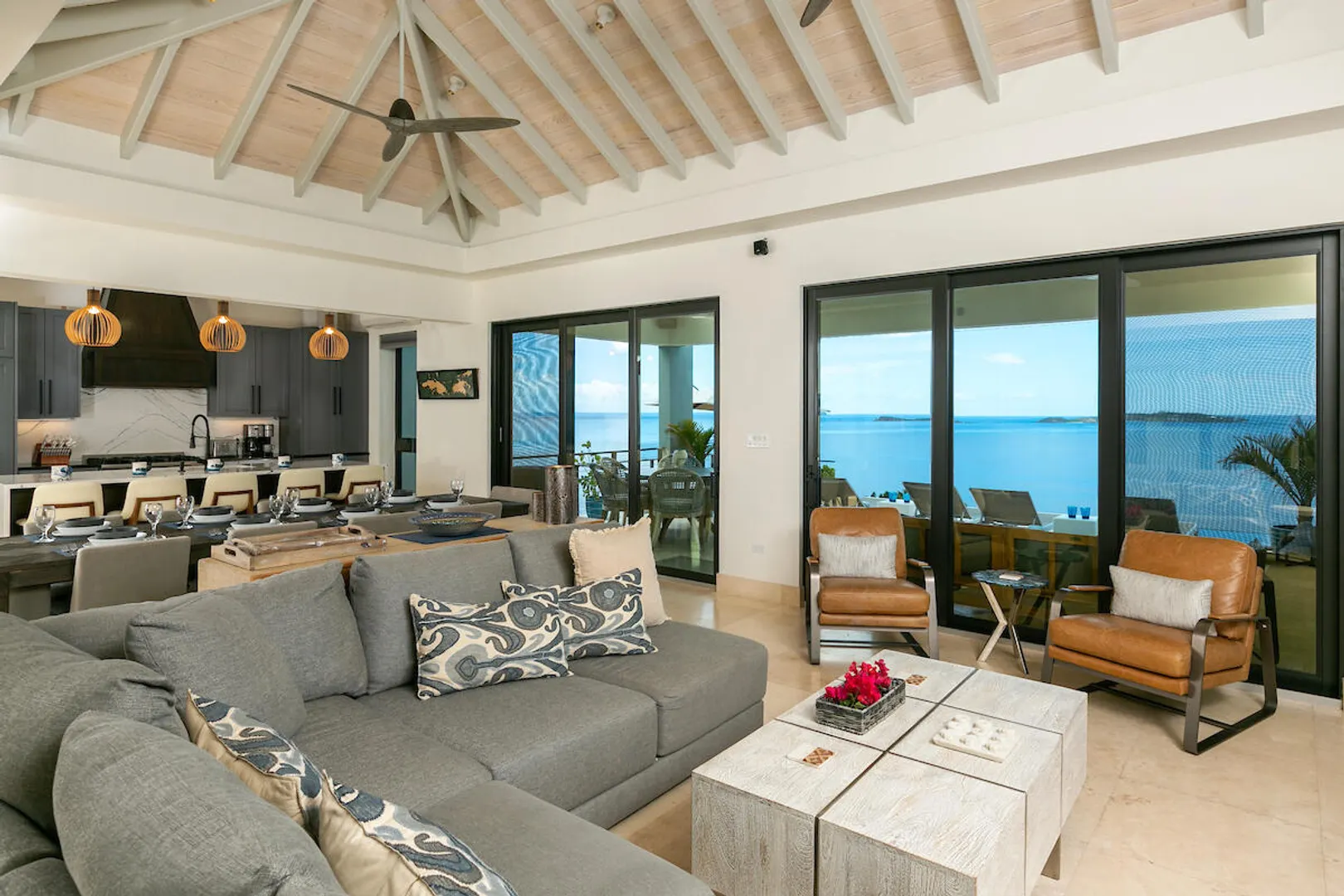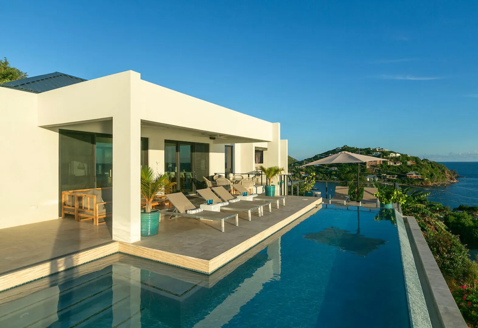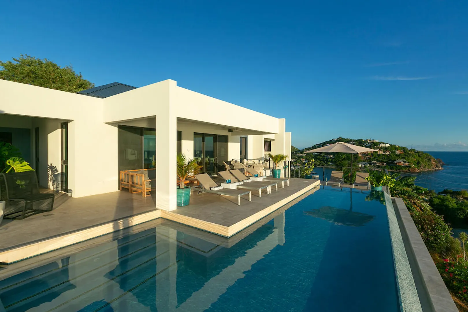 Welcome to Gaia's Pearl, St John's premier modern villa with exceptional short-term rental income and a proven track record of success. This five-bedroom estate is just minutes from Cruz Bay, featuring sleek architecture designed to capture the trade wind breezes and frame unobstructed views over Pillsbury Sound. Every detail was carefully selected to create an upscale Caribbean experience, from the chef's kitchen and spacious indoor living area to the 45-foot infinity pool that overlooks year-round sunsets. Each of the five king suites has a private balcony with sweeping sea views. Energy efficient with a 32-panel solar array and battery backup, Gaia's Pearl is both a luxurious retreat and a smart investment.