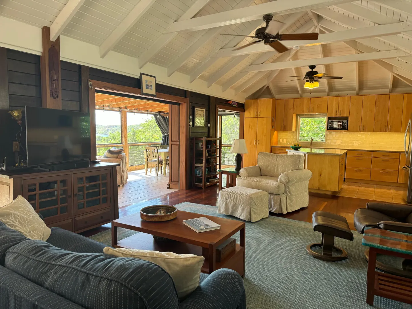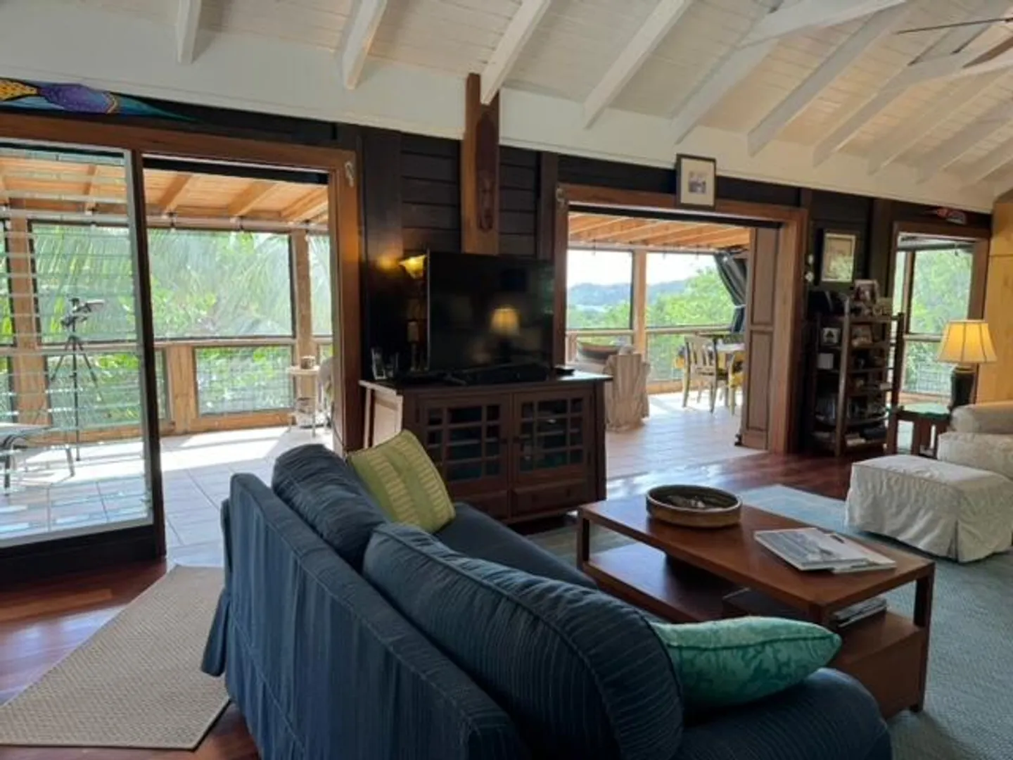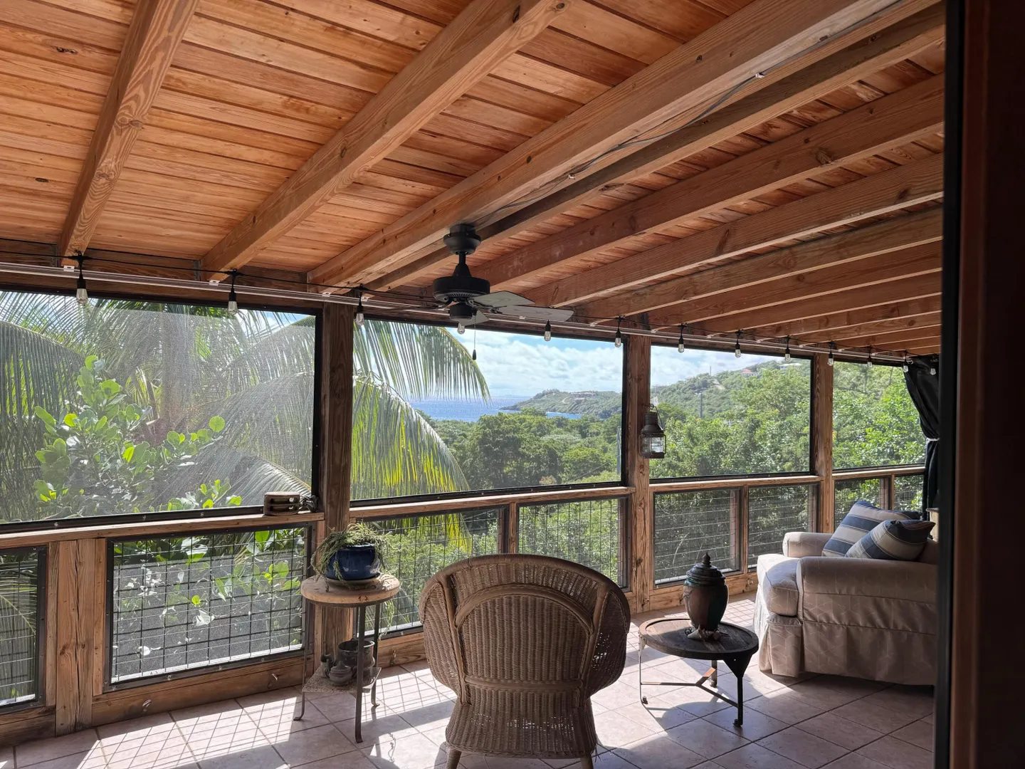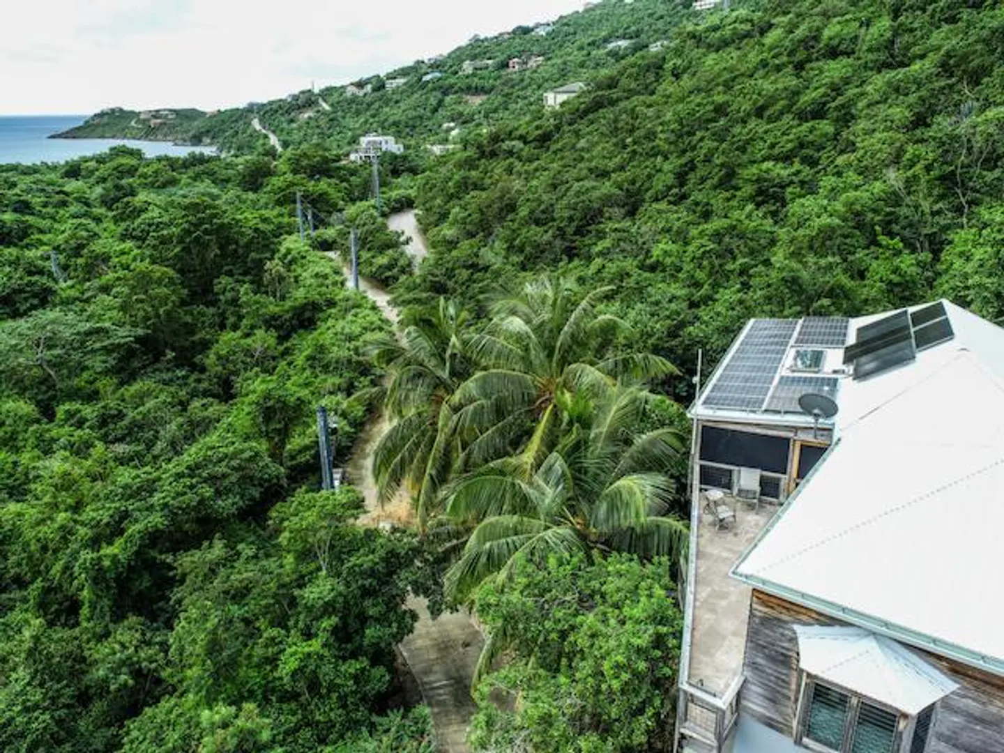 Nestled in the tranquil setting of Fish Bay, sitting above preserved green space with ocean view & gentle breezes. this beautifully renovated home features exotic tropical hardwoods, Jatoba exterior doors, Brazilian cherry hardwood flooring, & Purple Heart T &G walls in the great room. Primary suite includes travertine floors, Santa Maria T&G with manchichi rafter & eucalyptus cabinetry. Custom cabinetry through out. Kitchen remodeled in 2017, stainless steel appliances & quartz countertops. Lower level features 2nd bedroom, 1/2 bath, laundry room & work shop. 21 solar panels with net metering, want to go off the grid, all you need is battery back up. 25000K diesel generator. AC in primary suite. SimpliSafe security system. Armor Screen Hurricane system. UV whole water filtration system