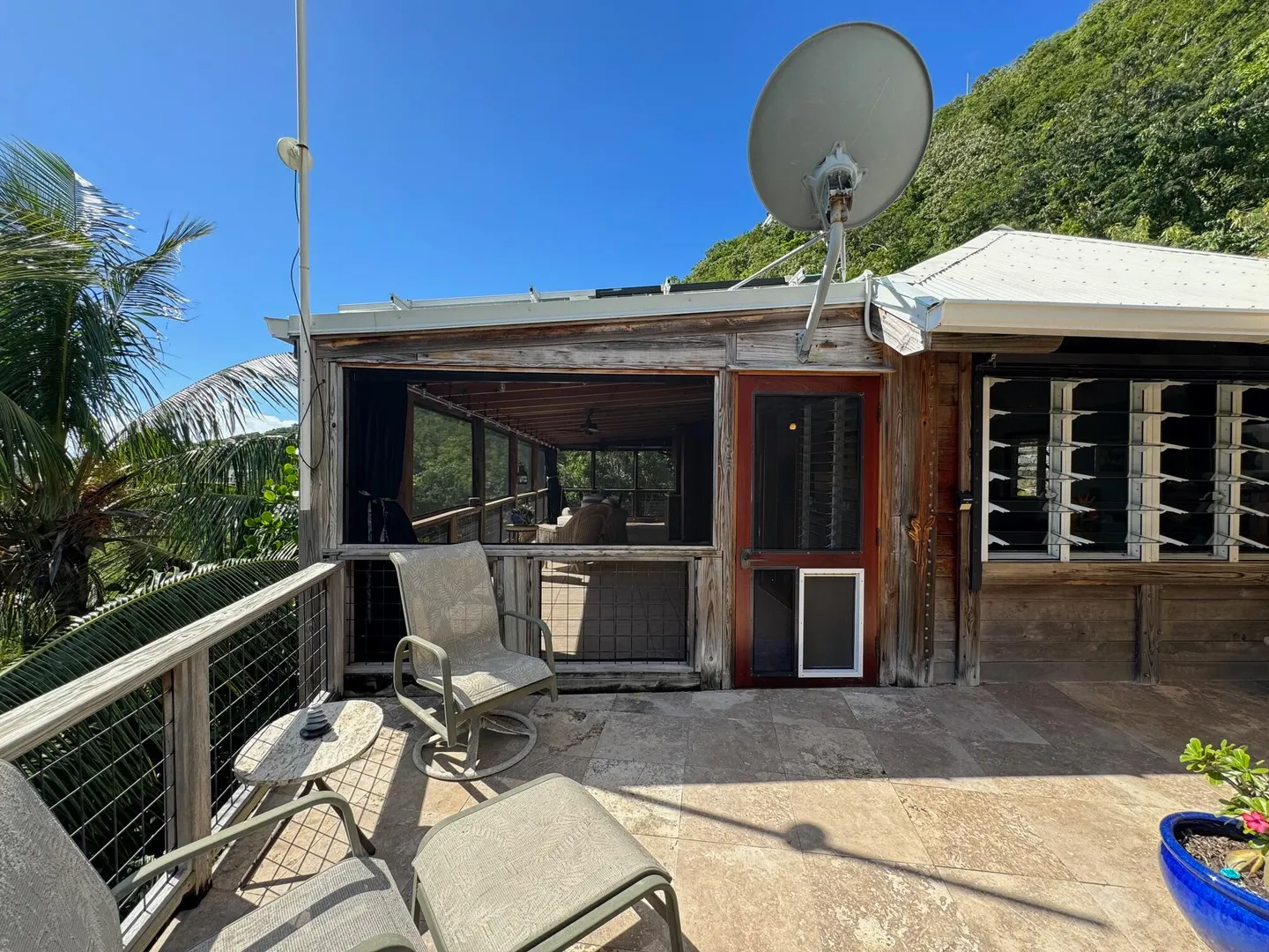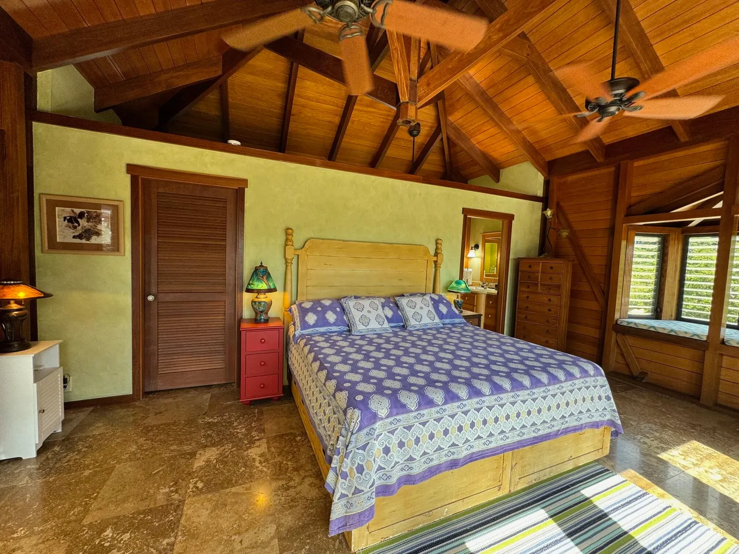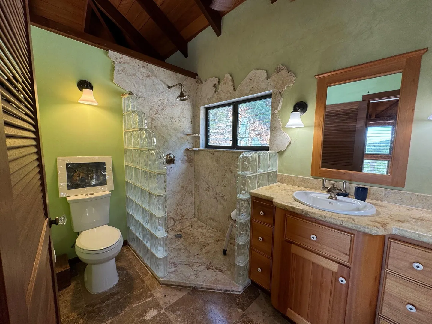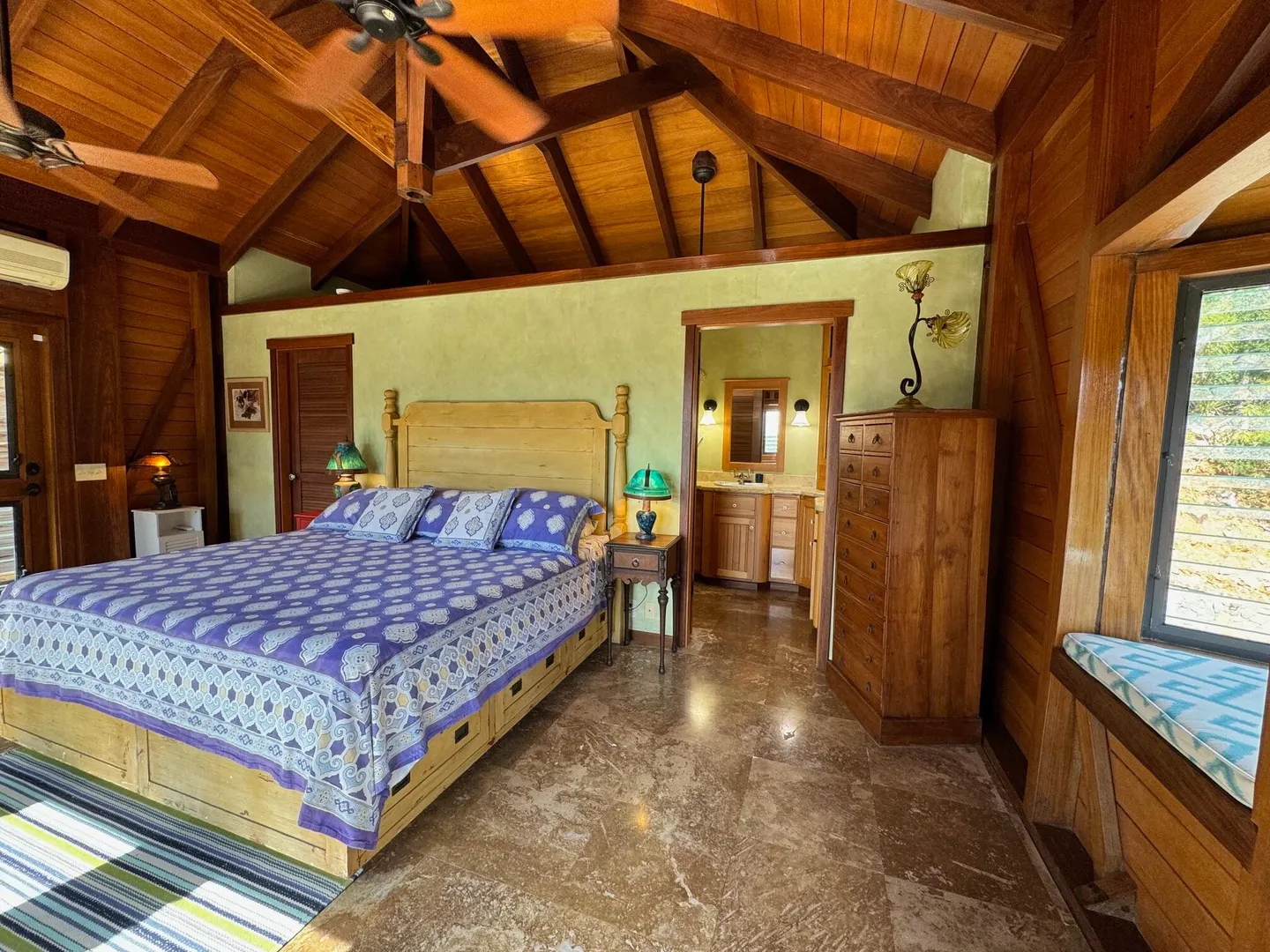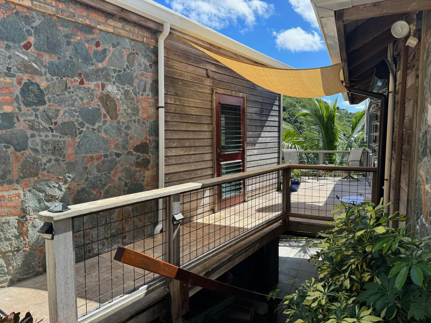 Nestled in the tranquil setting of Fish Bay, sitting above preserved green space with ocean view & gentle breezes. this beautifully renovated home features exotic tropical hardwoods, Jatoba exterior doors, Brazilian cherry hardwood flooring, & Purple Heart T &G walls in the great room. Primary suite includes travertine floors, Santa Maria T&G with manchichi rafter & eucalyptus cabinetry. Custom cabinetry through out. Kitchen remodeled in 2017, stainless steel appliances & quartz countertops. Lower level features 2nd bedroom, 1/2 bath, laundry room & work shop. 21 solar panels with net metering, want to go off the grid, all you need is battery back up. 25000K diesel generator. AC in primary suite. SimpliSafe security system. Armor Screen Hurricane system. UV whole water filtration system