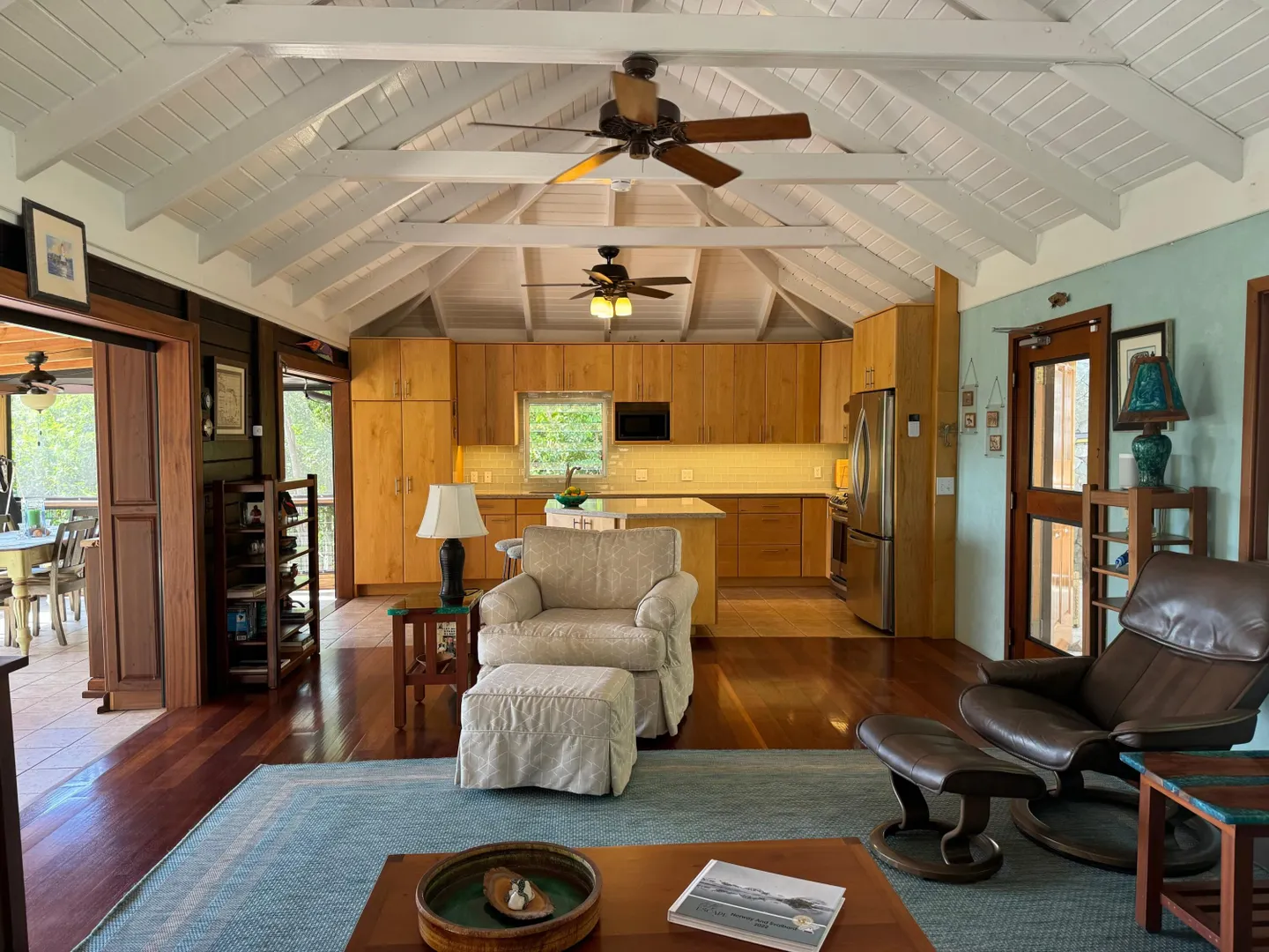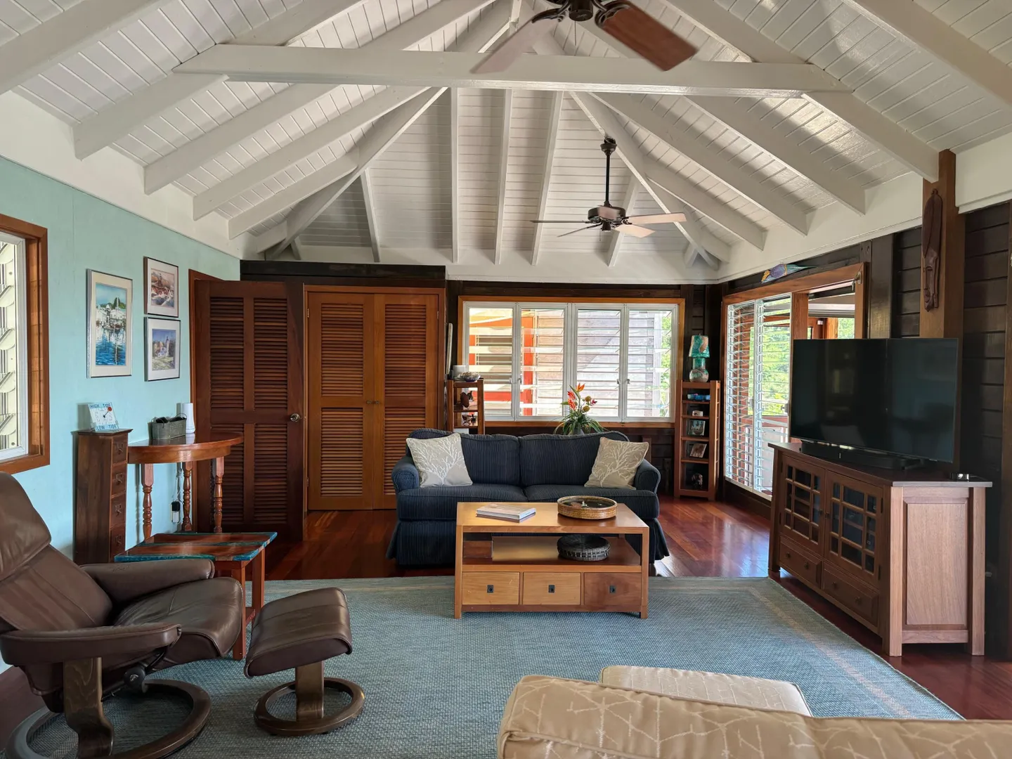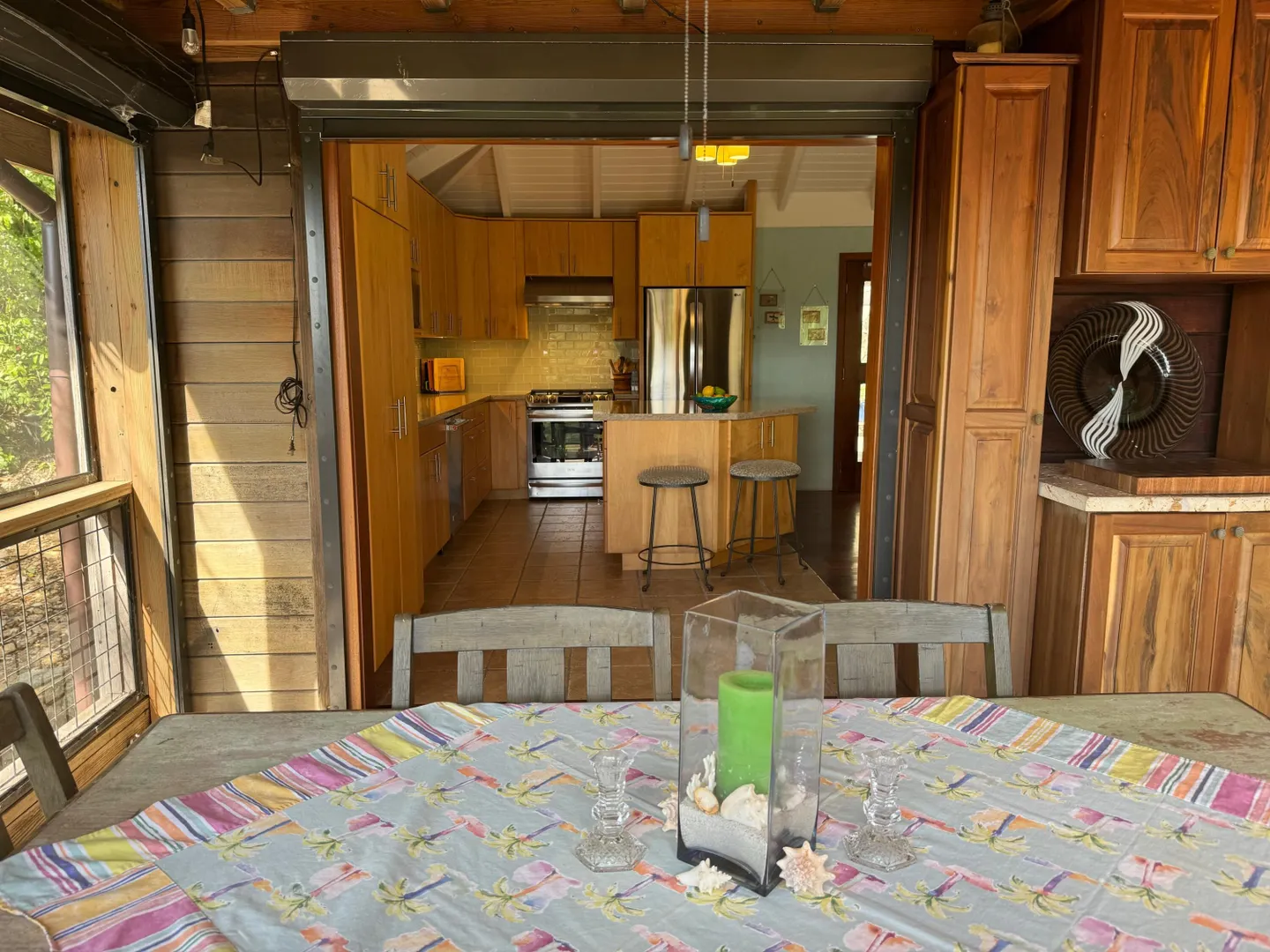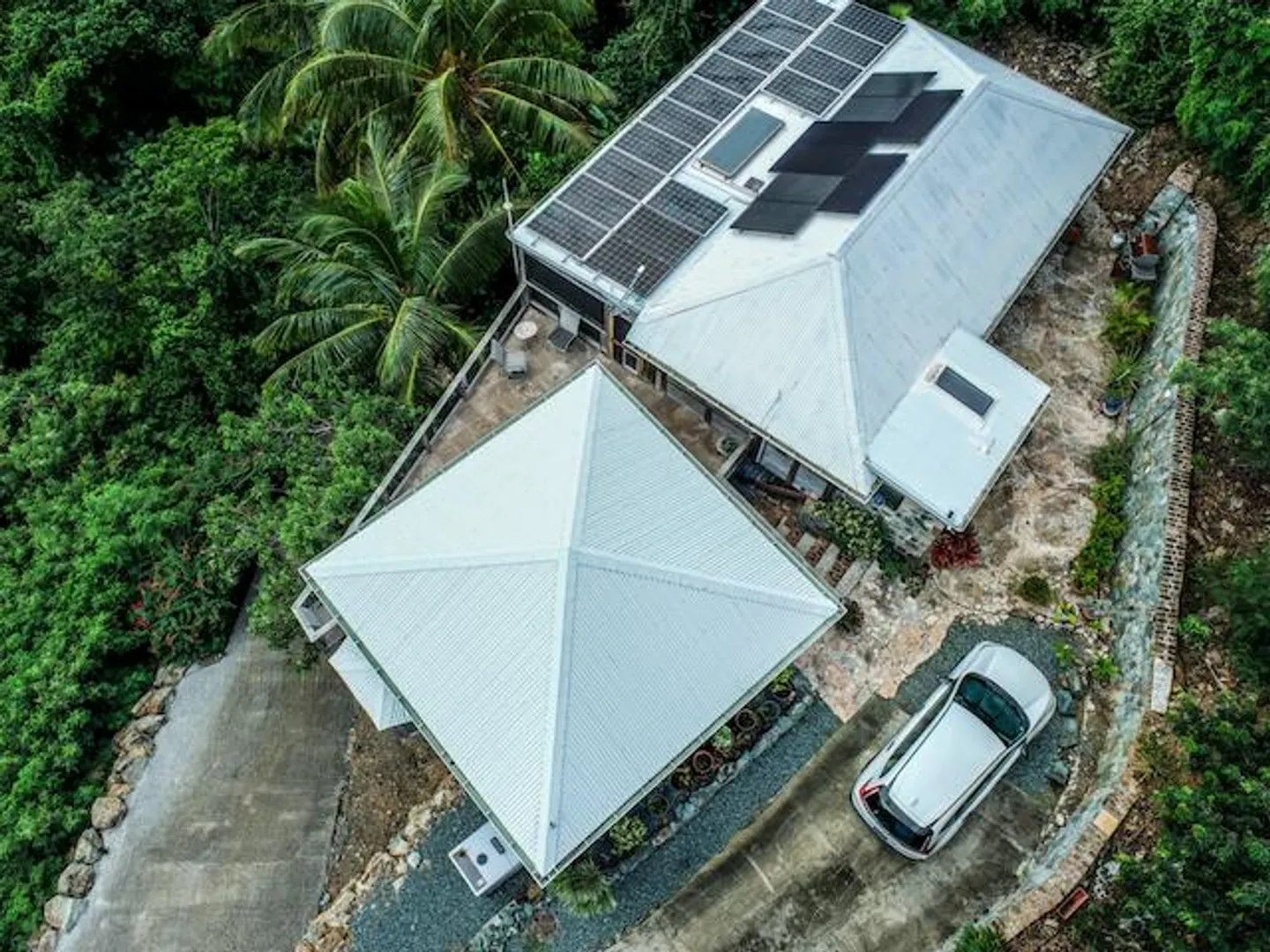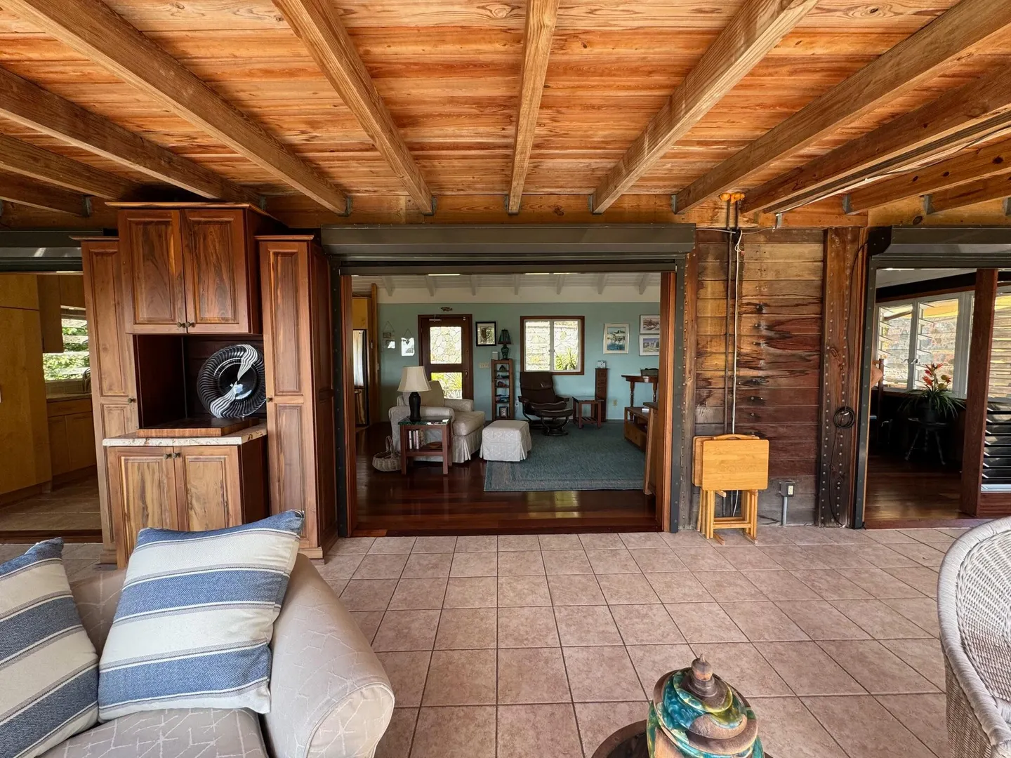Nestled in the tranquil setting of Fish Bay, sitting above preserved green space with ocean view & gentle breezes. this beautifully renovated home features exotic tropical hardwoods, Jatoba exterior doors, Brazilian cherry hardwood flooring, & Purple Heart T &G walls in the great room. Primary suite includes travertine floors, Santa Maria T&G with manchichi rafter & eucalyptus cabinetry. Custom cabinetry through out. Kitchen remodeled in 2017, stainless steel appliances & quartz countertops. Lower level features 2nd bedroom, 1/2 bath, laundry room & work shop. 21 solar panels with net metering, want to go off the grid, all you need is battery back up. 25000K diesel generator. AC in primary suite. SimpliSafe security system. Armor Screen Hurricane system. UV whole water filtration system