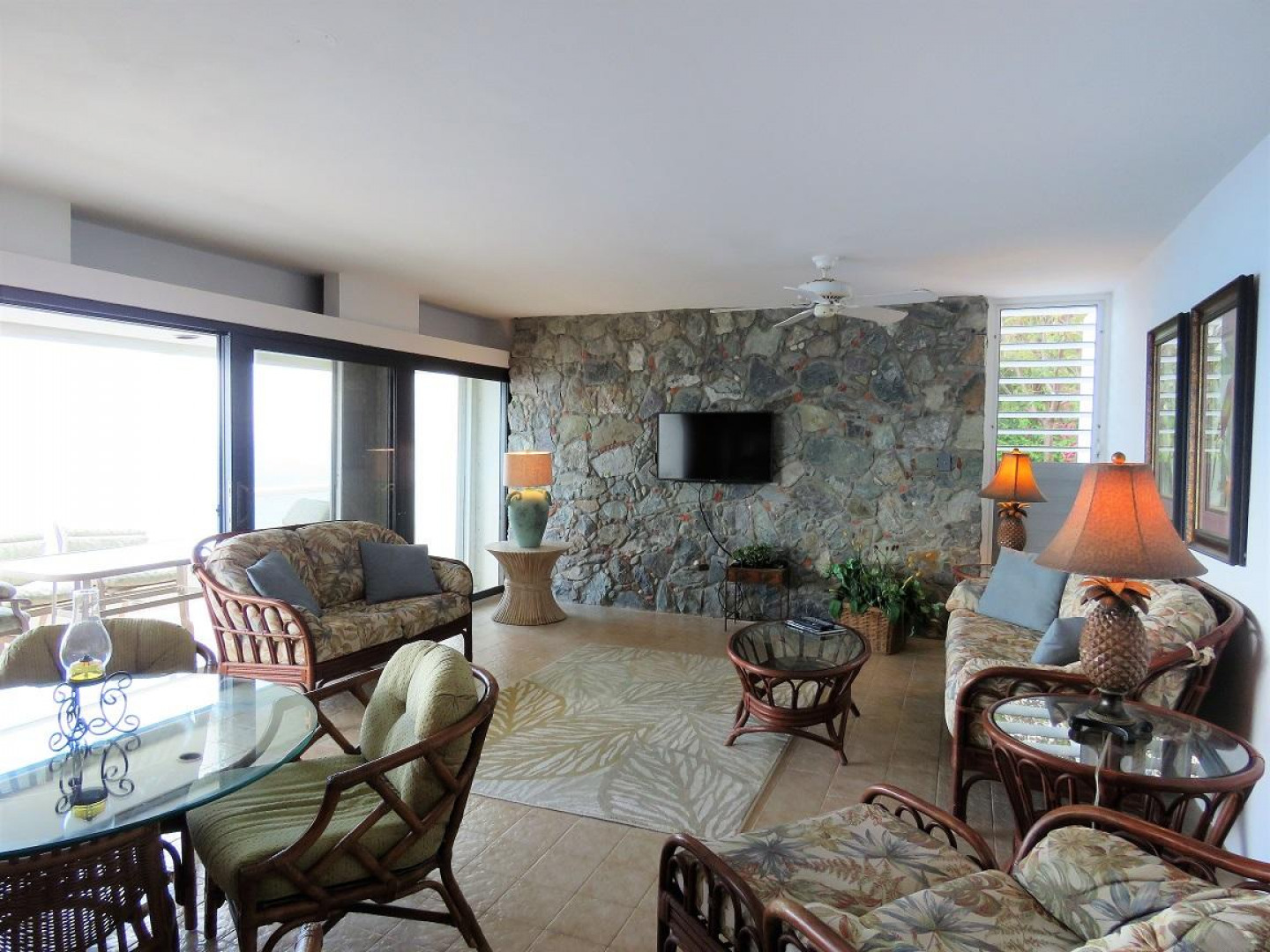 AN OCEAN VIEW FROM EVERY ROOM. Picture perfect down island views abound from this 2 bedroom condominium located at the end of a quiet cul-de-sac. A walk-in level condo with a carport that captures the easterly trade winds and has breathtaking views of the BVI's and St. John. The entryway and living room feature blue bit stone walls; the remodeled gourmet kitchen has sparkling stainless steel appliances and opens to the main living and dining area. There is an extra room off the guest bedroom that makes a great outdoor den/living area. New sliders and screen doors were installed in the living room and Master bedroom by Mahogany Run in 2016. Bright and airy and a wonderful place to call home. See new Vacation Rental Policy in Documents.