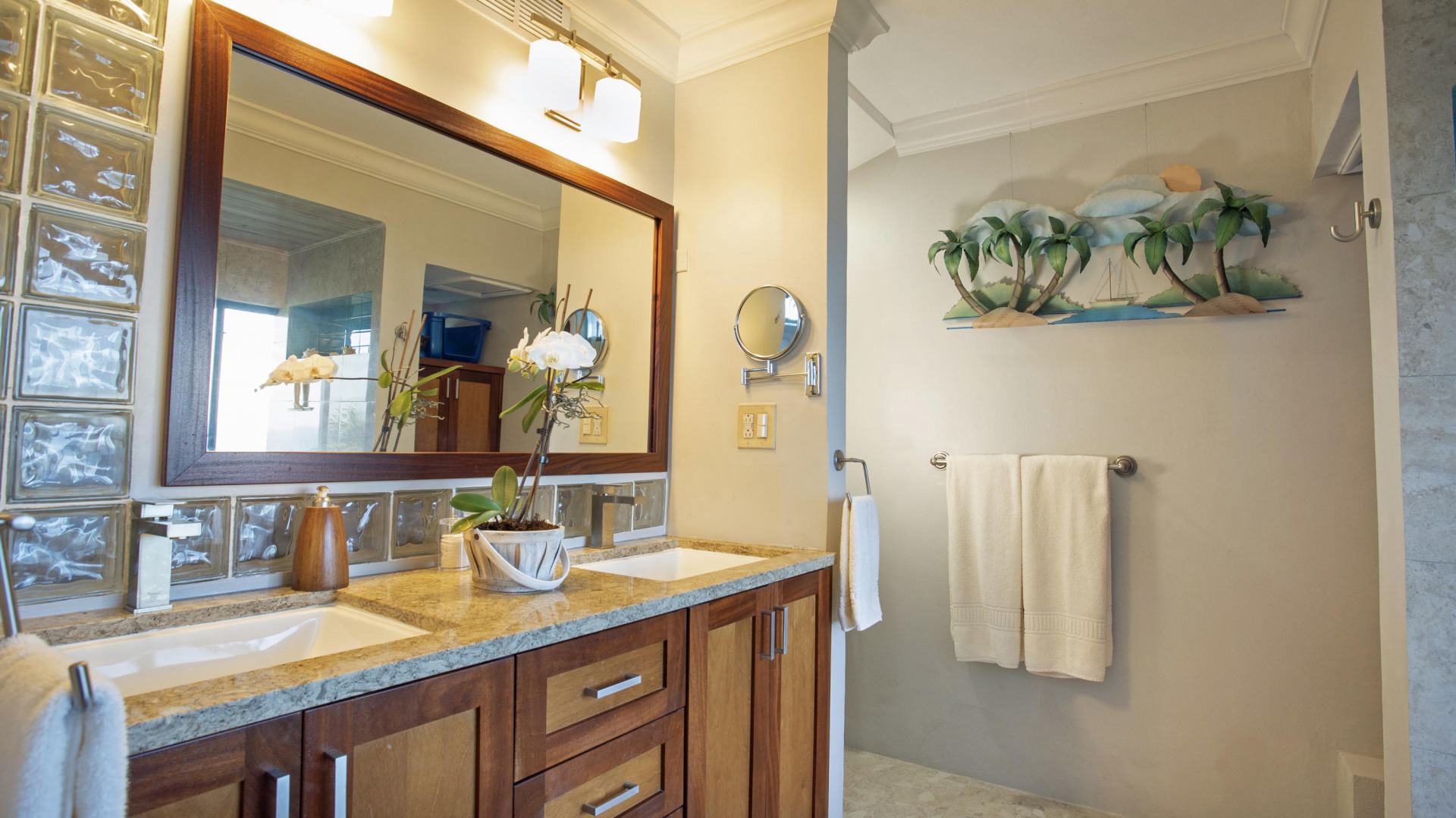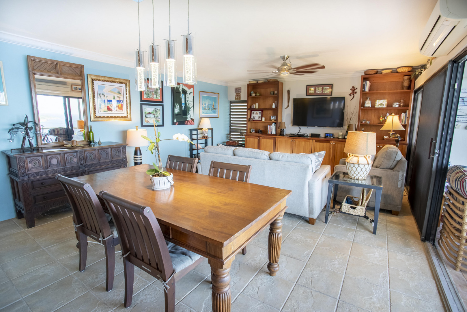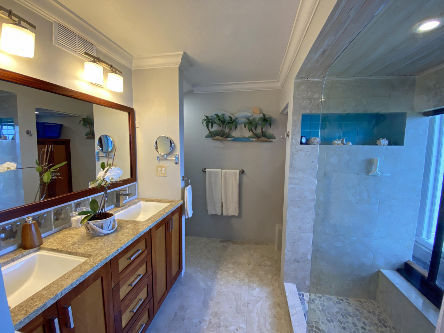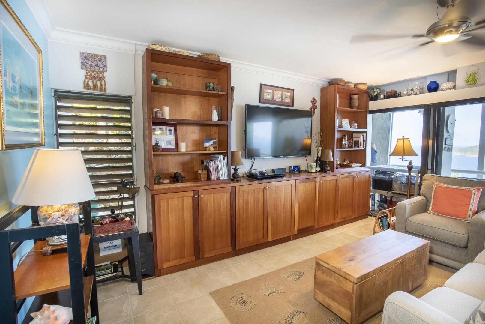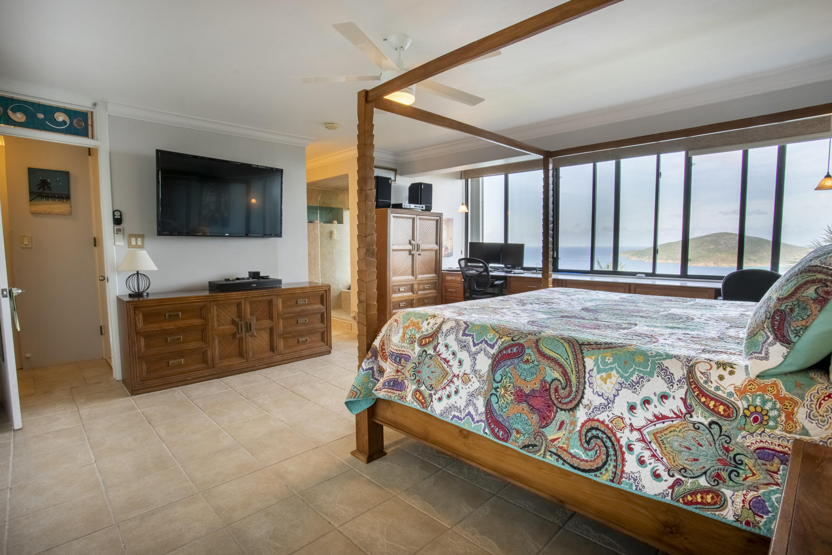A step above, this one bedroom Mahogany Run condo has a multitude of special features to recommend it. The owners have expended every effort to take what is a very livable design and elevate it with special features and additional storage. There is custom mahogany cabinetry throughout, high end kitchen appliances and quartzite counters, a contemporary clean lined bathroom with double sink vanity, linen closet and walk in shower enclosure and unique to this unit is the addition of a powder room making this the only 1 bedrm 1 1/2 bath unit in the complex. The master bedroom has been expanded with a built in desk with a view guaranteed to distract you as you work. Above all is the beautiful view from Hans Lollick to the BVI visible from all of the rooms and to be enjoyed from the 32' deck