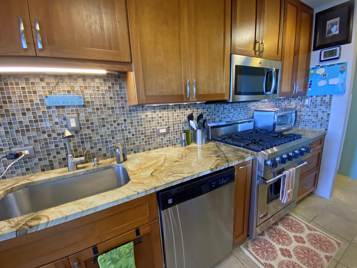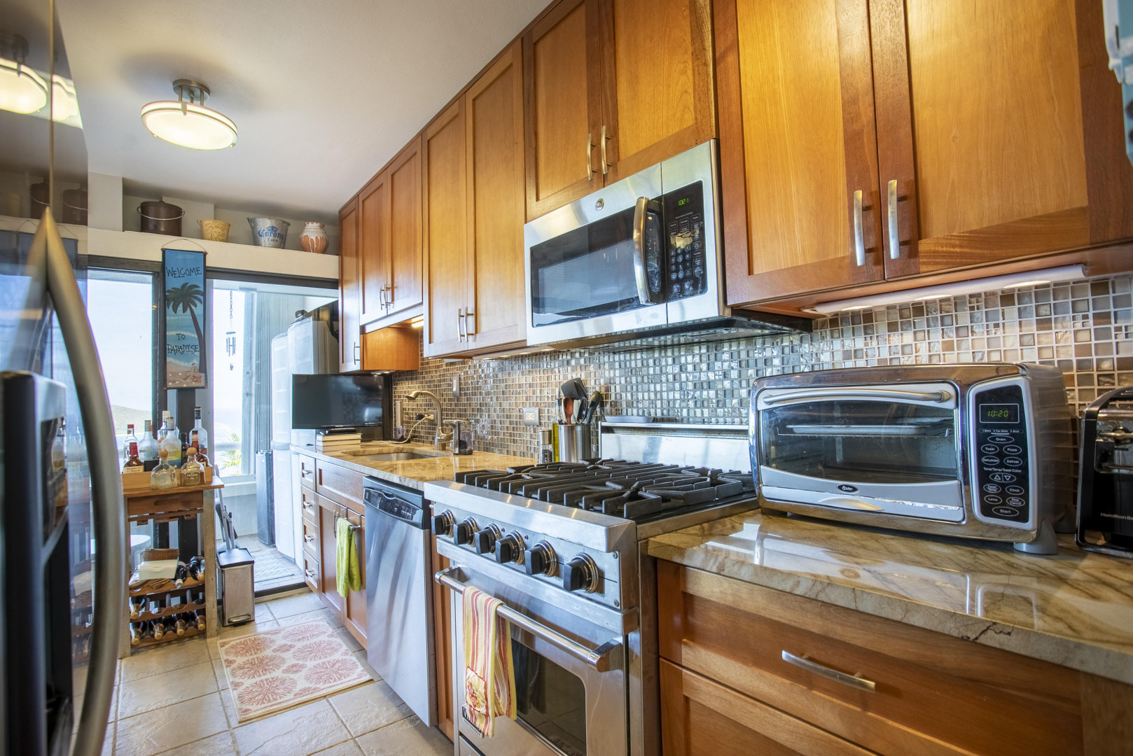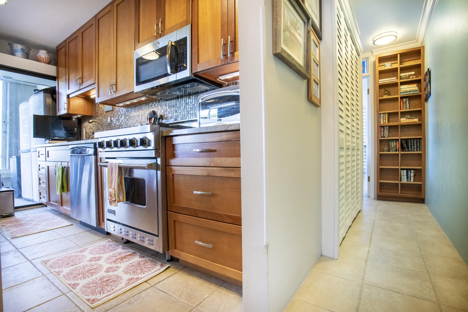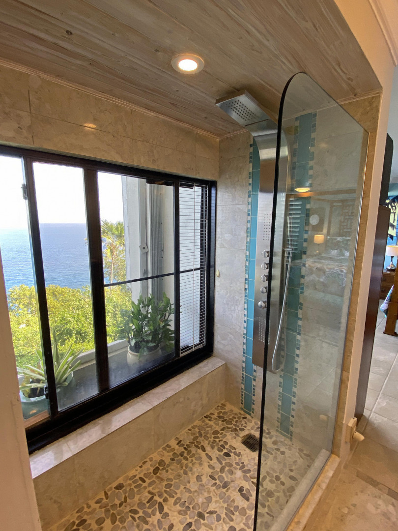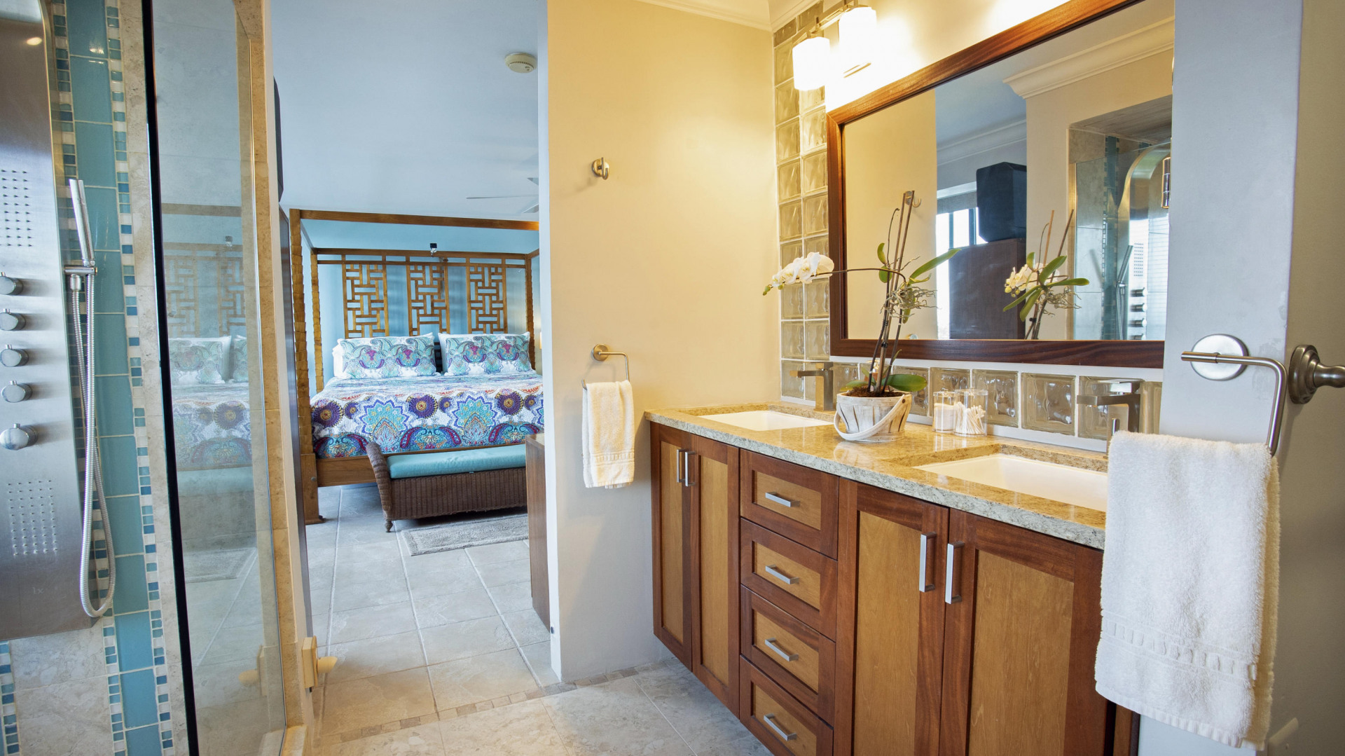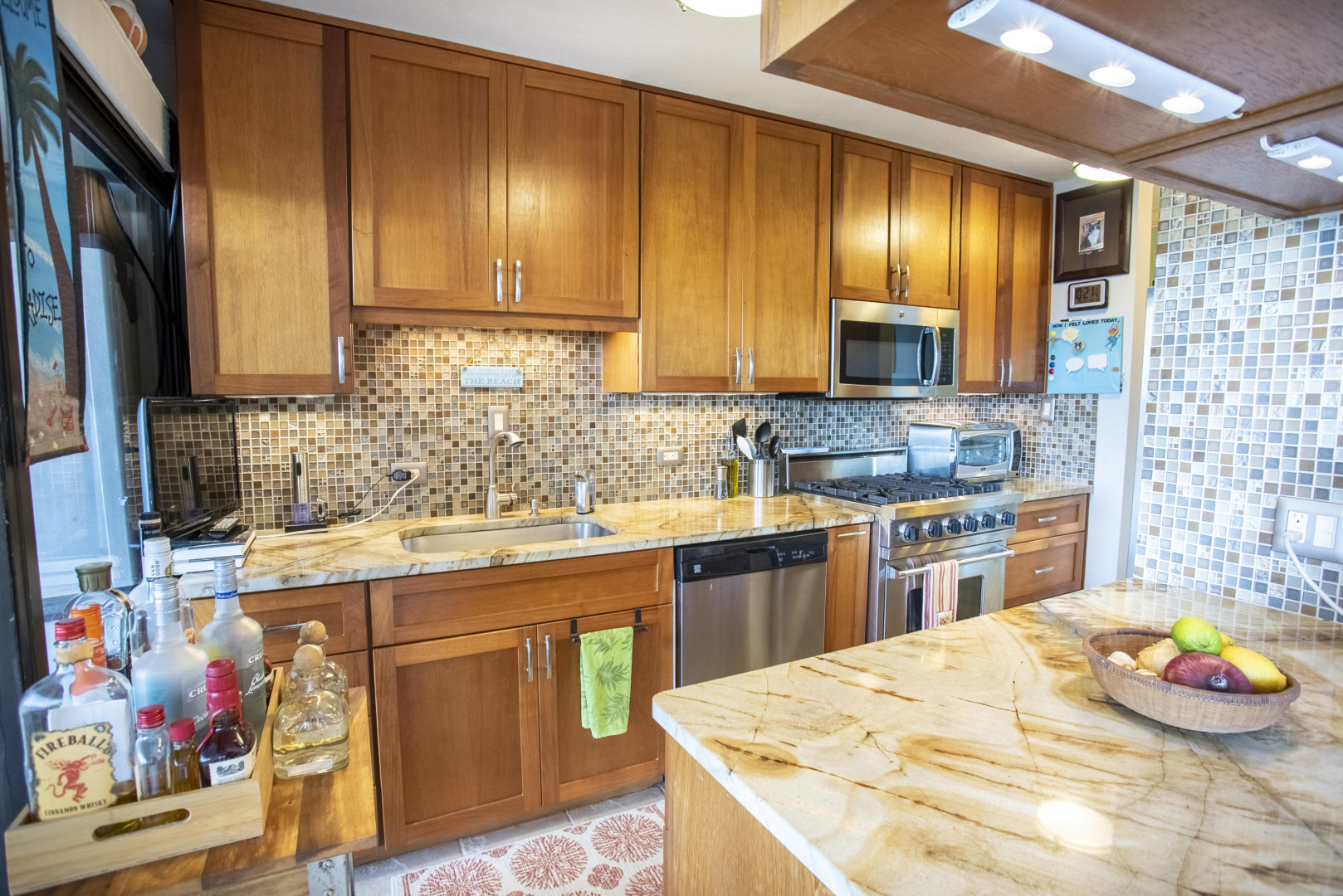 A step above, this one bedroom Mahogany Run condo has a multitude of special features to recommend it. The owners have expended every effort to take what is a very livable design and elevate it with special features and additional storage. There is custom mahogany cabinetry throughout, high end kitchen appliances and quartzite counters, a contemporary clean lined bathroom with double sink vanity, linen closet and walk in shower enclosure and unique to this unit is the addition of a powder room making this the only 1 bedrm 1 1/2 bath unit in the complex. The master bedroom has been expanded with a built in desk with a view guaranteed to distract you as you work. Above all is the beautiful view from Hans Lollick to the BVI visible from all of the rooms and to be enjoyed from the 32' deck