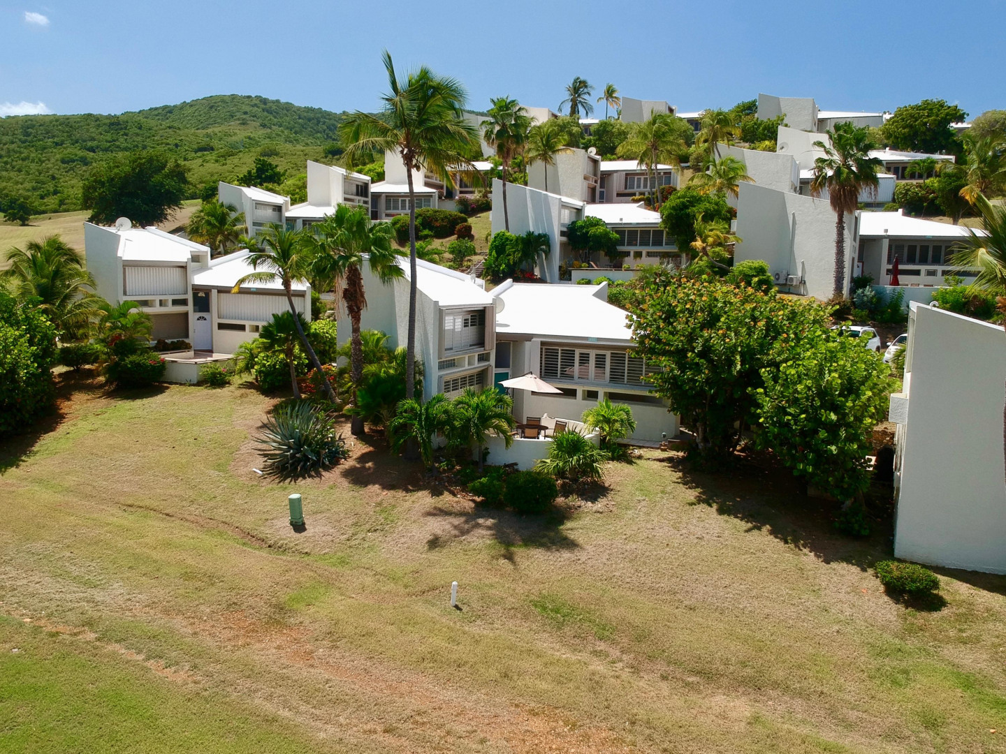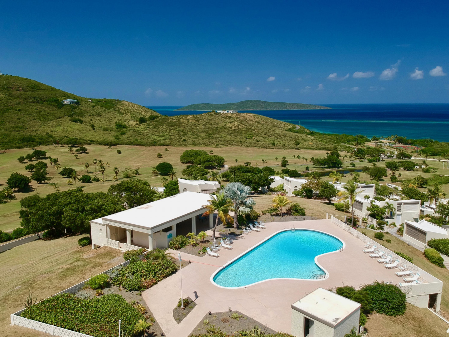 Best location at the Reef! Right on the 9th hole. One of the only Free standing units. Beautiful Caribbean view of Buck Island. New windows, updated kitchen, 2 masters with updated bathrooms. Also has a patio and an atrium for outdoor living. Mitsubishi AC splits throughout. Resort style complex with hilltop pool, tennis courts, white sandy beach and exercise room. Accordion hurricane shutters. Great vacation rental history.