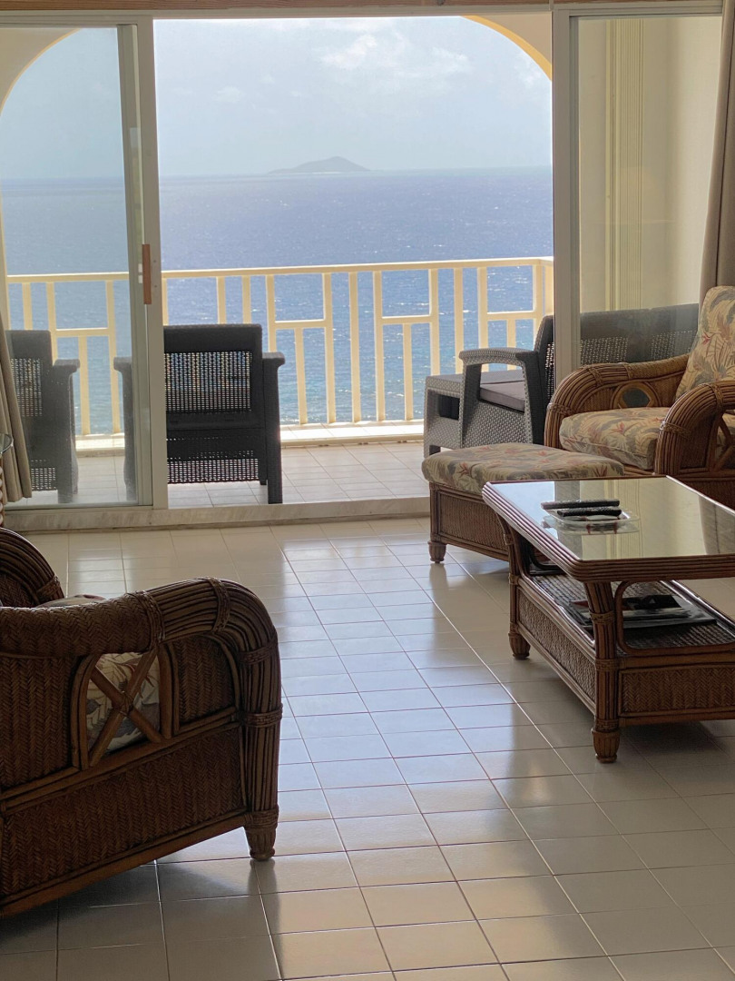 Available for rent from 9/1/24-1/31/25. Delight in the spacious bright open living space this condo has to offer, in addition to endless views from this seaside gallery. This is a top floor end unit just above the pool. The expansive views from your seaside gallery overlook the Caribbean , Buck Island, historic Christiansted, all the way to our sister islands and BVI on clear days. Conveniently located to nearby beaches, town, diving, grocery stores, and everything you need. If you're looking for move in ready, clean, private secure, and some of St. Croix's best views, this is it. Internet, tv & water included in rent. Amenities include pool, AC bedroom, 24/7 security. Perfect if you need a home for a short term job position