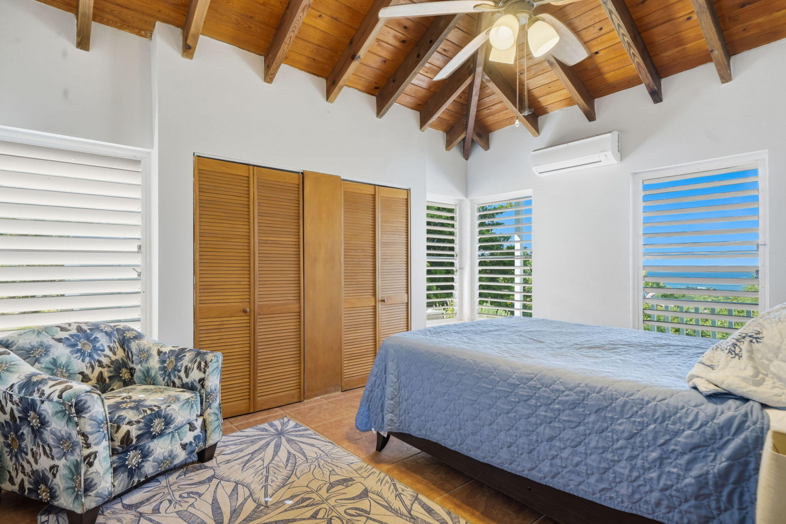 Spectacular sea views overlooking Gallows Bay all the way to St. Thomas and St. John. Great space for indoor/outdoor entertaining, or soak in the privacy as you dine al fresco or relax on the covered patio enjoying the soft sea breezes and the serenity of passing sailboats. Beautiful built in woodwork adds rich, tropical flair with a mahogany bar gracing the kitchen to dining room pass through, a built-in in desk in a bedroom currently used as an office, and beamed, vaulted ceilings in the open living and dining areas. Solar panels and batteries keep electric costs low. The 0.7 acre yard is partially fenced with a mature cashew tree, mango, baobab, carambola, banana, soursop, sugar apple, Caribbean cherry and a terraced garden with starts of rosemary, basil, garlic chive, and pineapple.