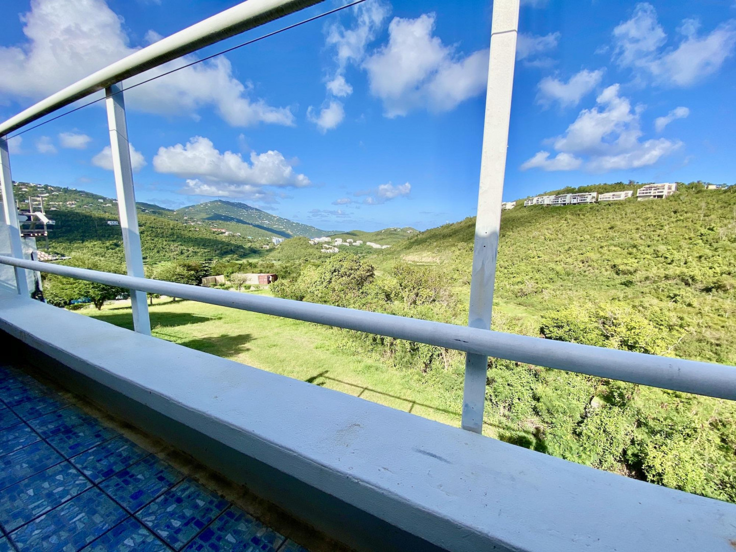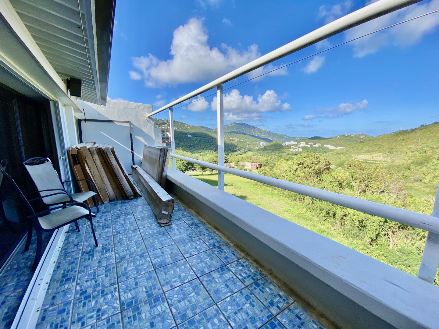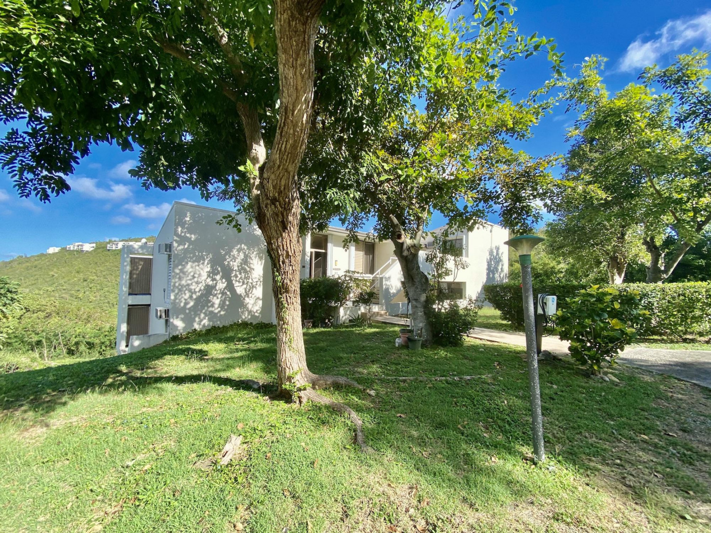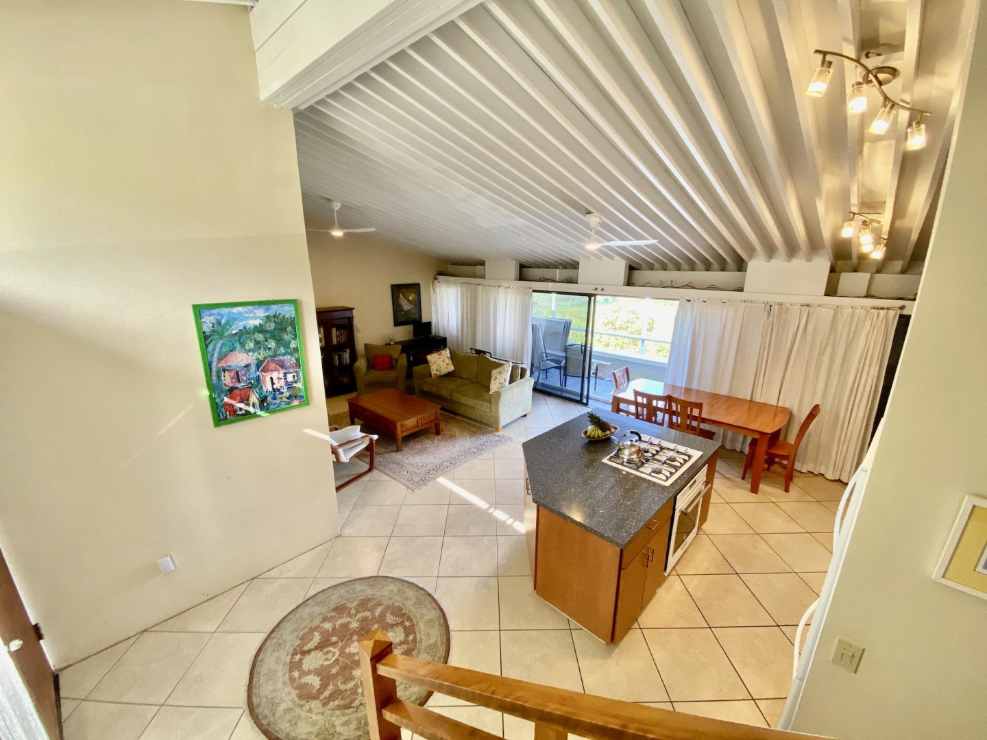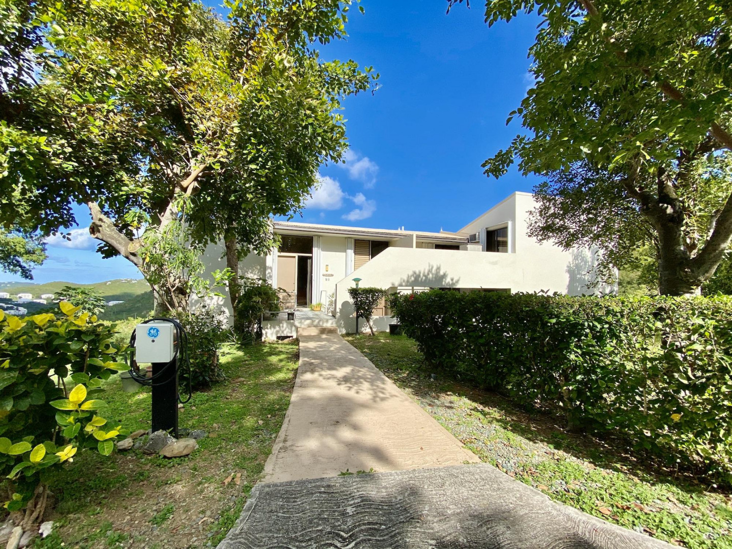 This rare split-level unit boasts cathedral ceilings, expanded bedrooms, quartz kitchen counters and a stone-lined master bathroom, all nestled in a private, cul-de-sac location. Walk out onto the large porch where bucolic hillside views descend into Magens Bay in the distance. Terrific price for a 2/2! A lovely home for entertaining with its spacious open floor plan and gracious risen entryway, and plentiful parking. HOA covers security gate, trash removal, parking, storage, shutters and lanscaping.