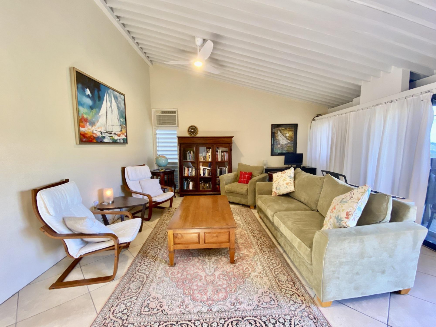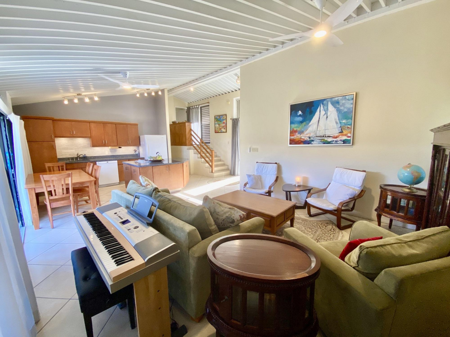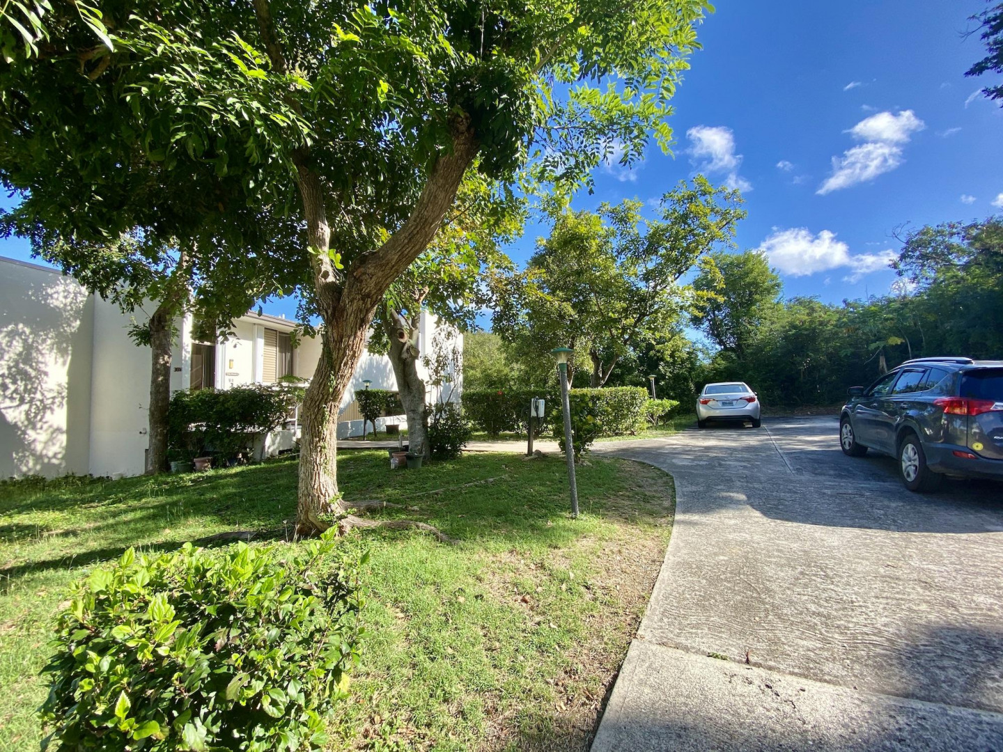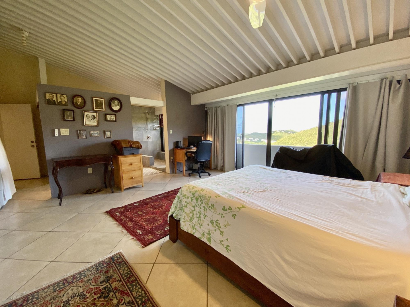 This rare split-level unit boasts cathedral ceilings, expanded bedrooms, quartz kitchen counters and a stone-lined master bathroom, all nestled in a private, cul-de-sac location. Walk out onto the large porch where bucolic hillside views descend into Magens Bay in the distance. Terrific price for a 2/2! A lovely home for entertaining with its spacious open floor plan and gracious risen entryway, and plentiful parking. HOA covers security gate, trash removal, parking, storage, shutters and lanscaping.