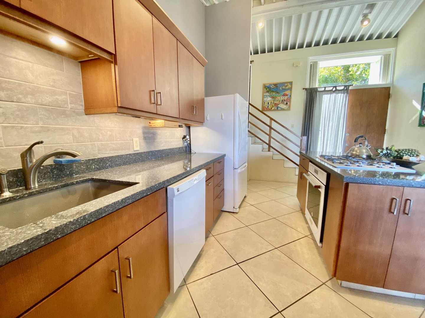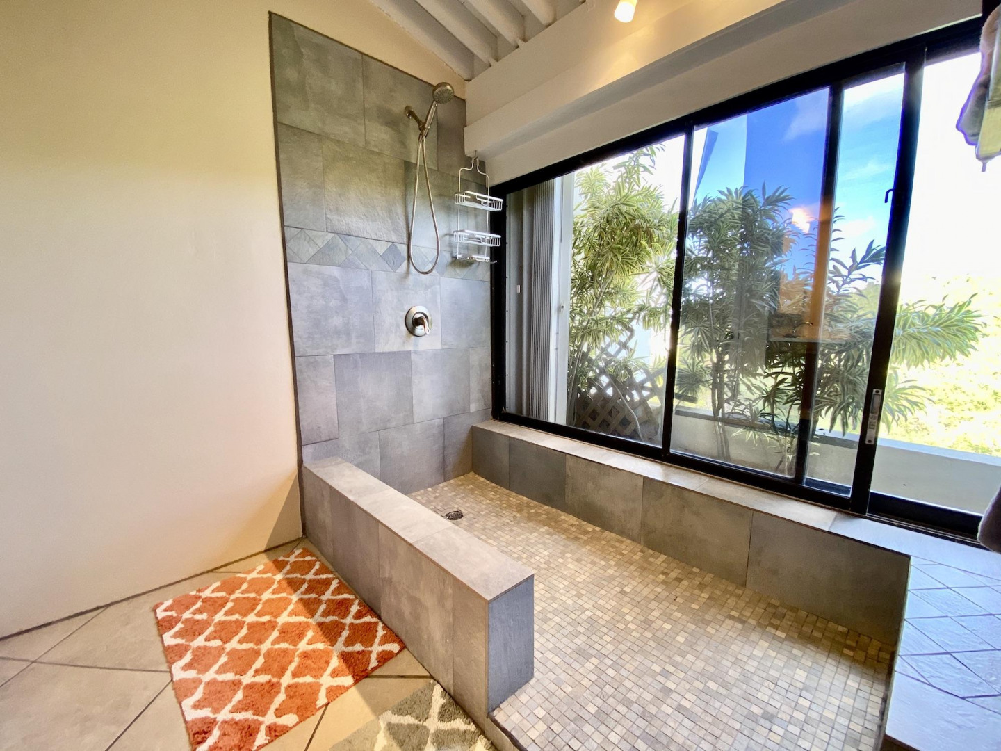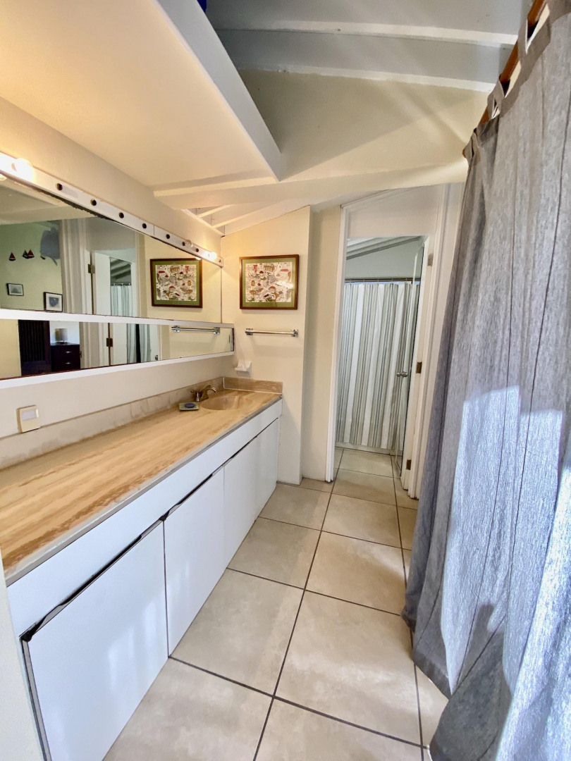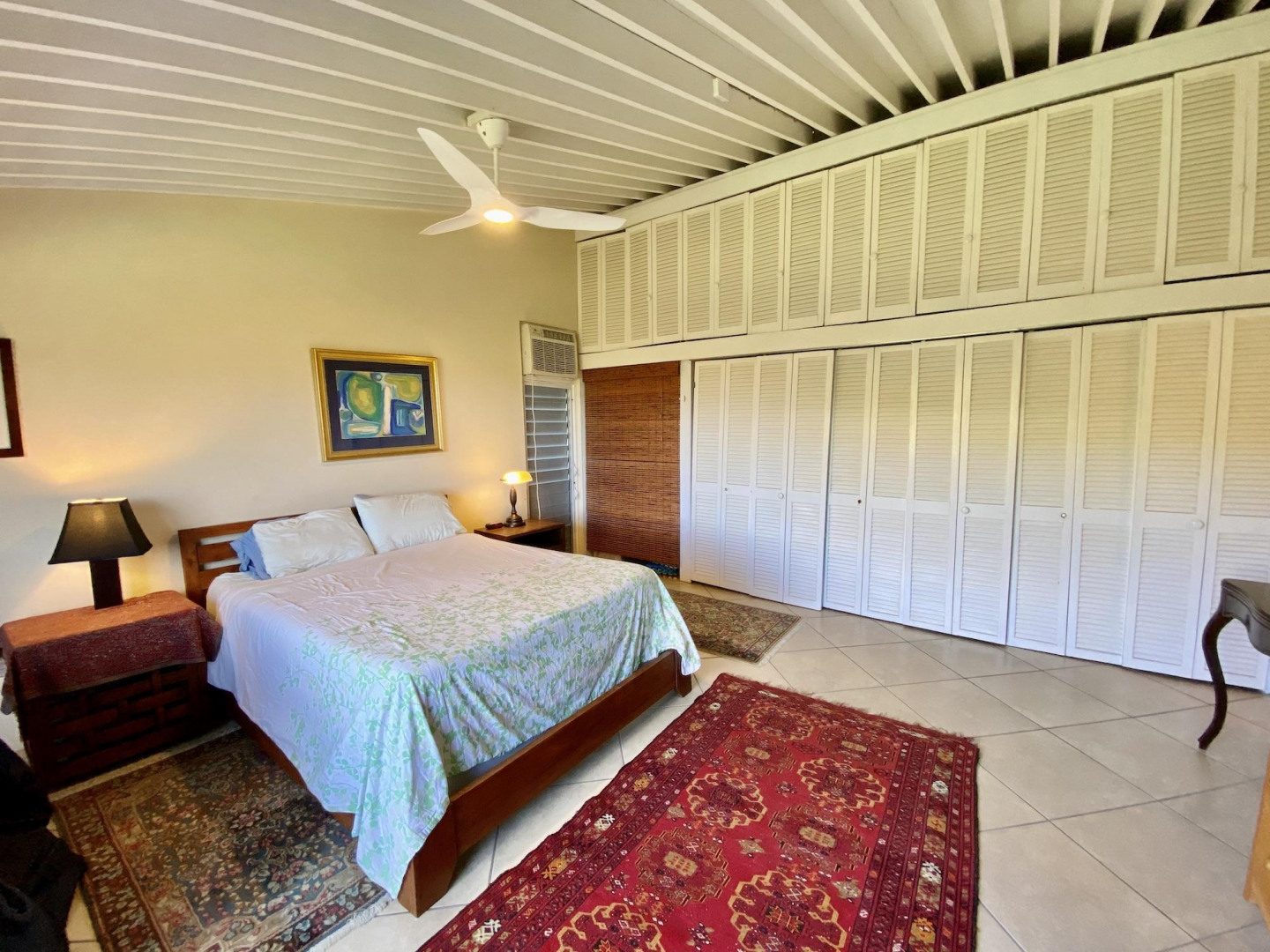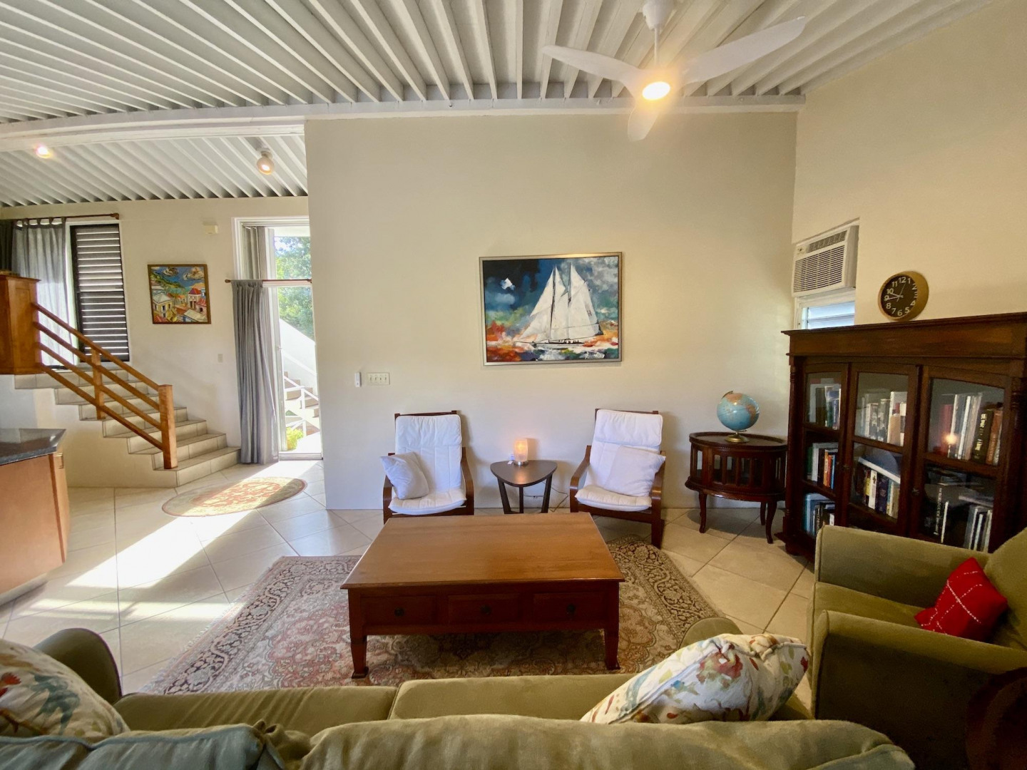 This rare split-level unit boasts cathedral ceilings, expanded bedrooms, quartz kitchen counters and a stone-lined master bathroom, all nestled in a private, cul-de-sac location. Walk out onto the large porch where bucolic hillside views descend into Magens Bay in the distance. Terrific price for a 2/2! A lovely home for entertaining with its spacious open floor plan and gracious risen entryway, and plentiful parking. HOA covers security gate, trash removal, parking, storage, shutters and lanscaping.