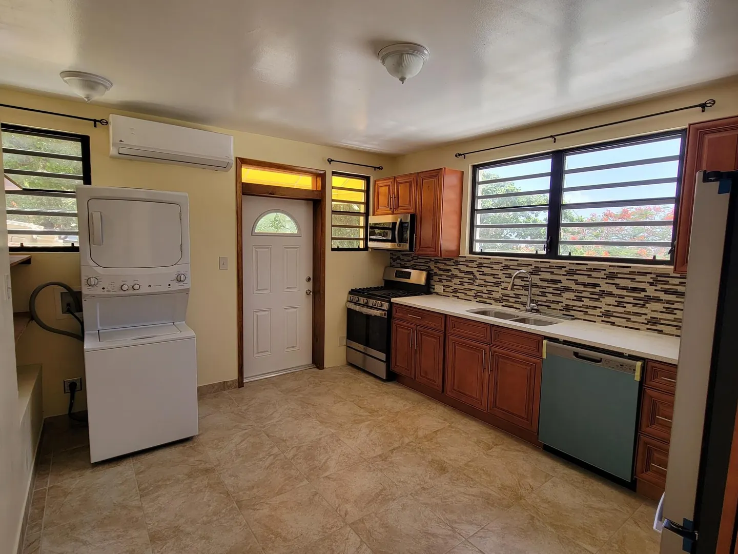 Brand new apartment with split a/c, gas stove, w/d and generator. Plenty of flat parking in a gated community close to Charlotte Amalie, the airport and UVI. Rent includes Dish. Cat or small dog considered with owner approval.
