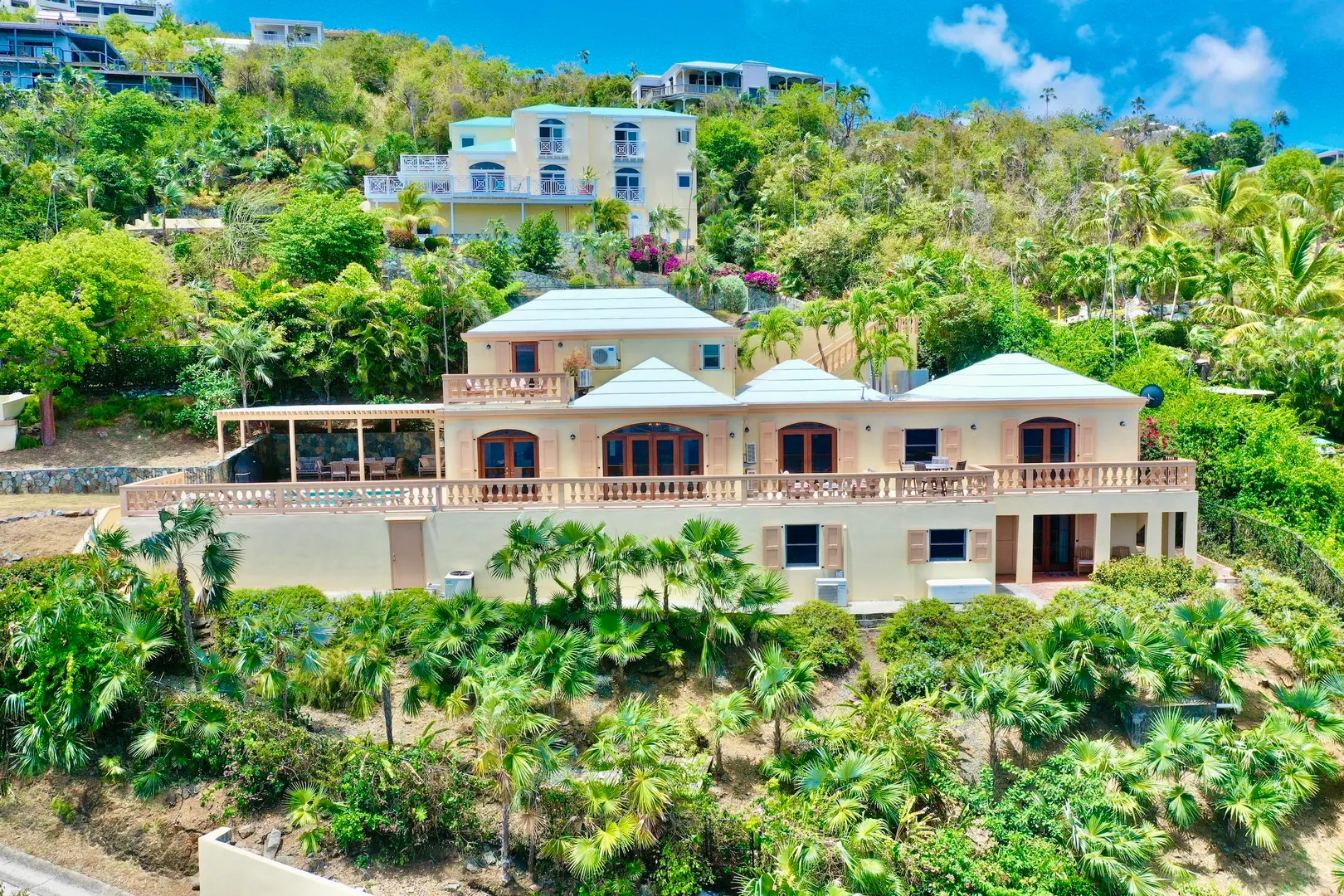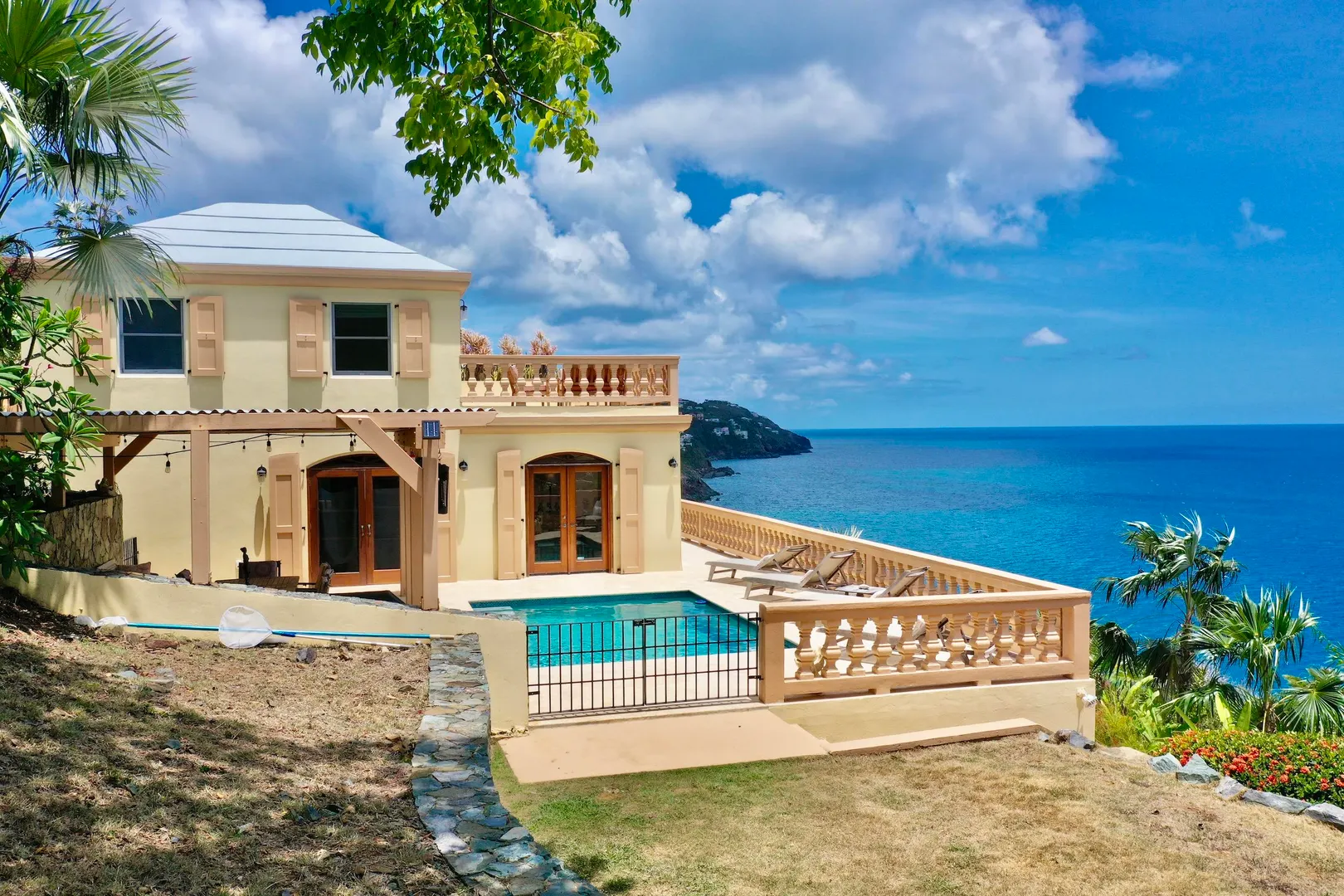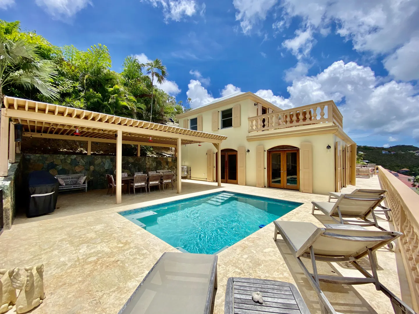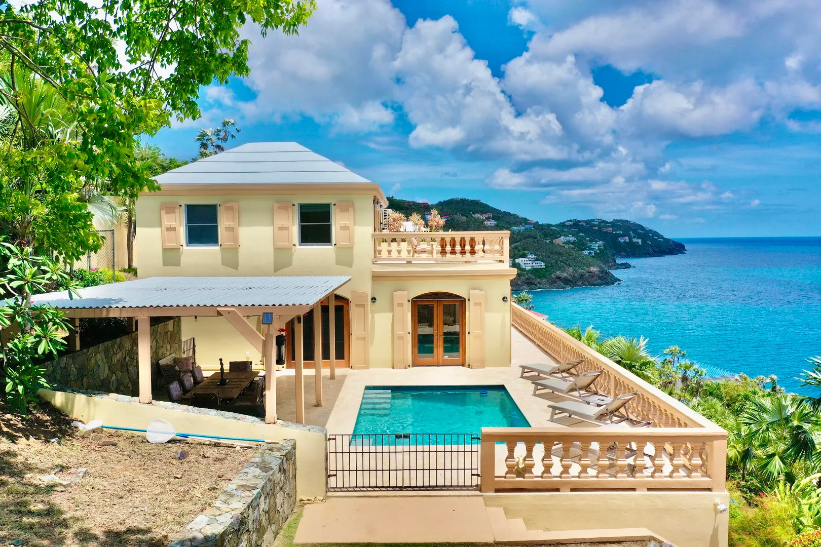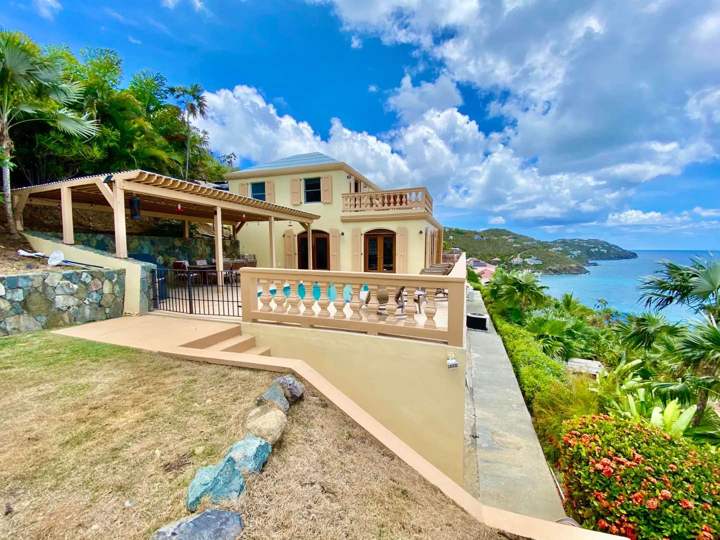 Villa Harmony is a 4 bedroom 3.5 bath villa with ocean and down island views from all rooms. Fabulous chefs kitchen with everything from granite countertops to warming drawers and wine coolers. Lots of room to entertain around the heated pool. Solid masonry home including the gutters. Full auto generator with 450 gallon diesel tank. This villa has been lovingly and meticulously cared for.