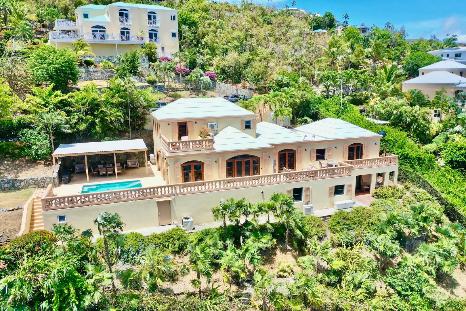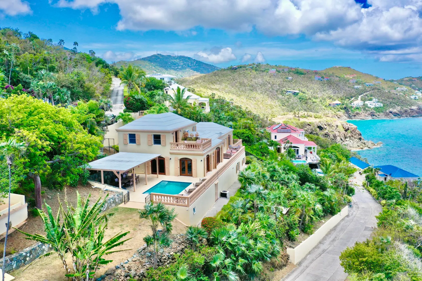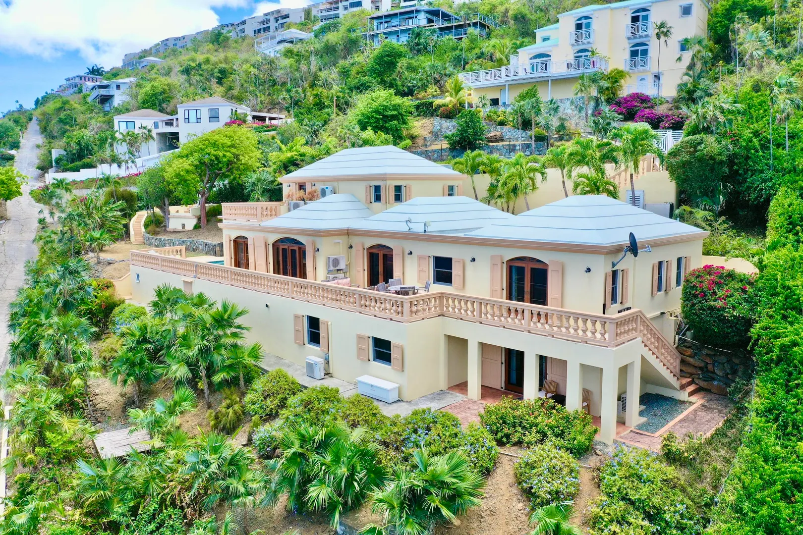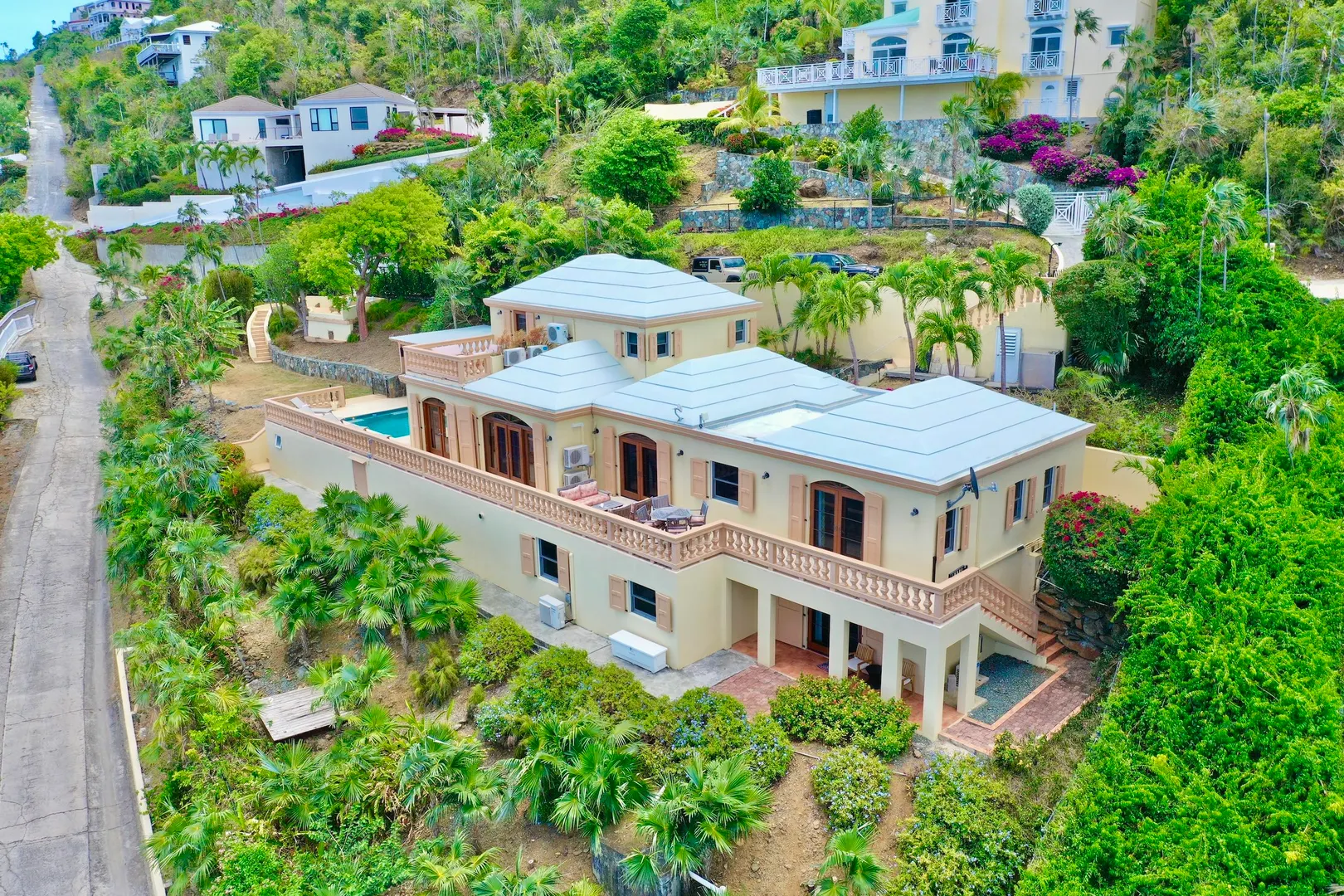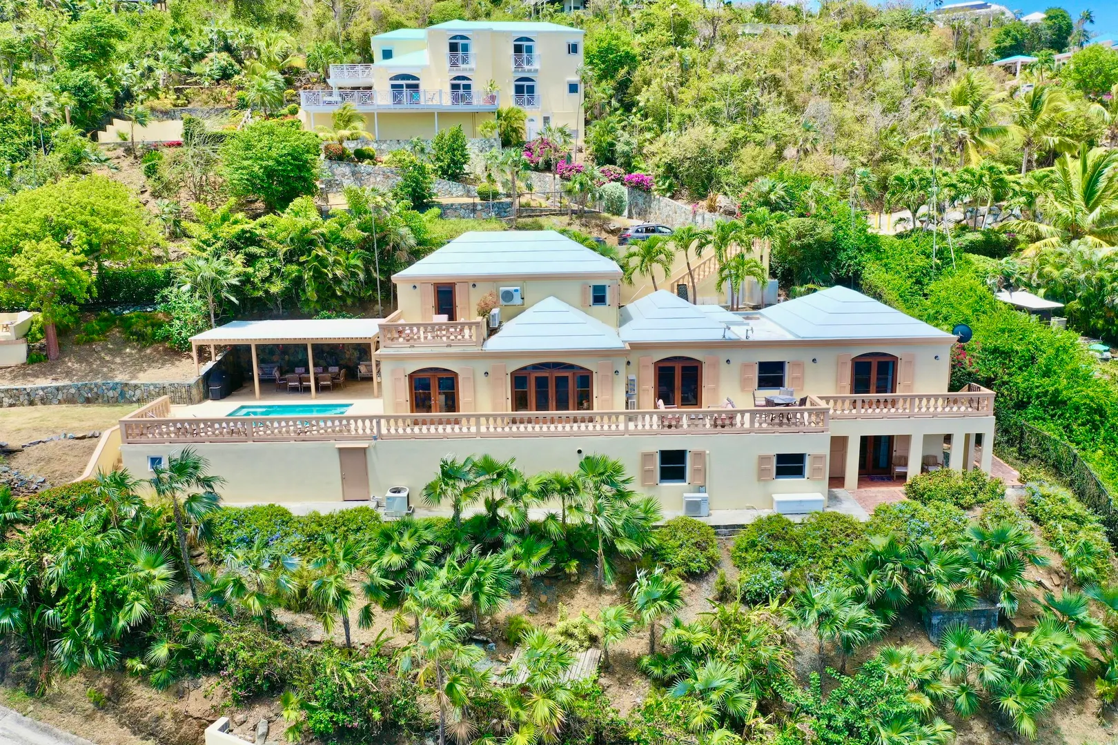 Villa Harmony is a 4 bedroom 3.5 bath villa with ocean and down island views from all rooms. Fabulous chefs kitchen with everything from granite countertops to warming drawers and wine coolers. Lots of room to entertain around the heated pool. Solid masonry home including the gutters. Full auto generator with 450 gallon diesel tank. This villa has been lovingly and meticulously cared for.