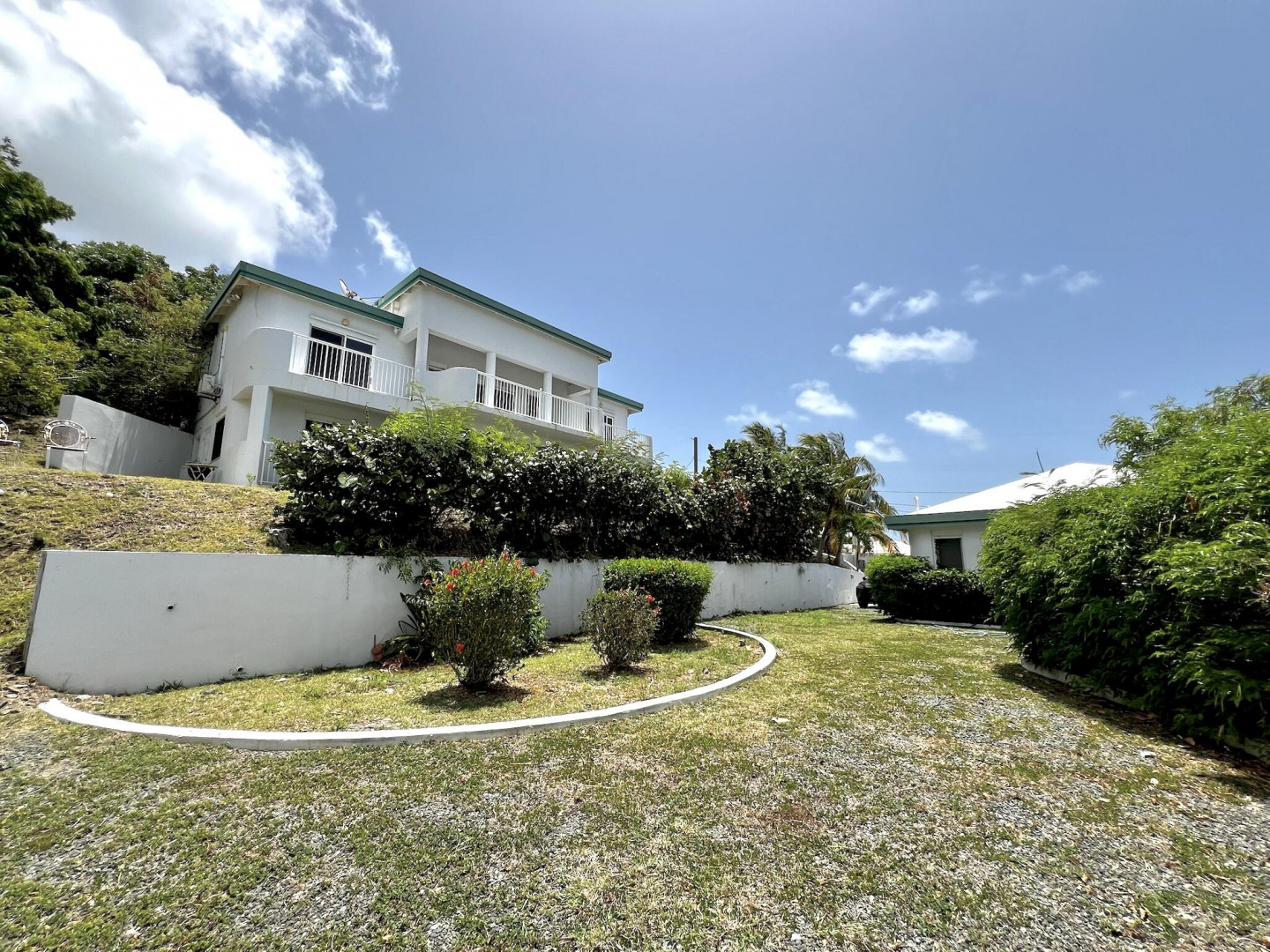 Multi-unit estate in the Green Cay beachfront community with breathtaking views of Buck Island and the turquoise Caribbean Sea. This rare hilltop retreat features multiple income-producing units, making it an ideal blend of island living and a smart investment. The main 3-BR, 2-bath residence has sea views from nearly every room, while a lower-level 2-BR, 1-bath guest suite includes its own kitchen and living space. Expansive 50 ft verandas span both levels, perfect for enjoying the steady trade winds and postcard-worthy views. The property also includes a separate 1-bedroom, 1-bath guest cottage with its own veranda and driveway, and an additional building--currently used as storage and a garage-- with plumbing and electrical in place.Just a short stroll to a sandy beach in the neighborhood on Ms Bea road, one of the most popular east end beach communities, and minutes from downtown Christiansted, this one-of-a-kind property offers a killer investment opportunity in an unbeatable island setting and location!