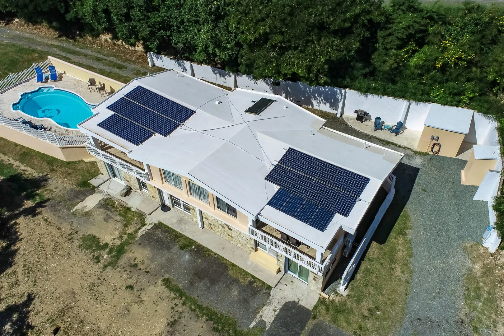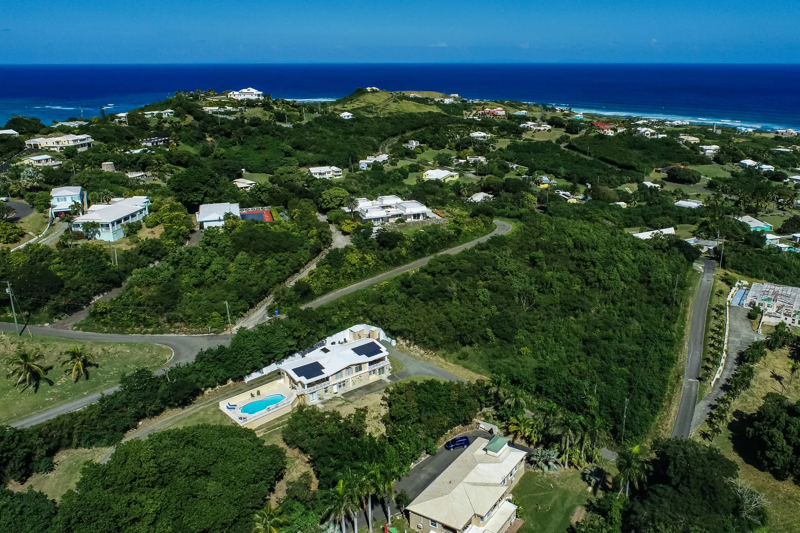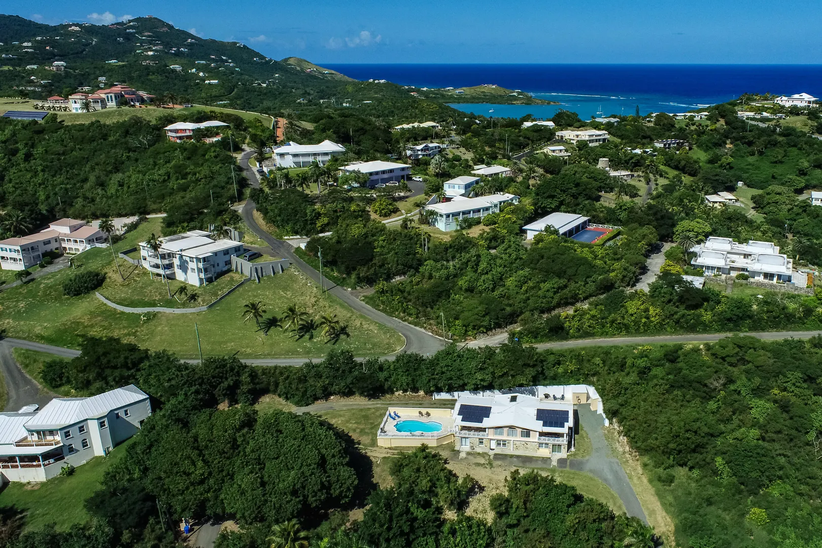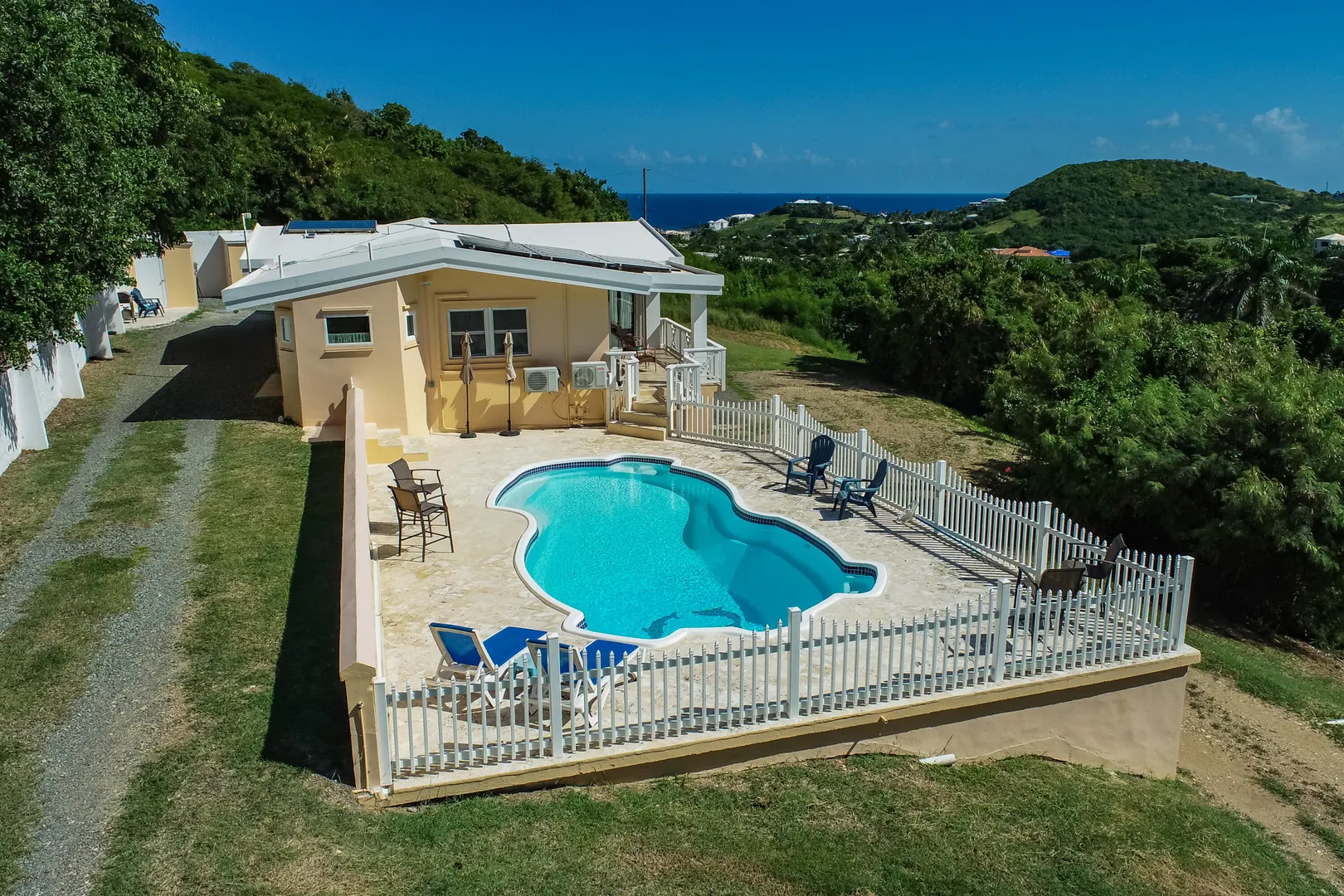 Sit back and feast your eyes upon this mid-island oasis! The spectacular 0.83 acre property is nestled in the lush hills of the Judith's Fancy neighborhood offering privacy, lovely ocean views and plenty of space throughout; perfect for a family or investor! The gorgeous home features two large upstairs bedrooms with en suite bathrooms and their own private patios. Sip coffee each morning while you gaze at the Caribbean Sea. Enjoy the high ceilings and open concept feel as you entertain in your large kitchen equipped with top-of-the-line appliances, including a large Wolf Range. Beautiful stonework, porcelain tile and mahogany doors are found throughout the home.