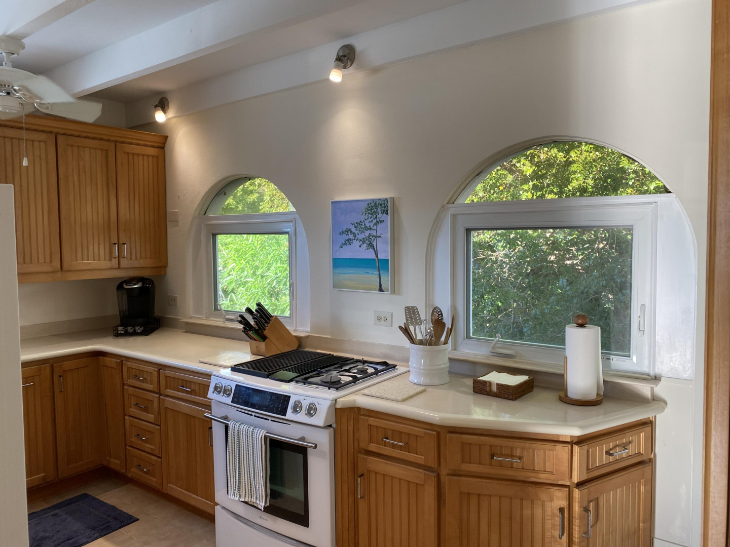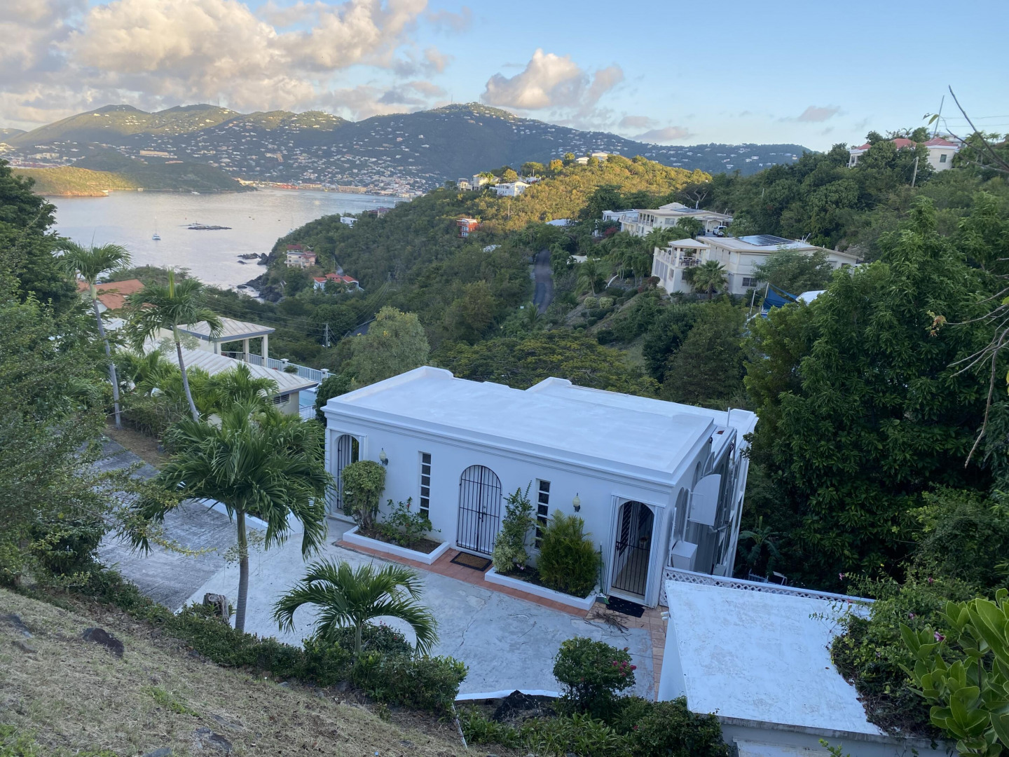 Architect Jeffrey Zucker's adaptation of classic climate-resilient West Indian design builds hurricane-resistant features into this 4 bedroom, 3 bath home. Nestled into a terraced, professionally landscaped yard, the home stairsteps down the sloping property to reveal a view of Hassel Island and Charlotte Amalie harbor framed by palms and native trees. Enjoy the two porches as cruise ships glide by at sunset, and the harbor lights twinkle across the water.Lovingly maintained by a single owner, the home has weathered hurricanes since its construction in 1980 with little damage. Caribbean-style wooded exterior shutters in arches with additional accordion hurricane shutters for other doors and windows provide protection and peace of mind. A concrete outbuilding protects the masssive 32 KW generator (2021) and 500-gallon diesel tank. An automatic transfer switch provides near seamless power. Two cisterns provide water for all uses. The driveway off the low-traffic private street is protected with a remote-controlled gate, and the property is fenced. The living room is entered at grade from the parking area and is half-level above the dining room and kitchen, which is half level above the main bedroom, full bath with tub, walk-in closet, a storage closet, a utility room with washer and dryer, and an enclosed porch area porch area with a large shower. Below this floor are two bedrooms connected by a shared bath. There are five split-system air conditioning units in living and sleeping areas. The lowest floor is reached by exterior stairs and has a bath with shower, a sitting area with a countertop and sink, and a bedroom with a separate door to a private micro-deck. There is an additional storage area accessible from the exterior stairway. A brief drive to Havensight and Downtown shopping, dining, and services, the home is a short to the Westin Frenchman's Reef Resort and Marriott Frenchman's Cove and Buoy Haus Resorts with a variety of restaurants and boutiques, two beaches, and a spa. The picturesque neighborhood is filled with multi-million dollar residences. Very few homes without pools are offered for sale in this neighborhood, and inventory in this price range is historically low in St. Thomas. With its desirable location, privacy, and lovely views, this unique property is worthy of consideration.