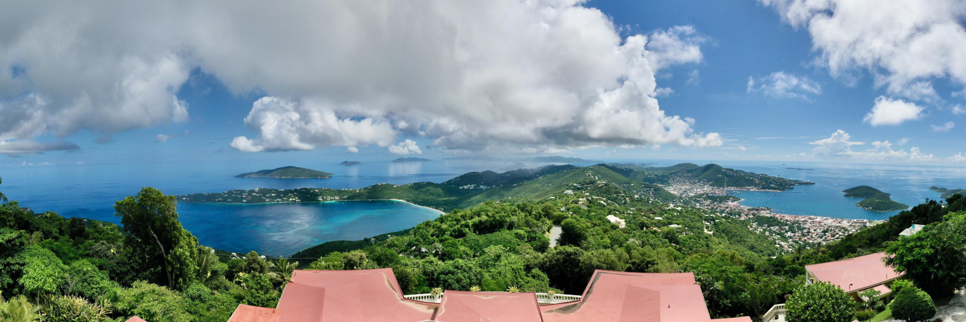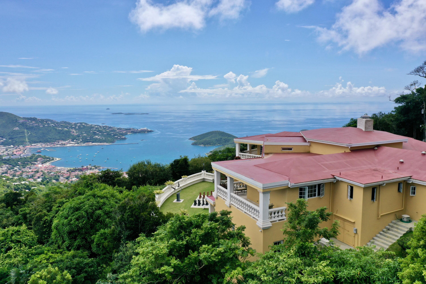 Called ''Trevista'' because of its incomparable (really!) 300 degree views , you can gaze from the master bedroom's expansive veranda out to Magens Bay and the islets off St. Thomas' northwest coast, all the way to the BVI, and even to the twinkling lights of Charlotte Amalie. Built on almost 2 acres in a cool, breezy mountaintop location, the 5BR main house features careful construction and unique finishes including hardwood flooring, custom cabinetry and imported tiles. The ''cottage'' is a full separate 2 BR residence with its own charm, views and parking. A full two car garage, wine cellar, flat grass yards, (with life size chess board!) and beautiful, immaculately maintained, mature gardens are just a few of the extraordinary features of this unique property. Furniture removed.