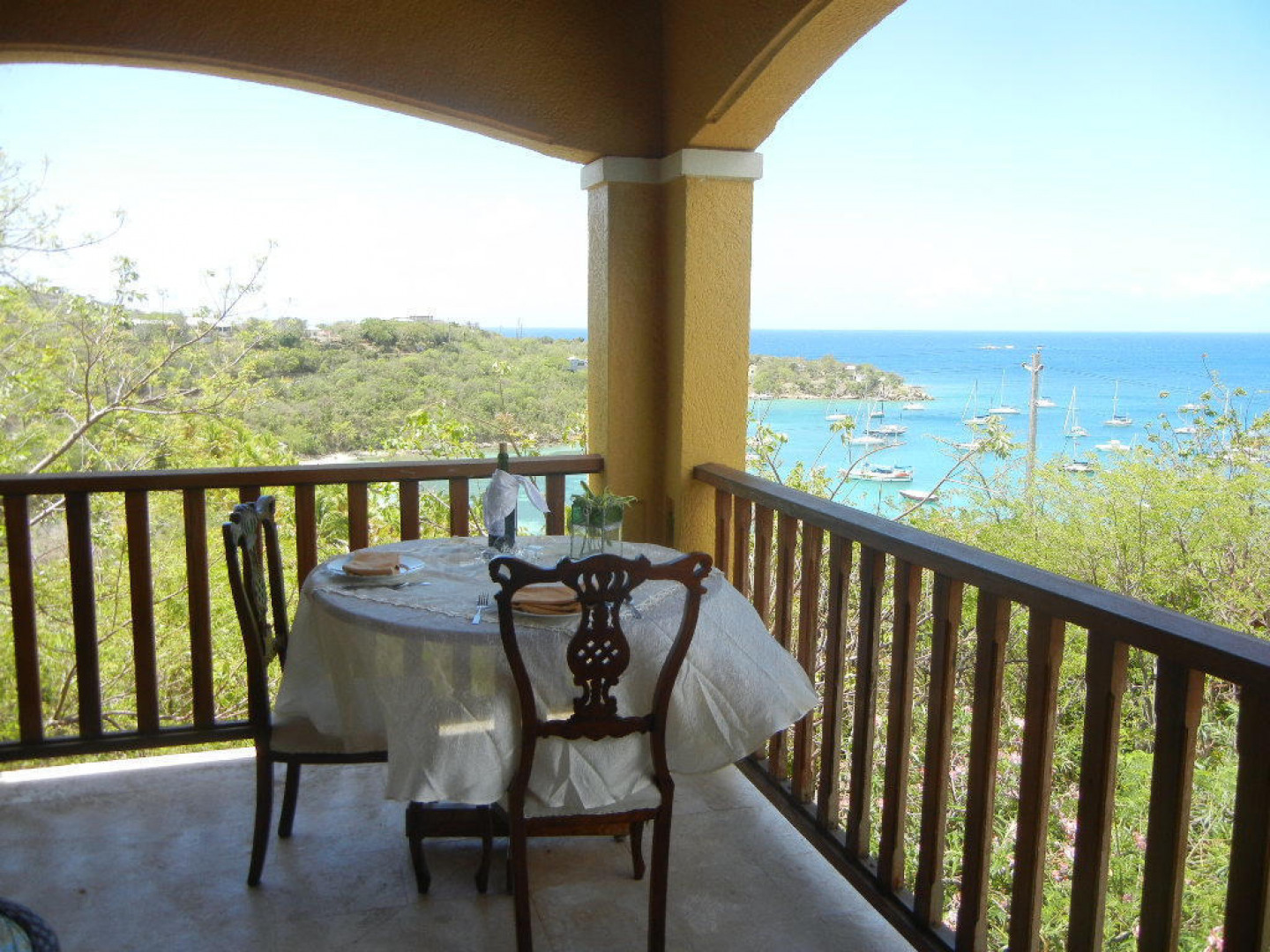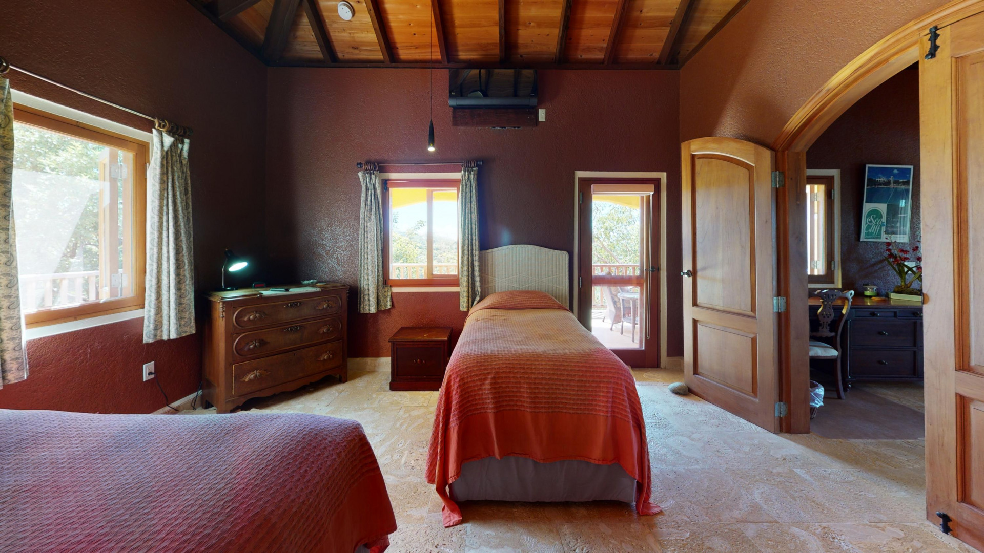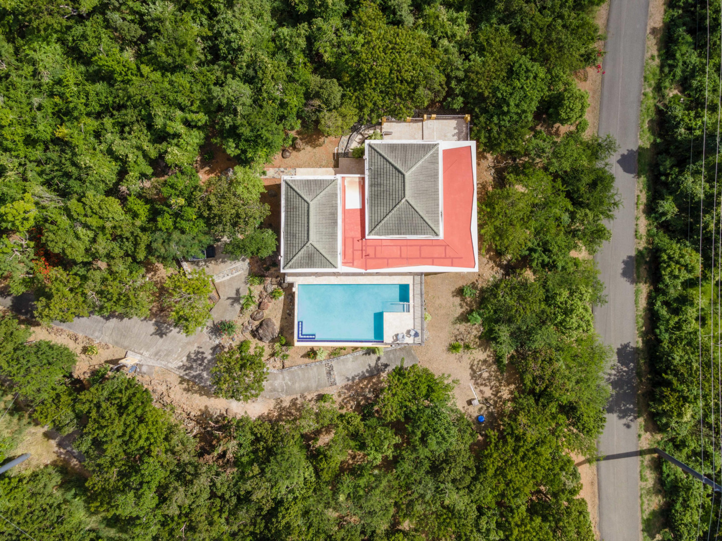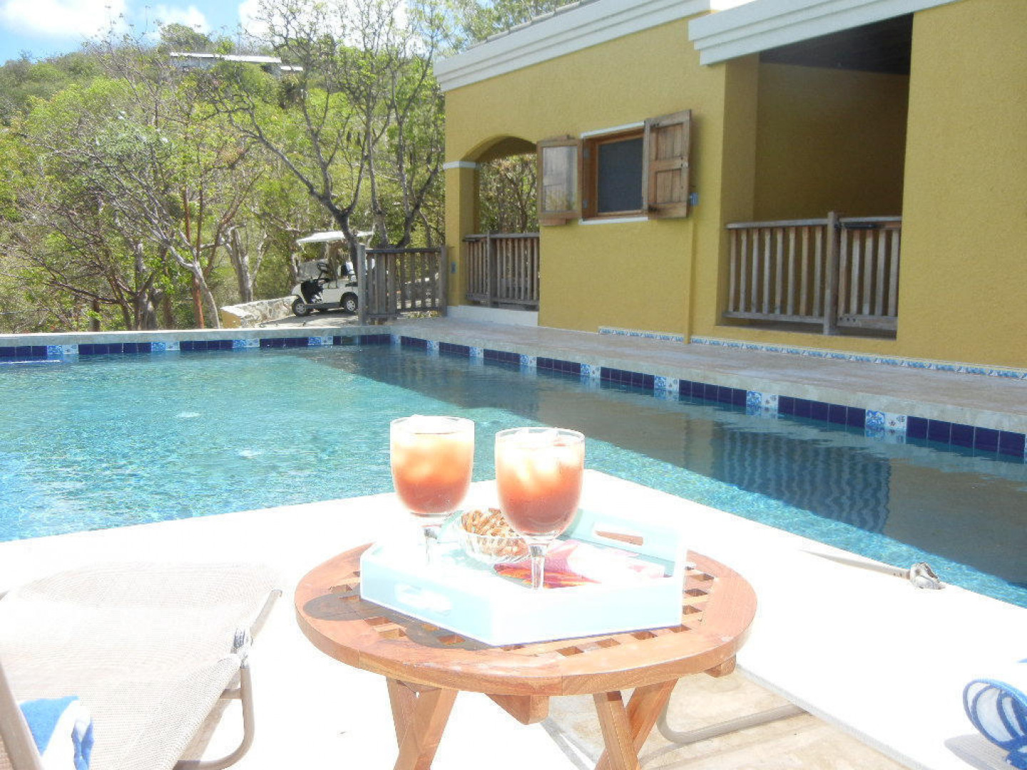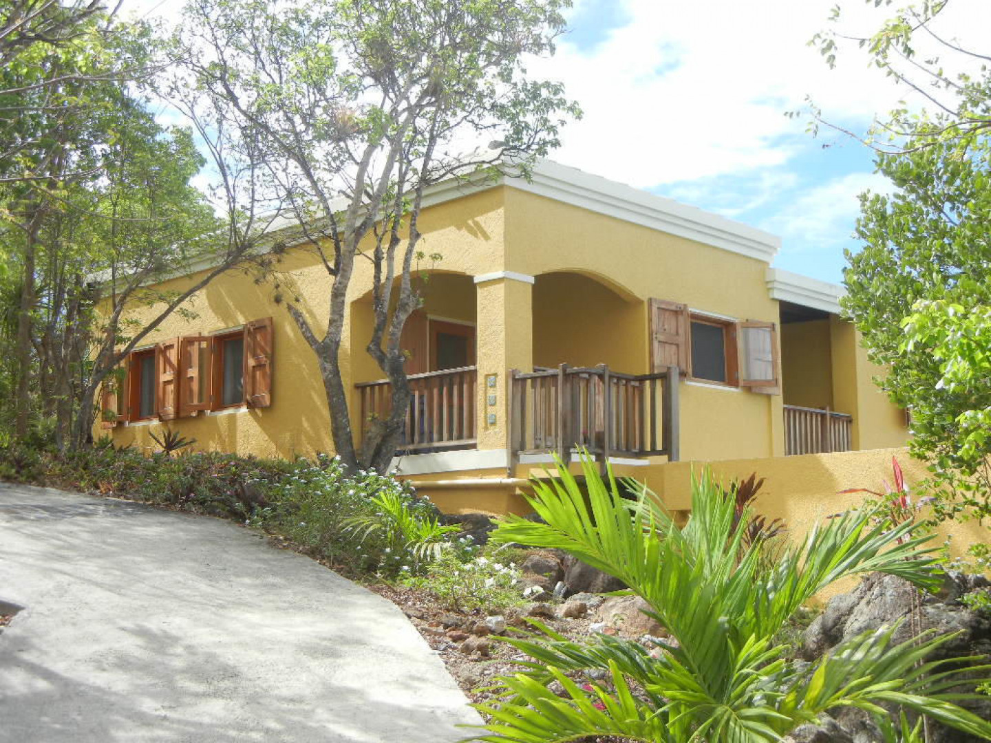 Villa Papaya, Water Island. Executive home (built in 2010) with 2BR/2BA, custom interior, cast concrete construction. Large 38' pool. .77 acres overlooking Honeymoon Beach. Mahogany cabinetry, custom cypress windows and hurricane shutters, coral stone flooring, and Monier Life Tile roofing. Garden apartment (kitchen, BR/BA, living room) under the house awaits refinishing. Caribbean architecture enhances the beauty of Villa Papaya.