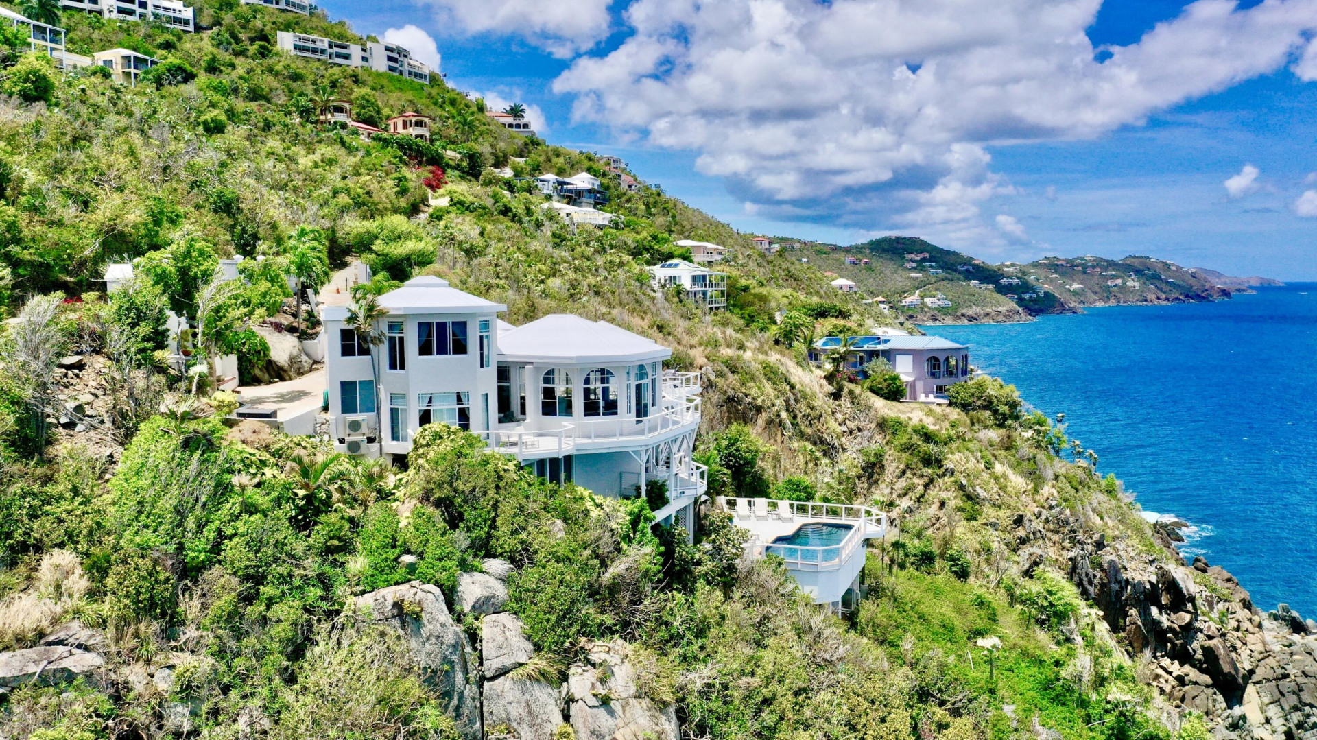 Spectacular 4 bedroom 4 bath waterfront villa in the gated community of Mahogany Run. Located on the cliffs in Lovenlund looking North over the Atlantic Ocean. Amazing Hans Lollik & down island views from the spacious wrap around deck. The pool is located down closer to the water in a stunning setting. PGT hurricane doors & windows, Automatic Generator. The property is fenced & has an electronic gate for maximum privacy. Only 5-10min to Magens Bay Beach, 10-15min to RedHook. Great for family use or short term rental.
