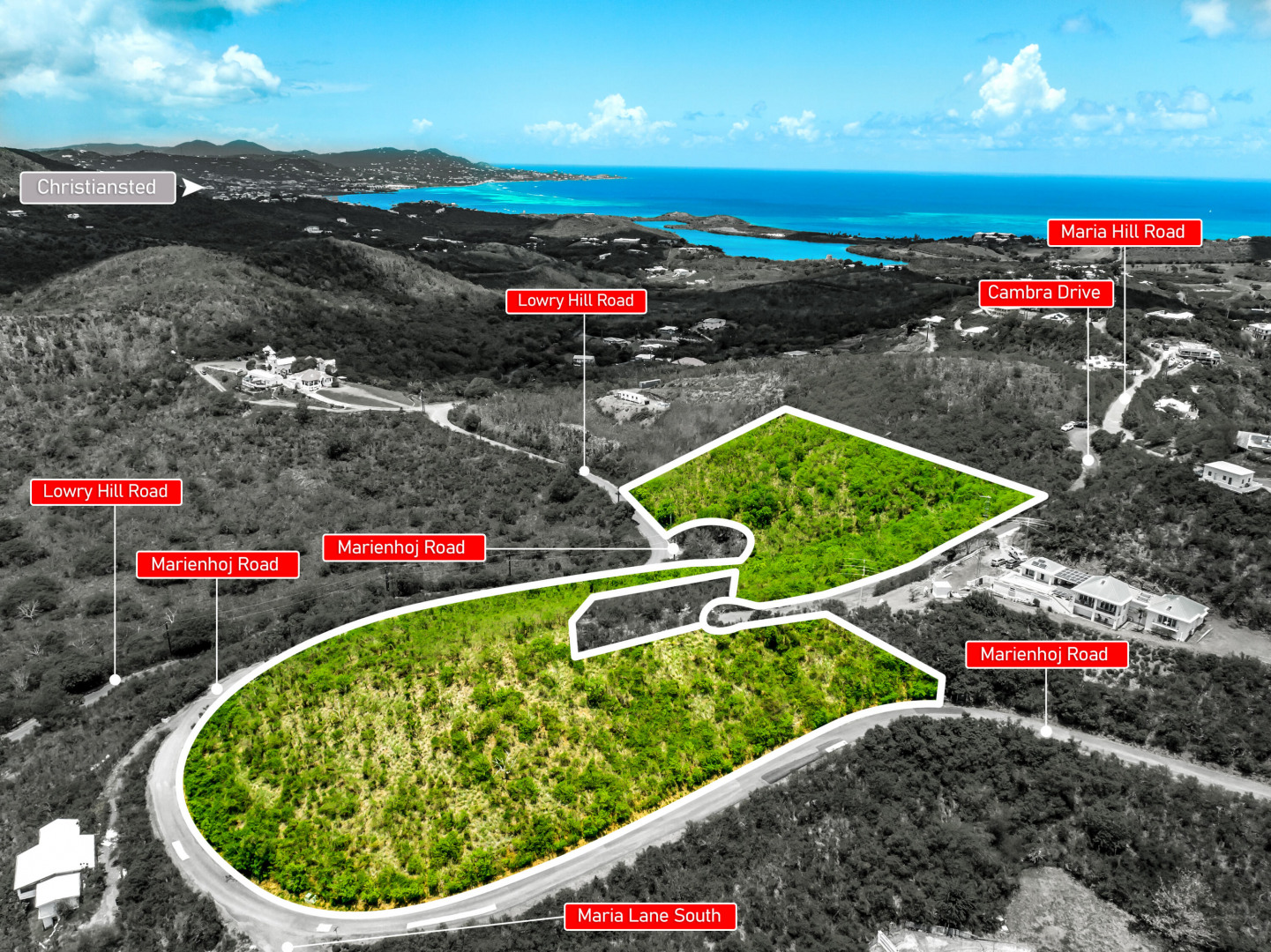 Gorgeous and very buildable lots in a neighborhood of lovely homes with paved roads and underground utilities! Convenient location just east of Christiansted with a view of Great Pond, the south shore, the blue Caribbean Sea, and lush rolling hillsides. These large lots are bordered by two paved roads for ease of building. Build your island dream home - great location, and great view! Lots are sold either together, or separately. See listings 22-1560 and 22-1581.