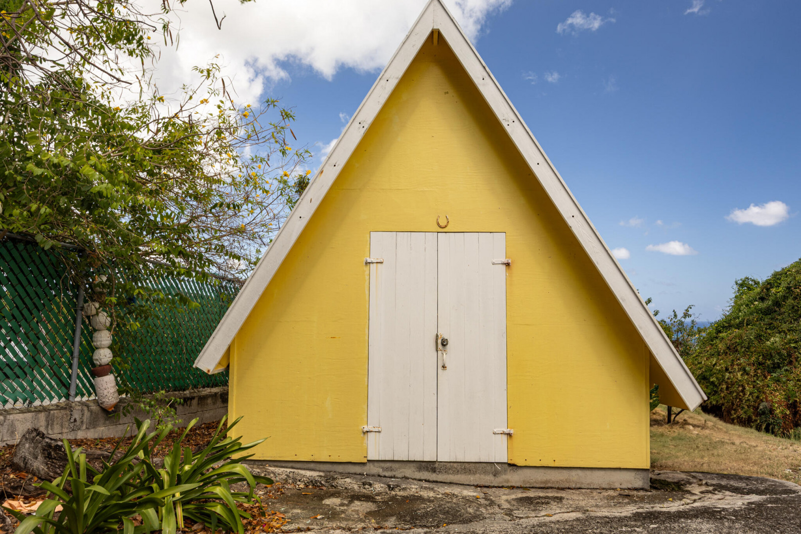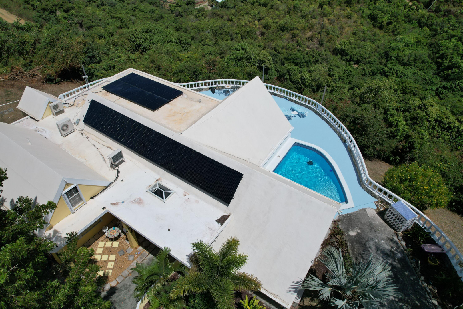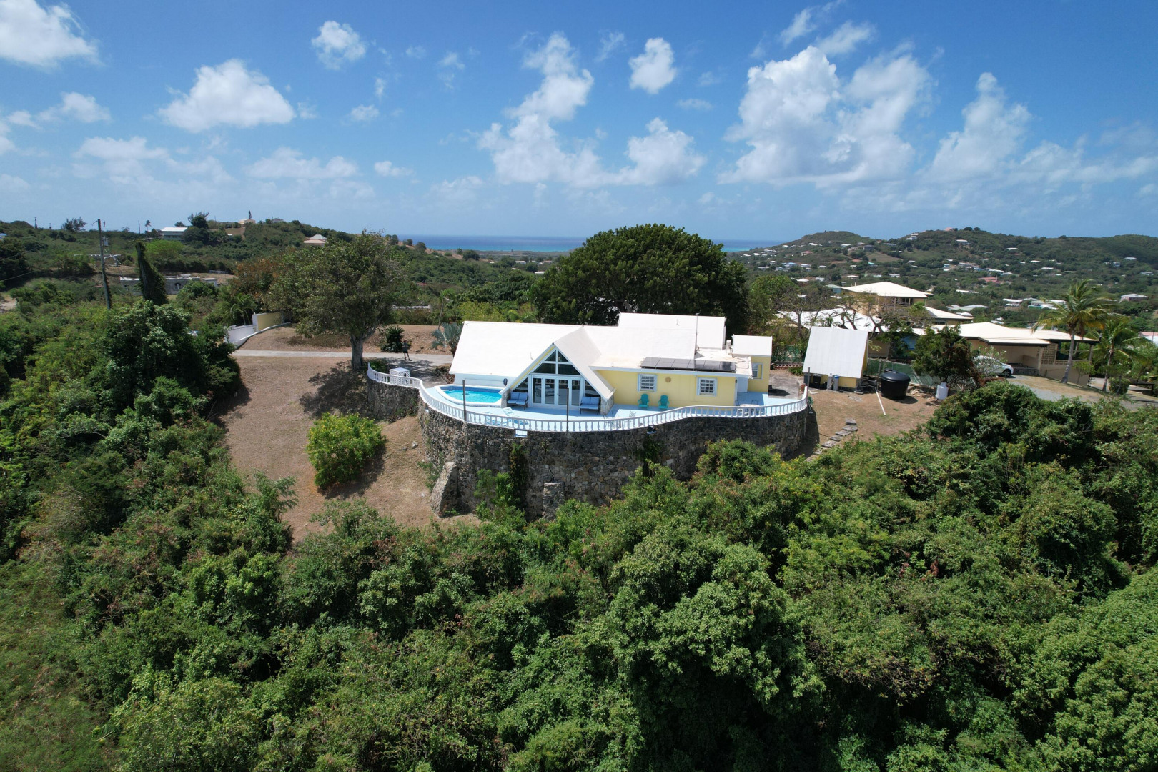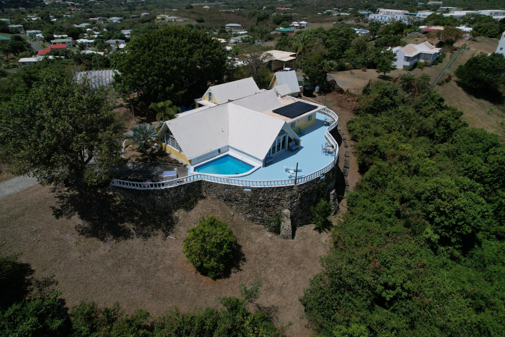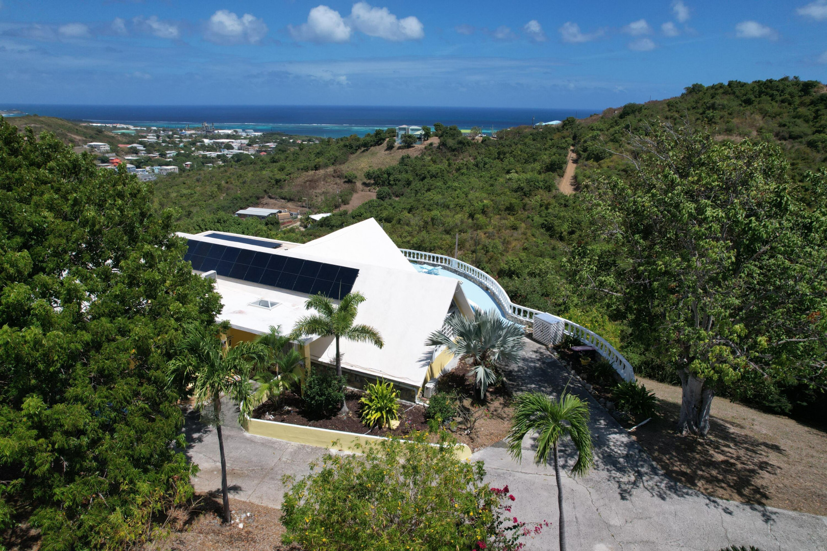 Stunning Custom A-Frame with Caribbean ViewsDesigned by Dick Speas, this 3-bedroom, 3-bathroom custom-built Chalet style A-frame home blends modern efficiency with island charm. Enjoy breathtaking north-facing views of the Caribbean Sea across a lush tropical landscape. Featuring Danish brick and coral accents throughout, this meticulously maintained property is a true island retreat.Sustainability meets comfort with 24 solar panels and triple Tesla batteries, and a 16kW Generac propane generator with an auto-transfer switch. Recent upgrades include all-new AC units in the bedrooms and kitchen, new ceiling fans, and updated appliances. A solar-powered gated entry ensures privacy and convenience. Relax on the spacious outdoor patio and take in the beauty of island living