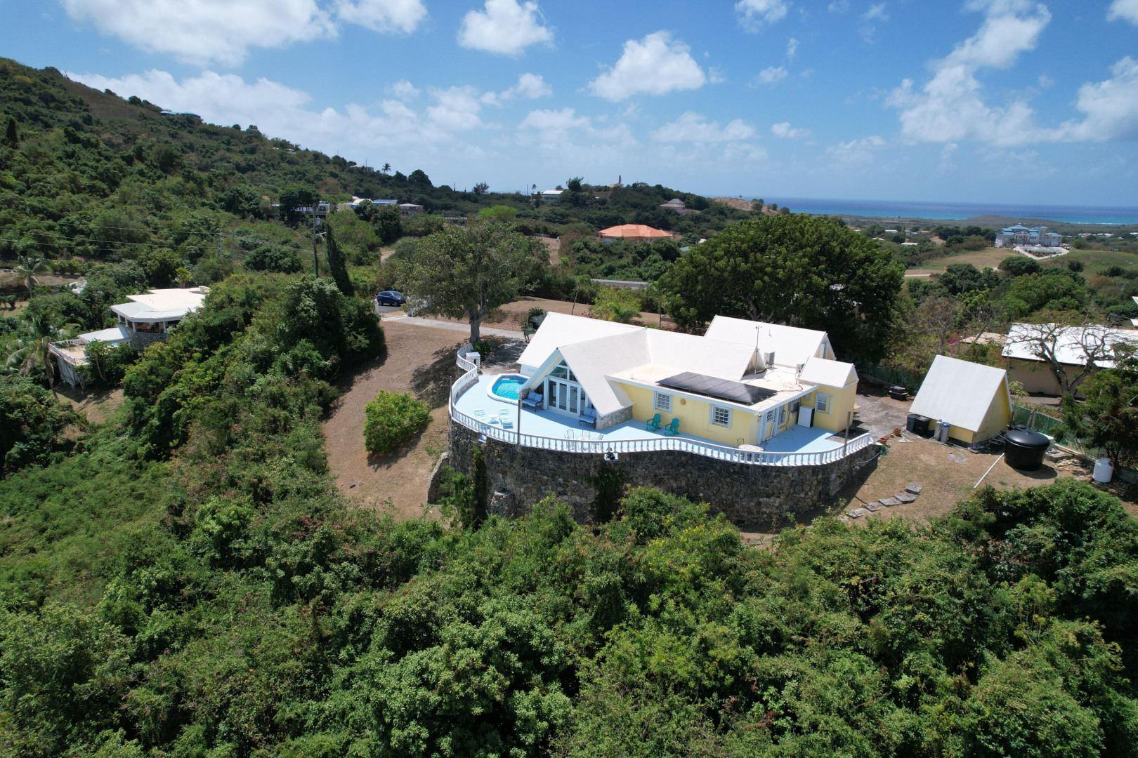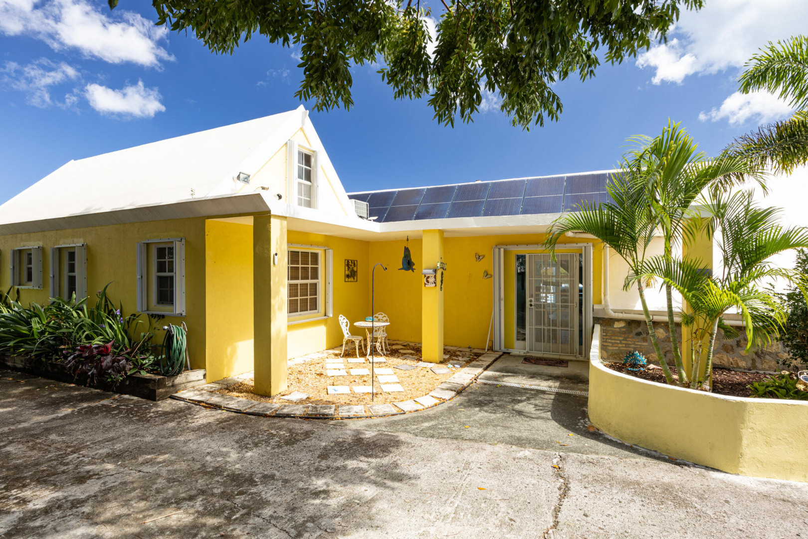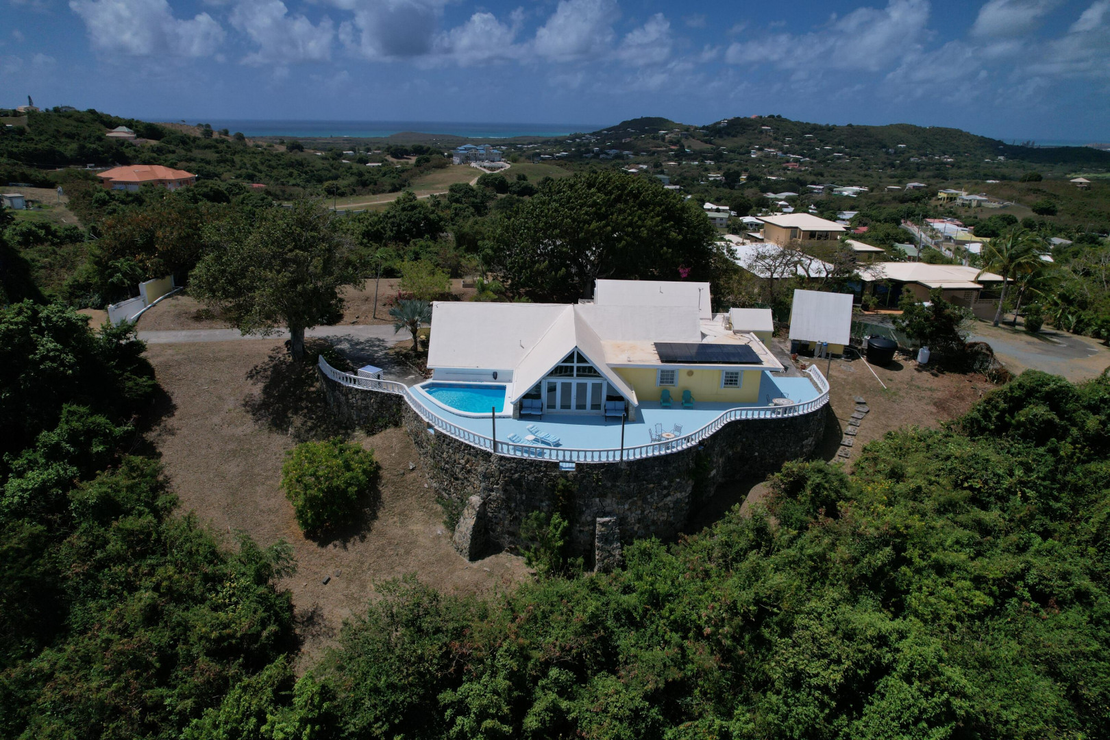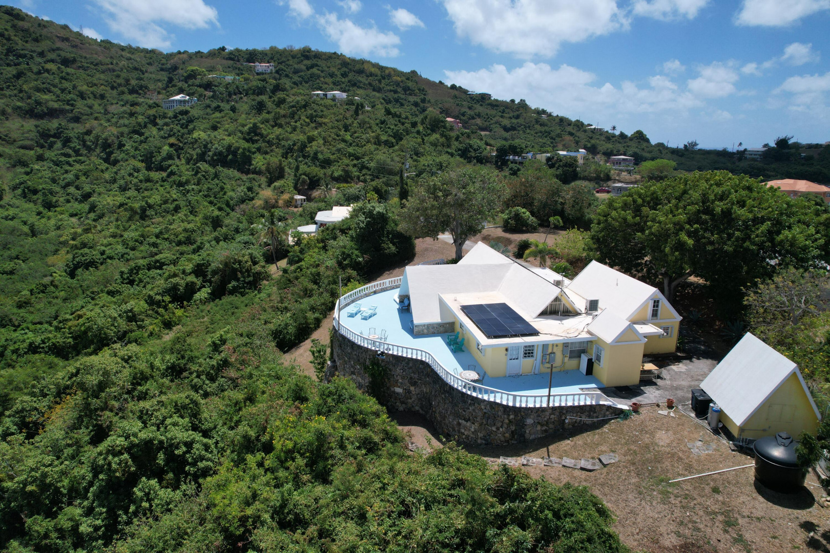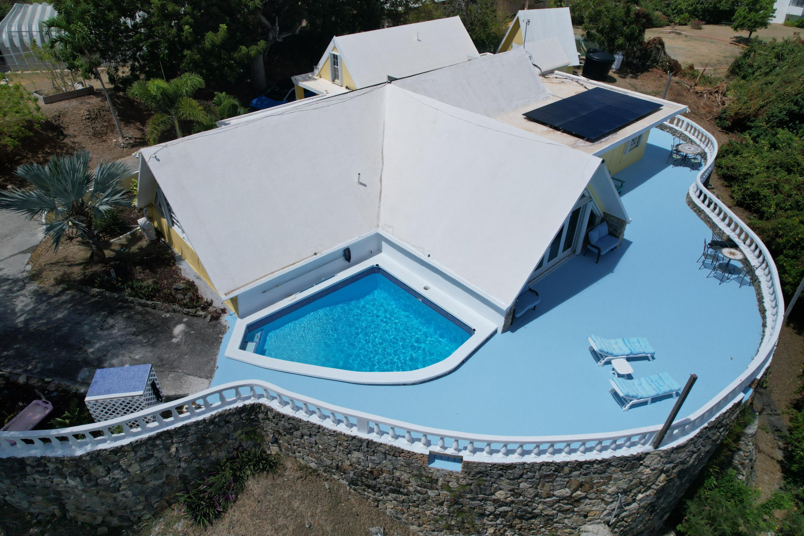 Stunning Custom A-Frame with Caribbean ViewsDesigned by Dick Speas, this 3-bedroom, 3-bathroom custom-built Chalet style A-frame home blends modern efficiency with island charm. Enjoy breathtaking north-facing views of the Caribbean Sea across a lush tropical landscape. Featuring Danish brick and coral accents throughout, this meticulously maintained property is a true island retreat.Sustainability meets comfort with 24 solar panels and triple Tesla batteries, and a 16kW Generac propane generator with an auto-transfer switch. Recent upgrades include all-new AC units in the bedrooms and kitchen, new ceiling fans, and updated appliances. A solar-powered gated entry ensures privacy and convenience. Relax on the spacious outdoor patio and take in the beauty of island living