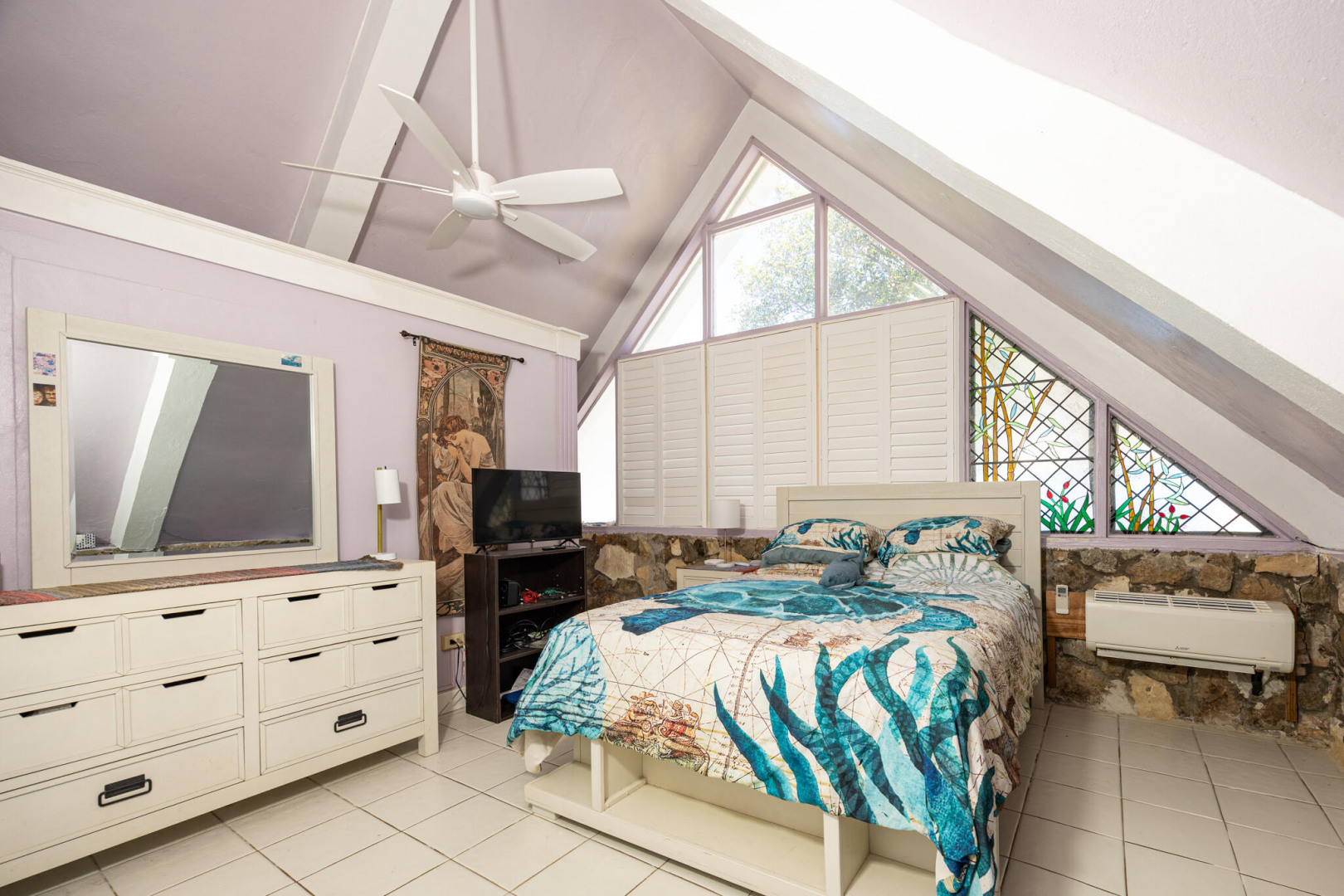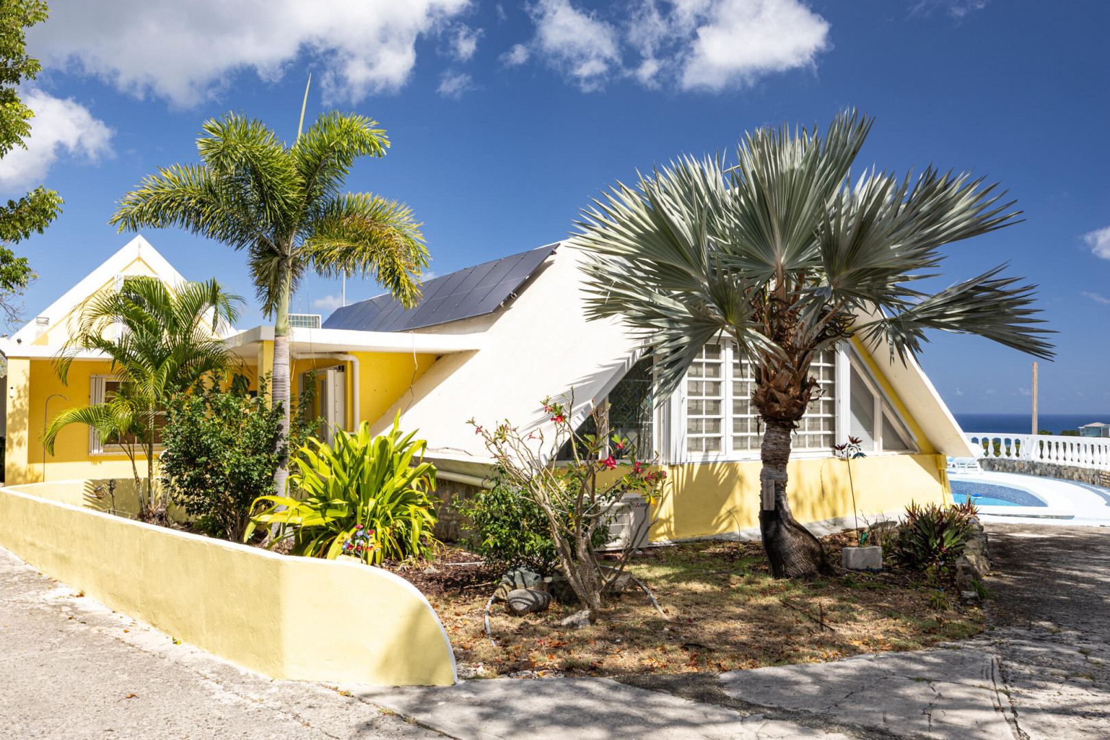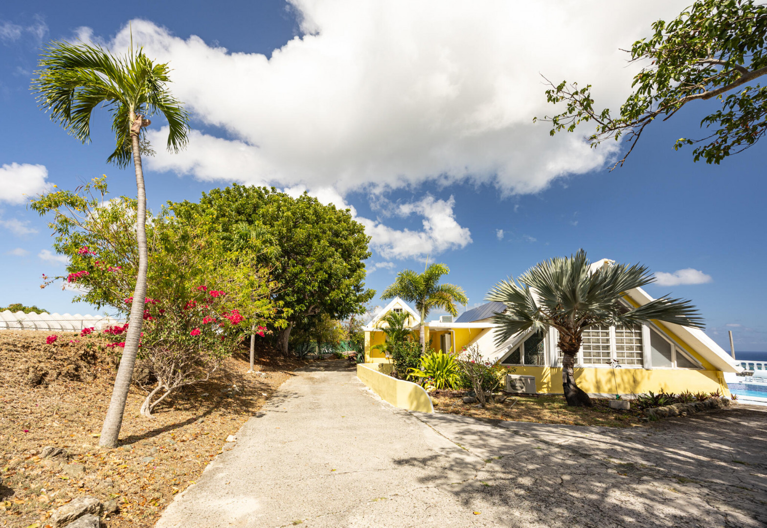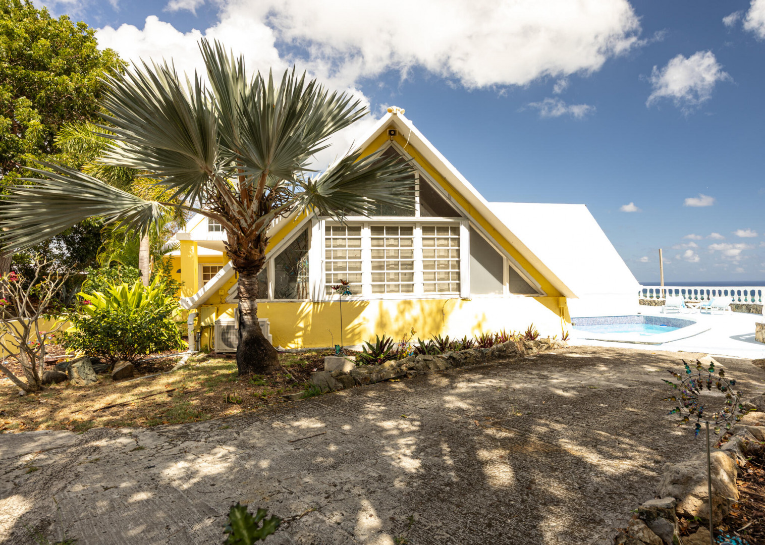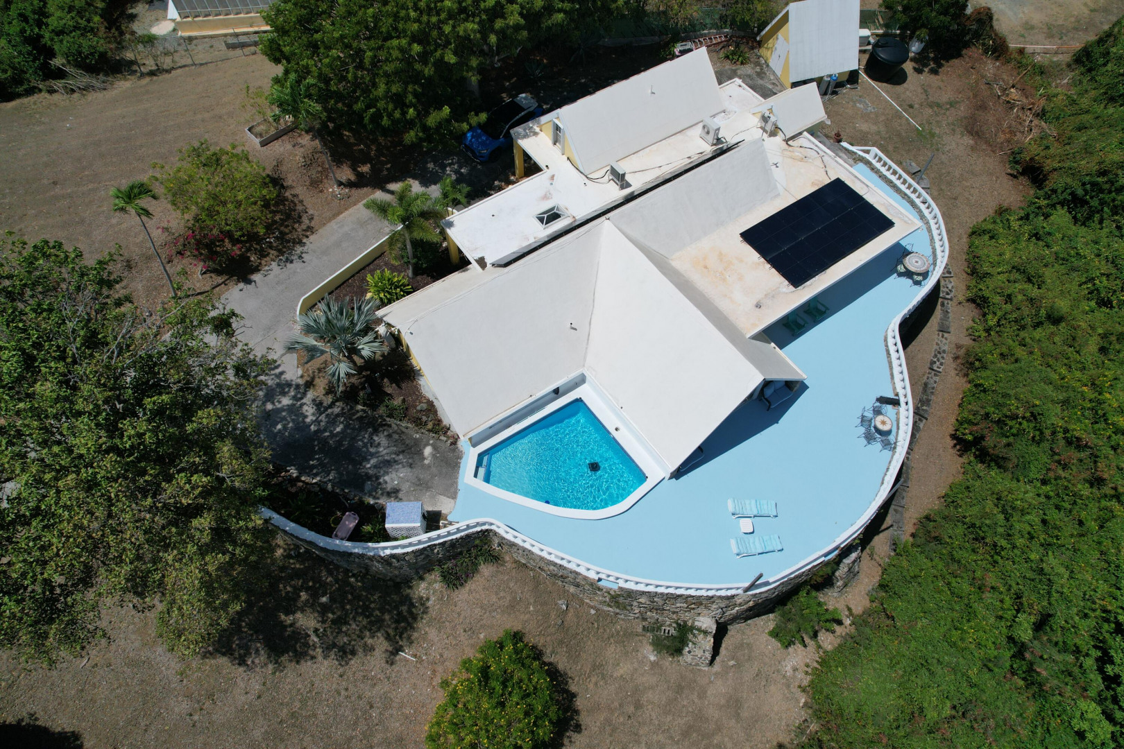 Stunning Custom A-Frame with Caribbean ViewsDesigned by Dick Speas, this 3-bedroom, 3-bathroom custom-built Chalet style A-frame home blends modern efficiency with island charm. Enjoy breathtaking north-facing views of the Caribbean Sea across a lush tropical landscape. Featuring Danish brick and coral accents throughout, this meticulously maintained property is a true island retreat.Sustainability meets comfort with 24 solar panels and triple Tesla batteries, and a 16kW Generac propane generator with an auto-transfer switch. Recent upgrades include all-new AC units in the bedrooms and kitchen, new ceiling fans, and updated appliances. A solar-powered gated entry ensures privacy and convenience. Relax on the spacious outdoor patio and take in the beauty of island living