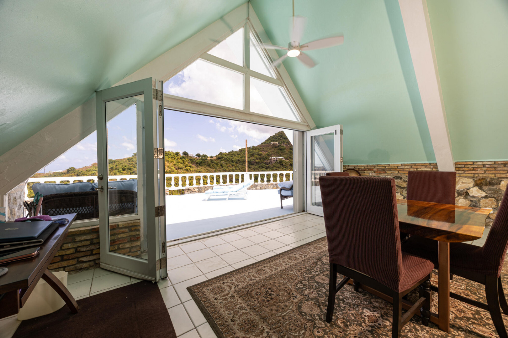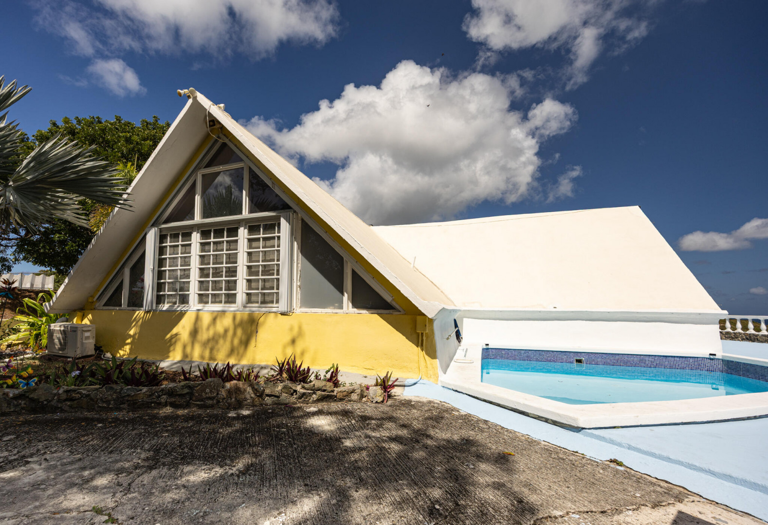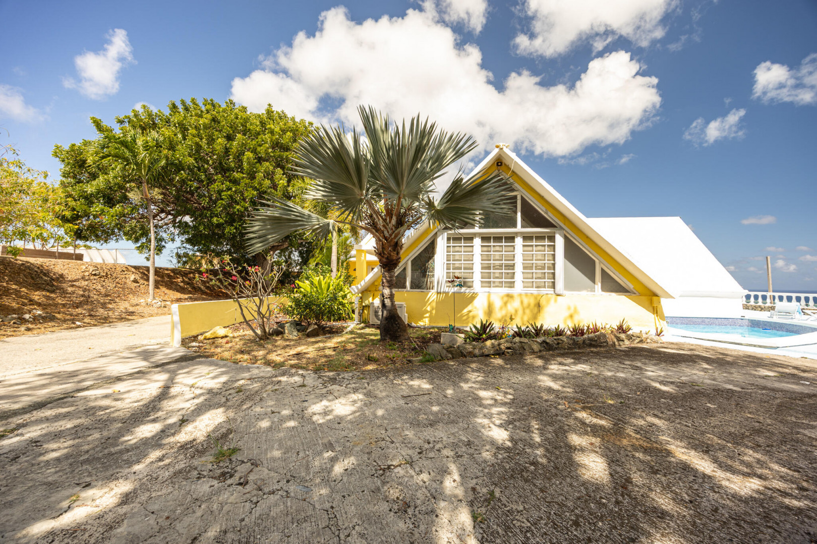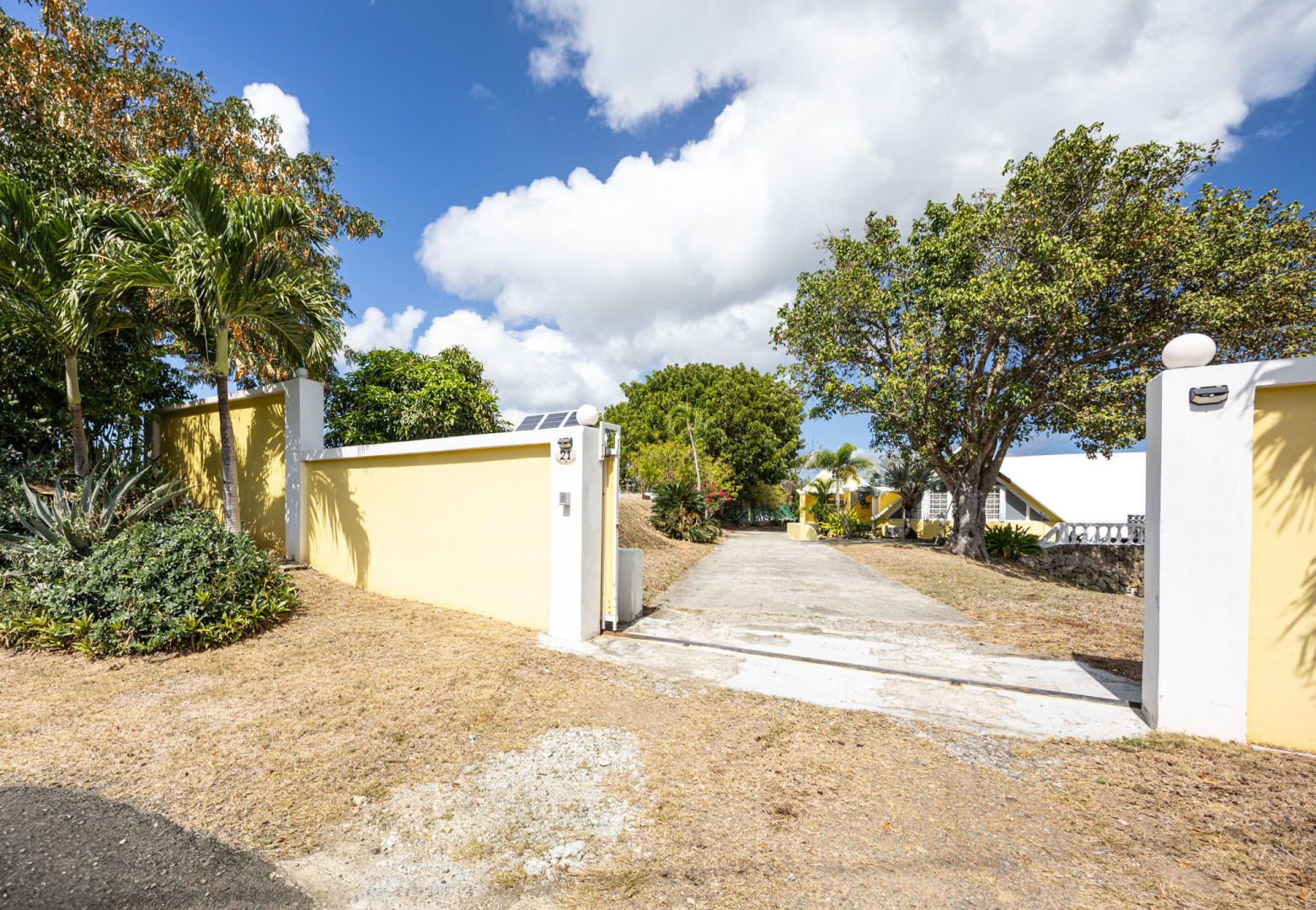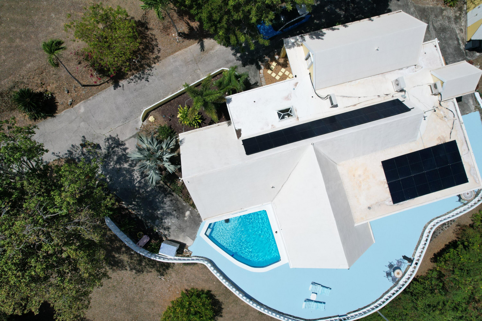 Stunning Custom A-Frame with Caribbean ViewsDesigned by Dick Speas, this 3-bedroom, 3-bathroom custom-built Chalet style A-frame home blends modern efficiency with island charm. Enjoy breathtaking north-facing views of the Caribbean Sea across a lush tropical landscape. Featuring Danish brick and coral accents throughout, this meticulously maintained property is a true island retreat.Sustainability meets comfort with 24 solar panels and triple Tesla batteries, and a 16kW Generac propane generator with an auto-transfer switch. Recent upgrades include all-new AC units in the bedrooms and kitchen, new ceiling fans, and updated appliances. A solar-powered gated entry ensures privacy and convenience. Relax on the spacious outdoor patio and take in the beauty of island living
