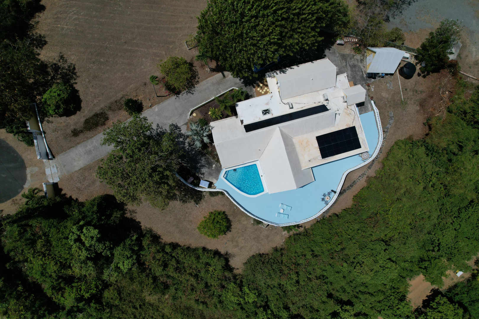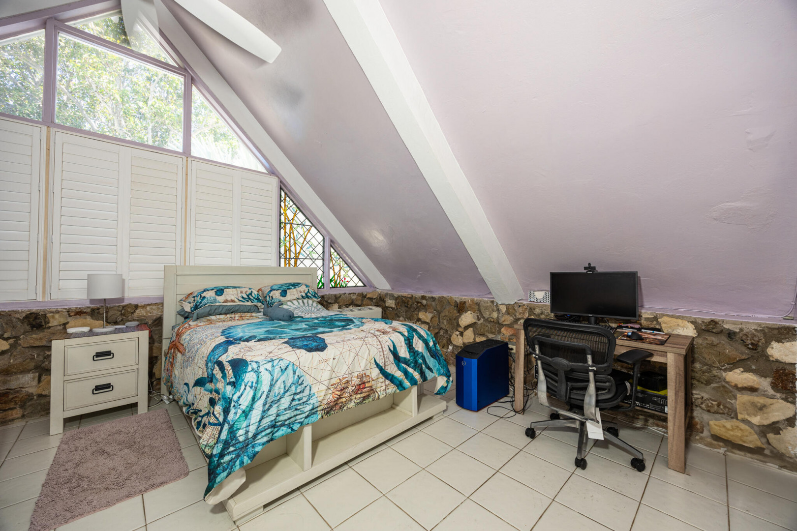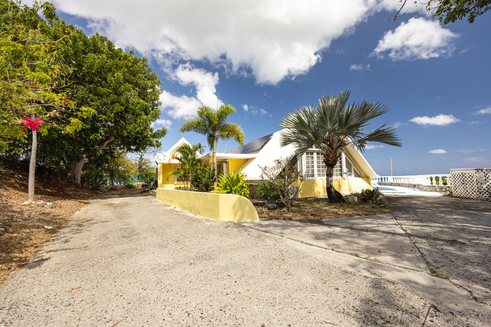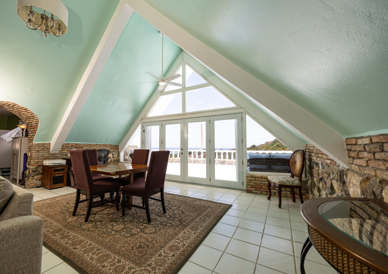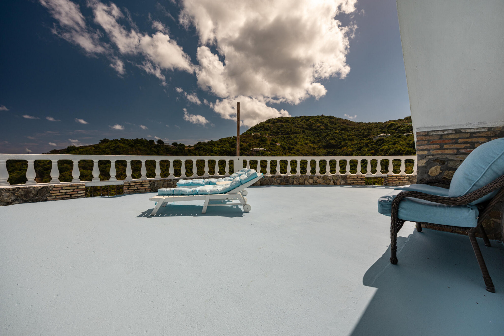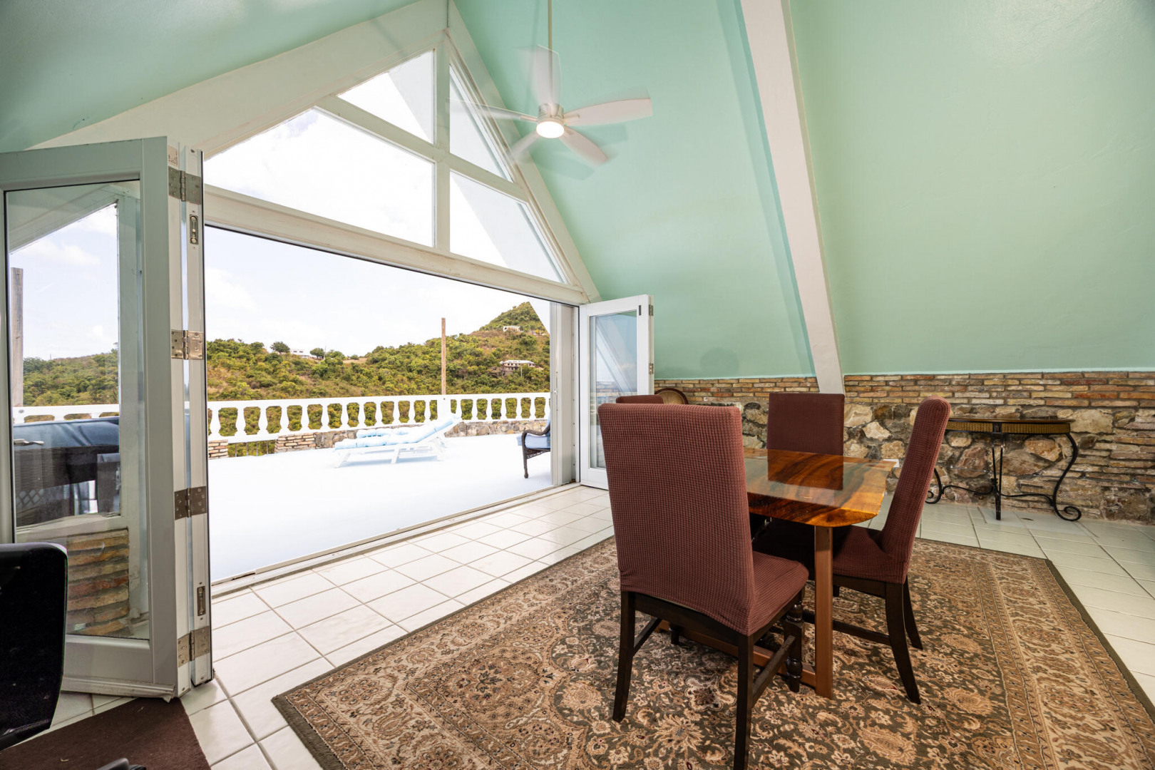Stunning Custom A-Frame with Caribbean ViewsDesigned by Dick Speas, this 3-bedroom, 3-bathroom custom-built Chalet style A-frame home blends modern efficiency with island charm. Enjoy breathtaking north-facing views of the Caribbean Sea across a lush tropical landscape. Featuring Danish brick and coral accents throughout, this meticulously maintained property is a true island retreat.Sustainability meets comfort with 24 solar panels and triple Tesla batteries, and a 16kW Generac propane generator with an auto-transfer switch. Recent upgrades include all-new AC units in the bedrooms and kitchen, new ceiling fans, and updated appliances. A solar-powered gated entry ensures privacy and convenience. Relax on the spacious outdoor patio and take in the beauty of island living