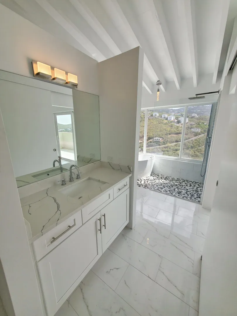 This gorgeous remodeled condo with high end finishes and attention to all details is a must see. Custom front door greets you.Once inside the vaulted ceilings,large living room area just off of the large patio/deck area is perfect for Caribbean indoor/outdoor living. New roof, new electric service and all new appliances,including wine fridge for those special bottles. All new split a/c units. The over sized master bedroom has its own private patio and the bathroom is elegantly designed with soaking tub and frameless shower enclosure. The spacious guest bedroom can easily fit two queen size beds & night stands and has a nook for a sitting area or desk. The entire unit is upgraded with impact sliders and windows.Covered parking space. Large diesel generator with automatic transfer switch.