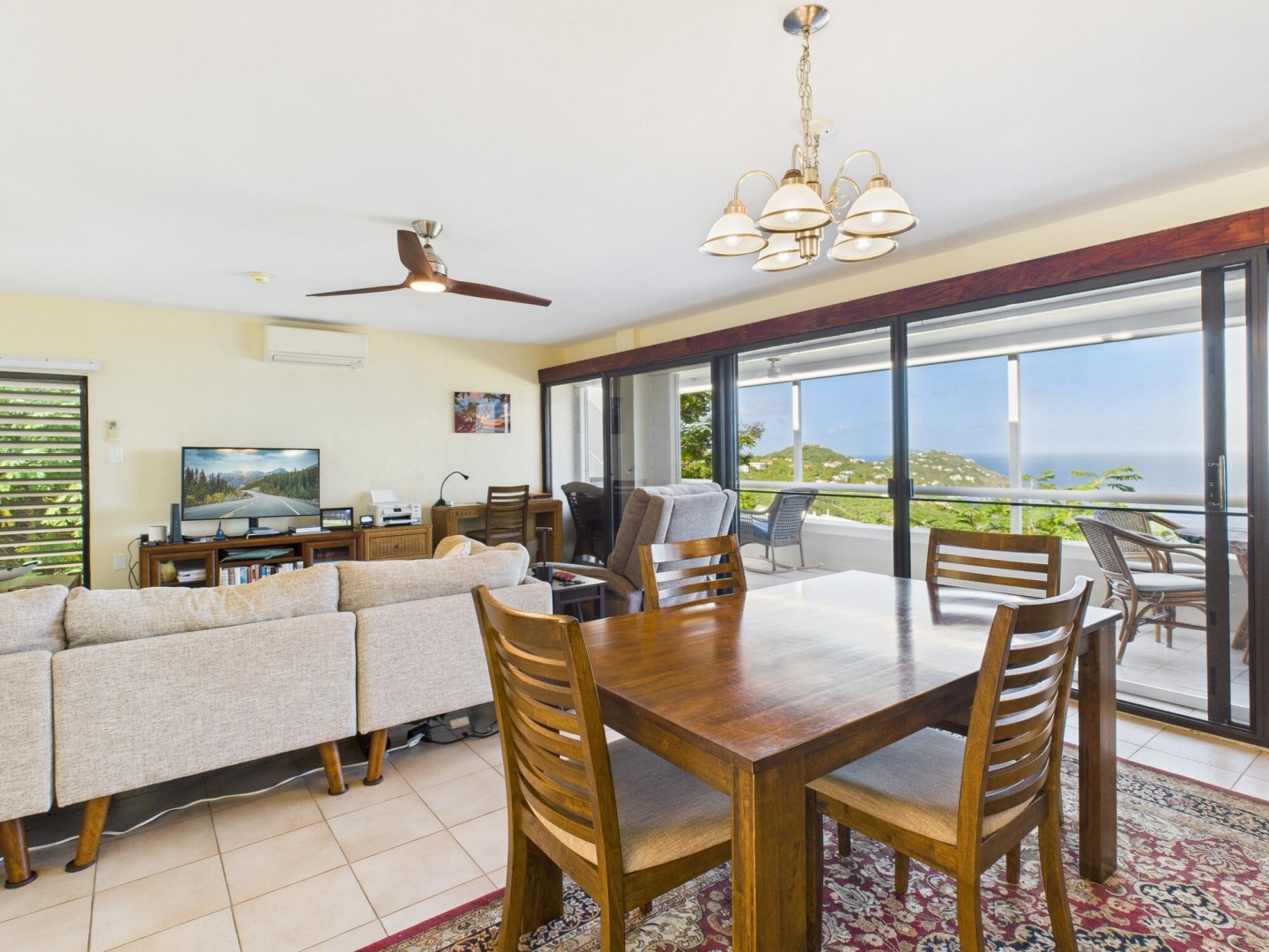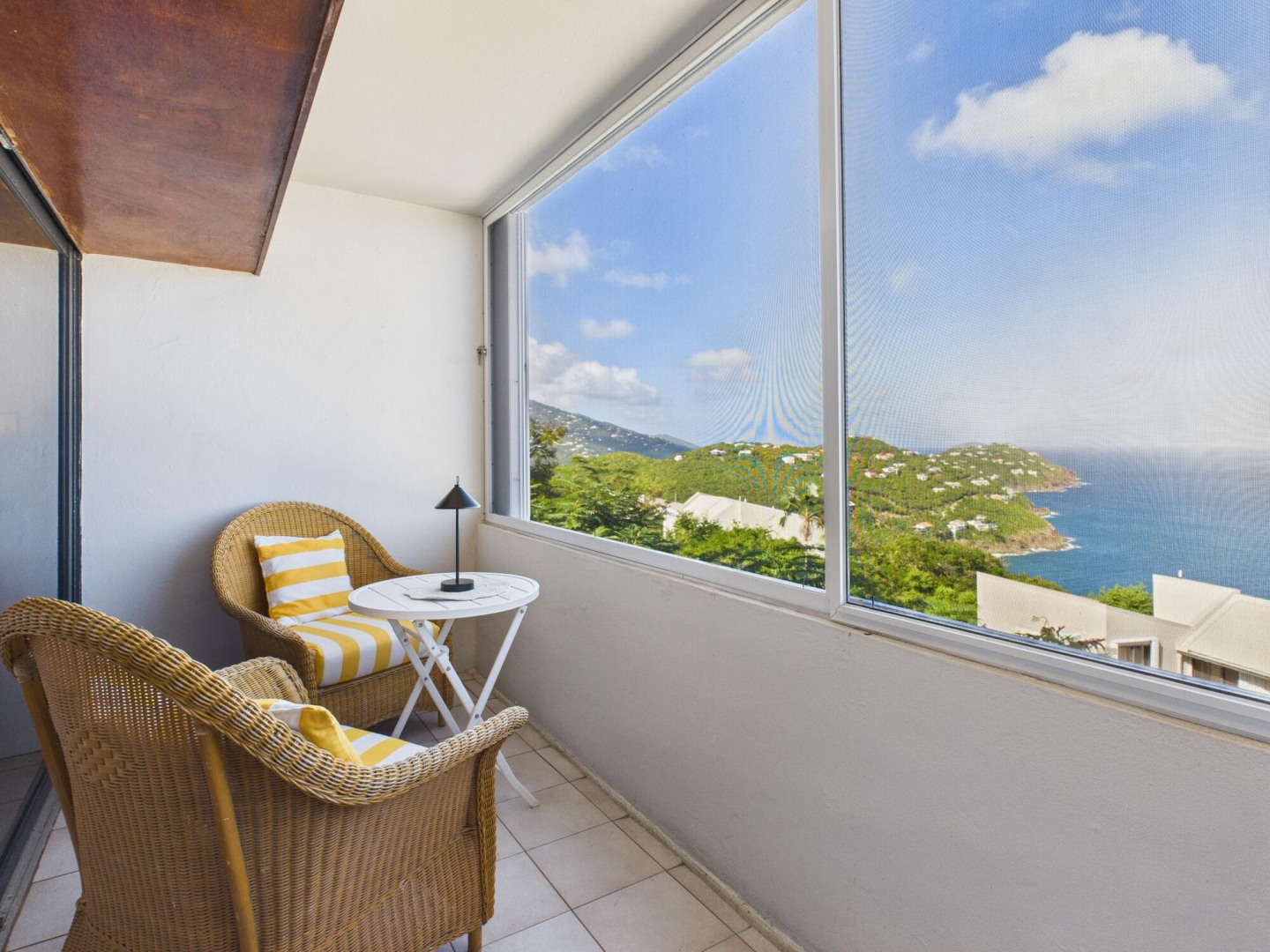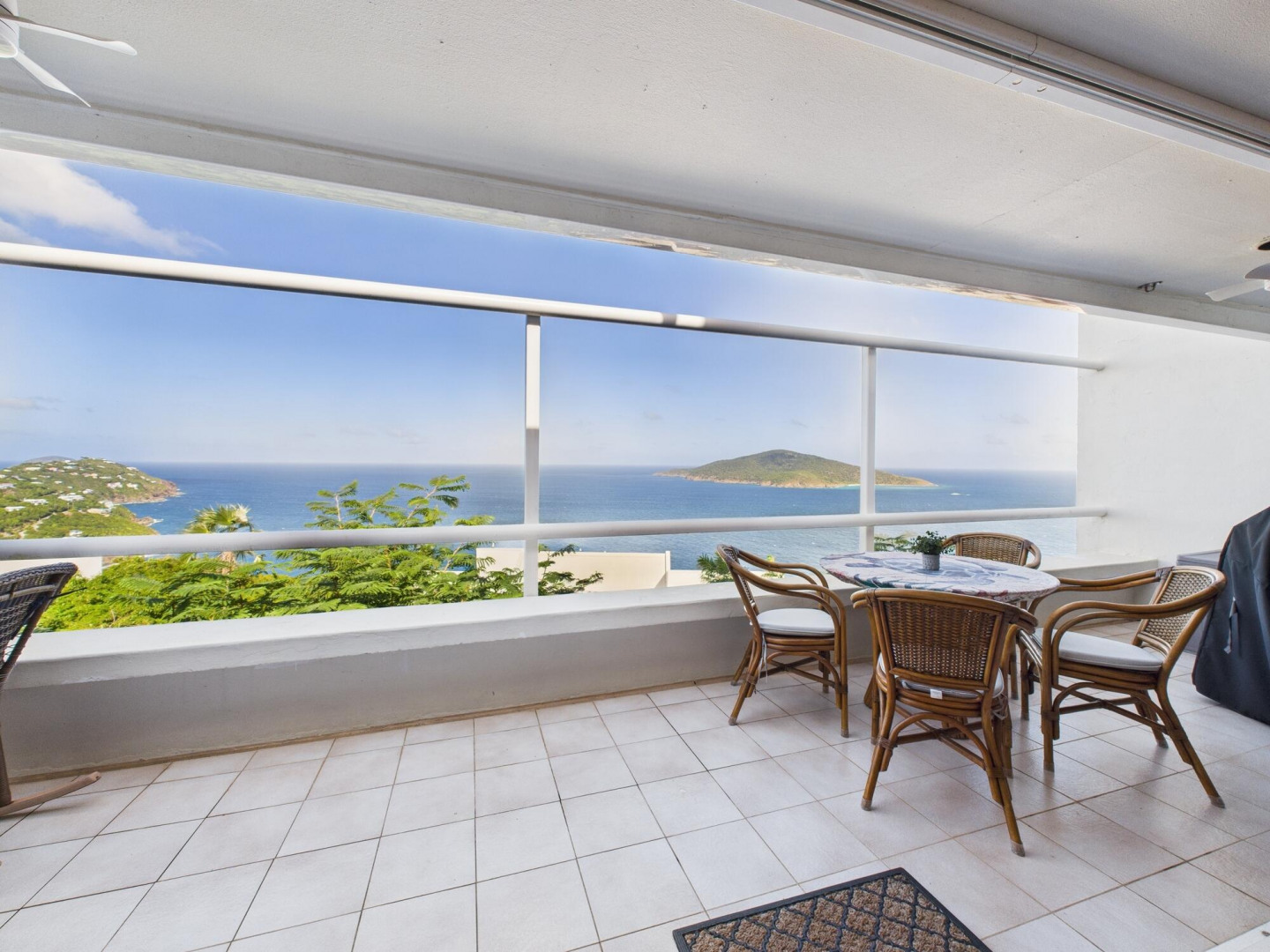 Corner middle unit featuring 2 bedrooms and 2 baths with a covered carport, located on Barbados Circle in gated Mahogany Run. Enjoy views of Hans Lollick from the spacious main patio, perfect for relaxing or entertaining. Each bedroom offers its own private patio--ideal for reading, unwinding, or simply taking in the beautiful scenery. A nearby community swimming pool adds to the resort-style lifestyle. This unit is equipped with battery backup, ensuring you're never inconvenienced during electrical outages.