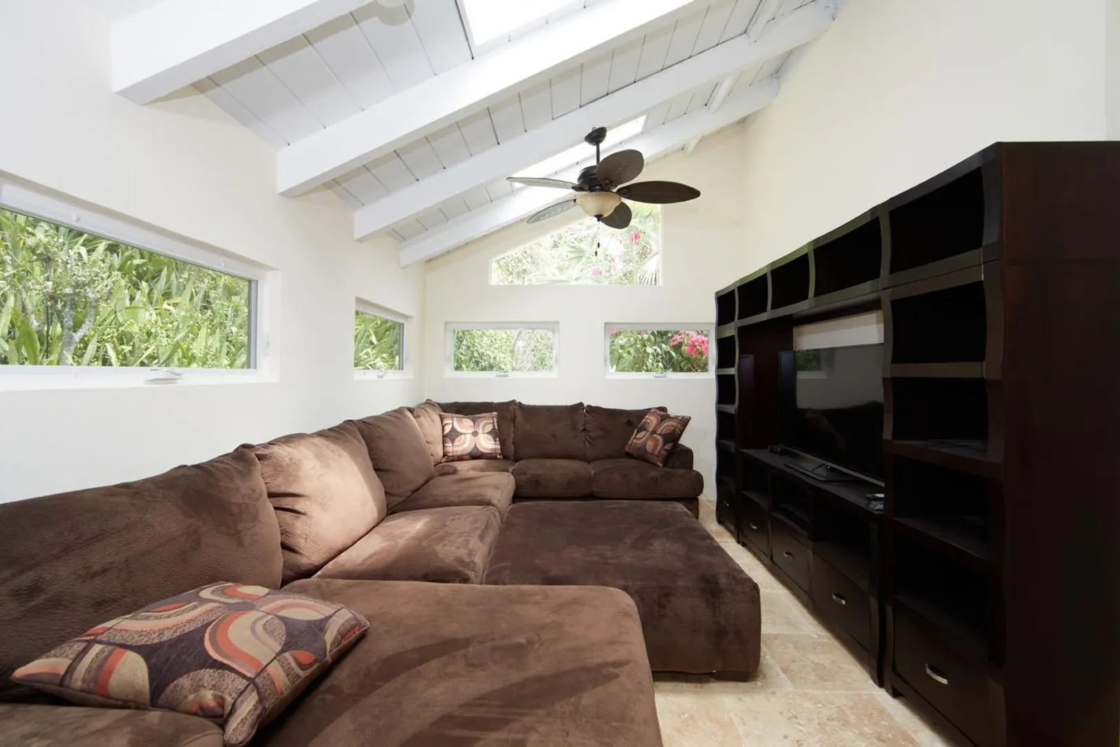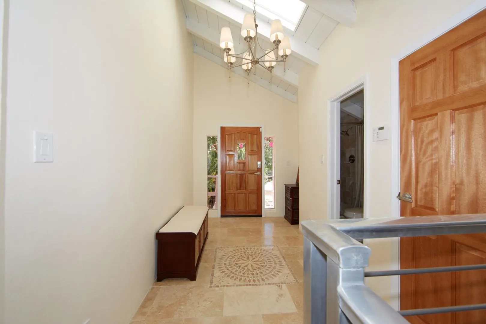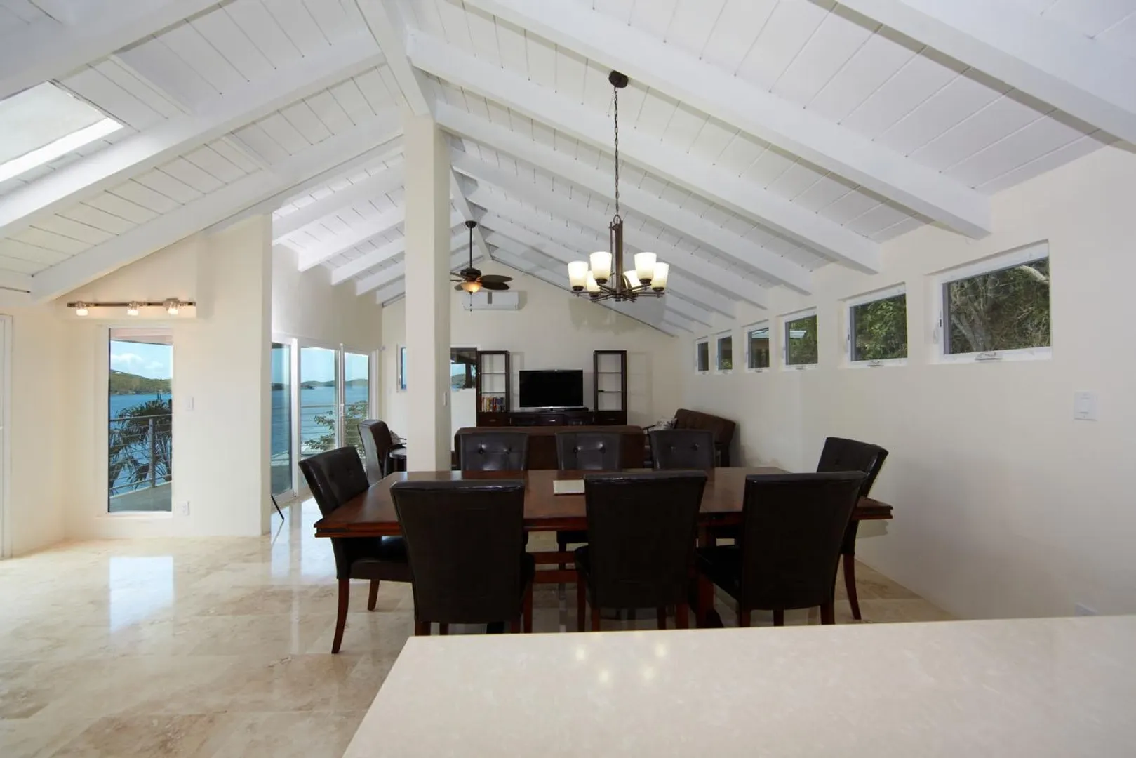 Great sleek looking Villa fully updated. Three bedrooms, 3 baths. Washer/Dryer. Furnished. At the foot of the driveway are the stairs that lead down to the white sandy beach on Magens Bay. Move in ready... just bring your clothes, computer, sundries.... but most of all your swim suit as the beach entrance is at the foot of the driveway... You'll love living here. Look at Photos - all updated interior. IF shorter rental period rental based on $6000/month + utilities for 3 months or there about