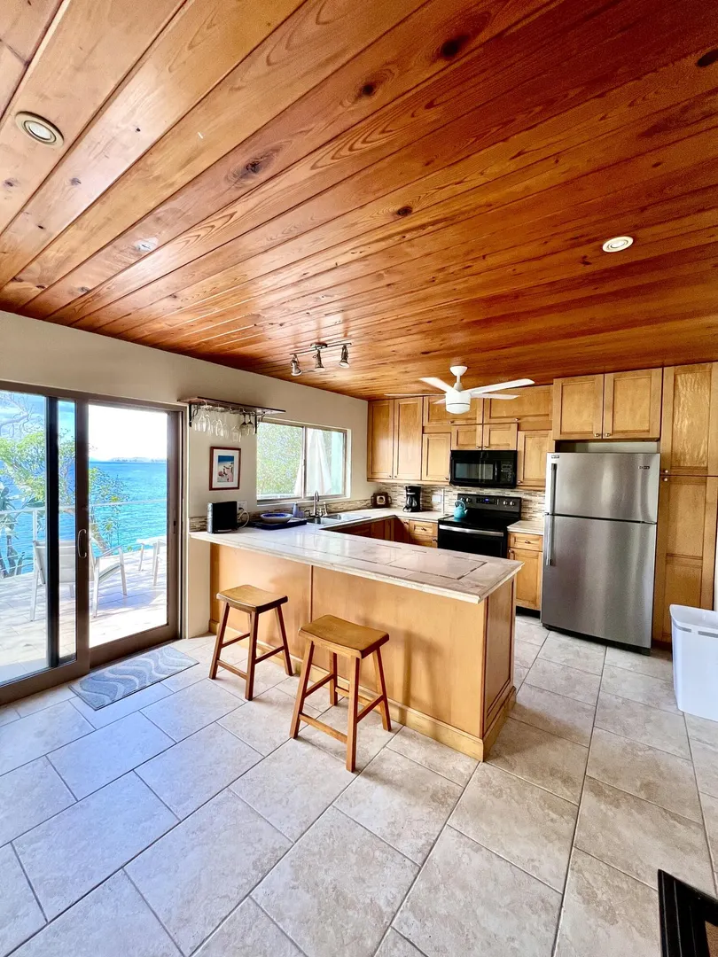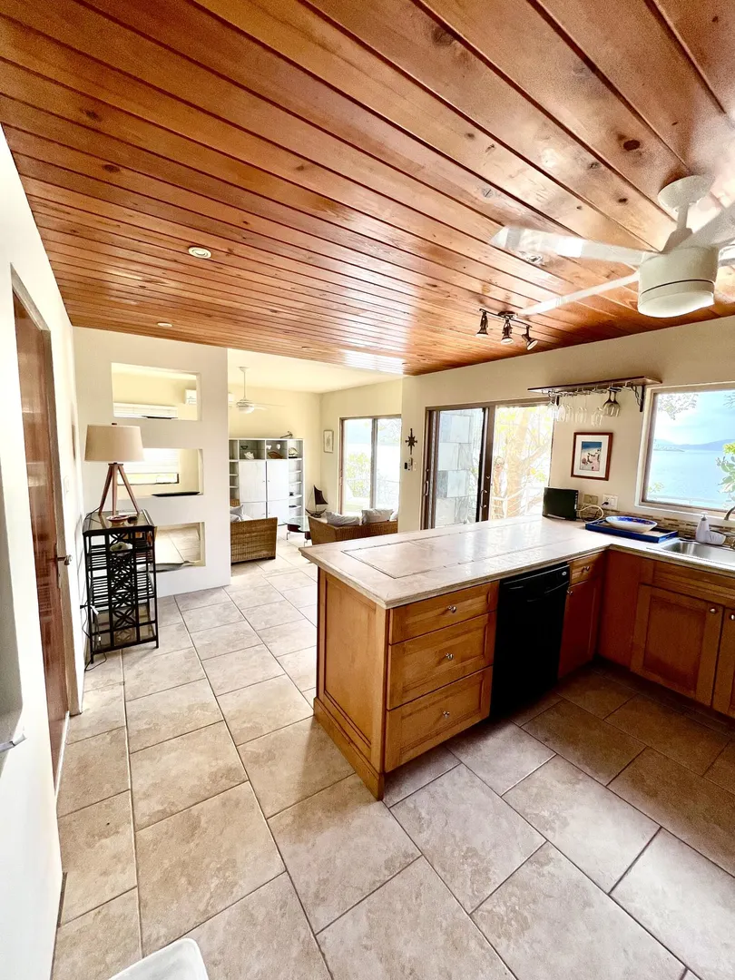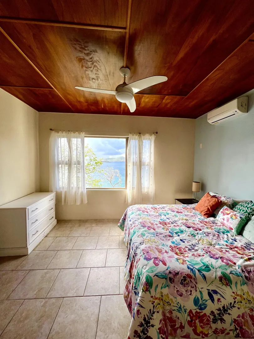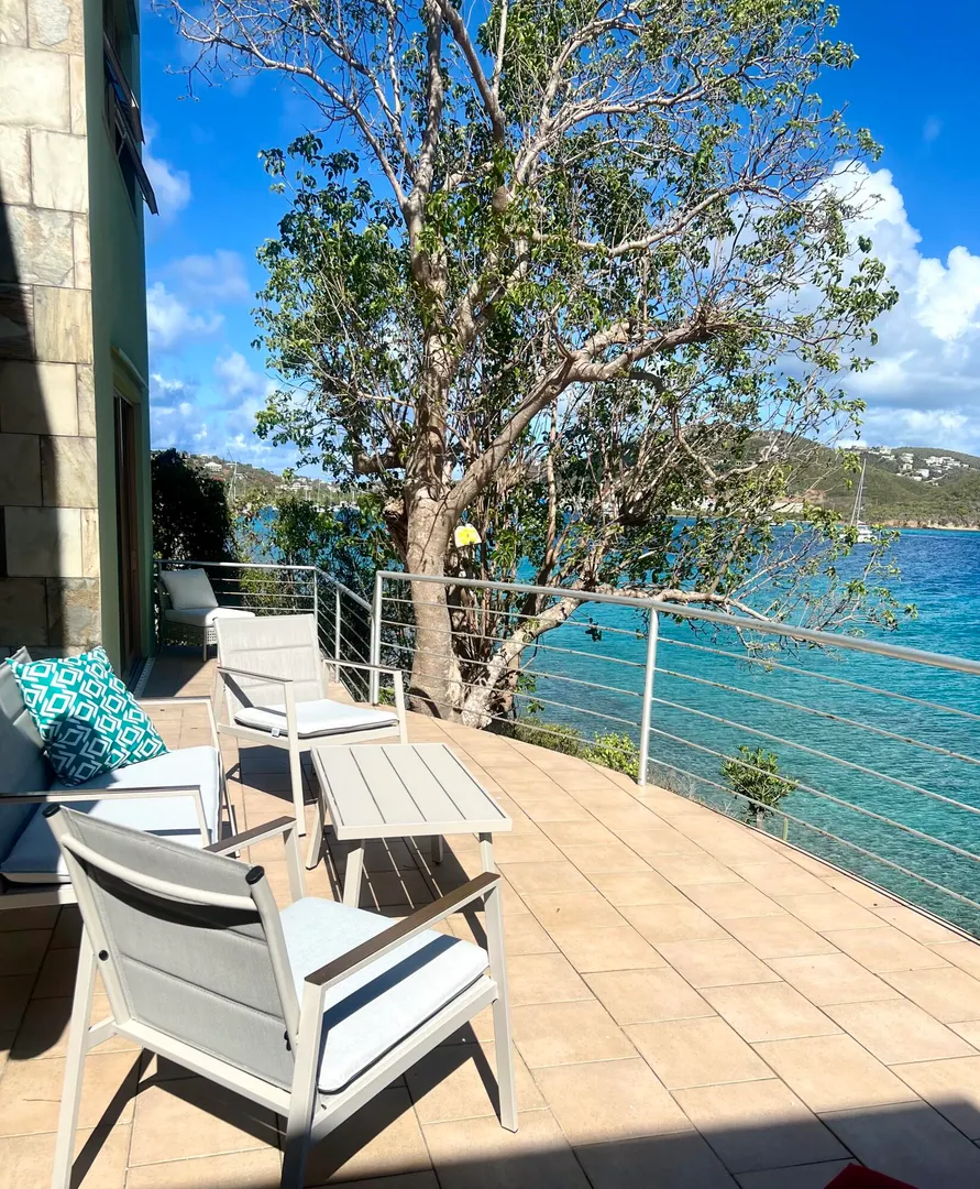 Private Executive Waterfront 2 bedroom/ 2 bath cottage. Fully furnished, W/ D upstairs. Full kitchen with DW. A/ C in bedrooms and downstair living room/dining room. Expansive patio deck overlooking the water, watch all of the boat activity going out of Red Hook. 40 KW generator. References required.