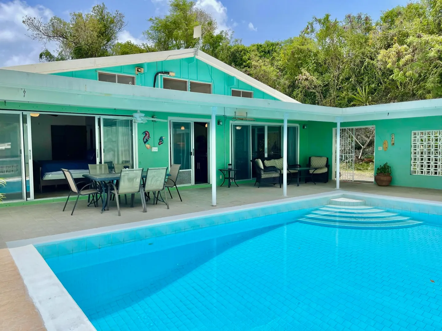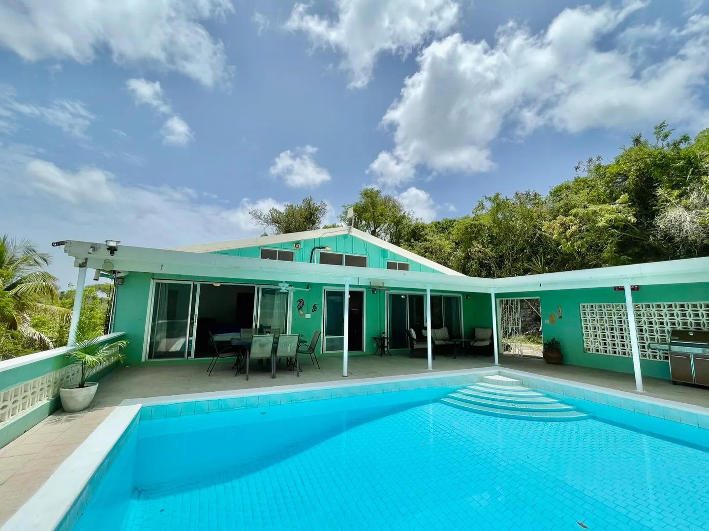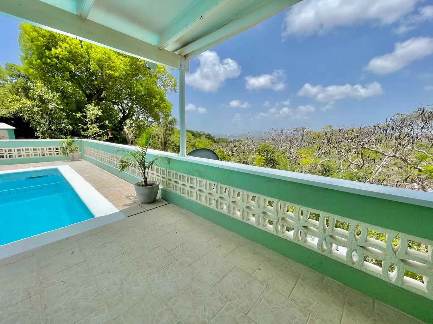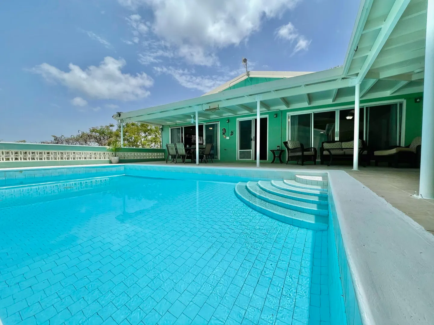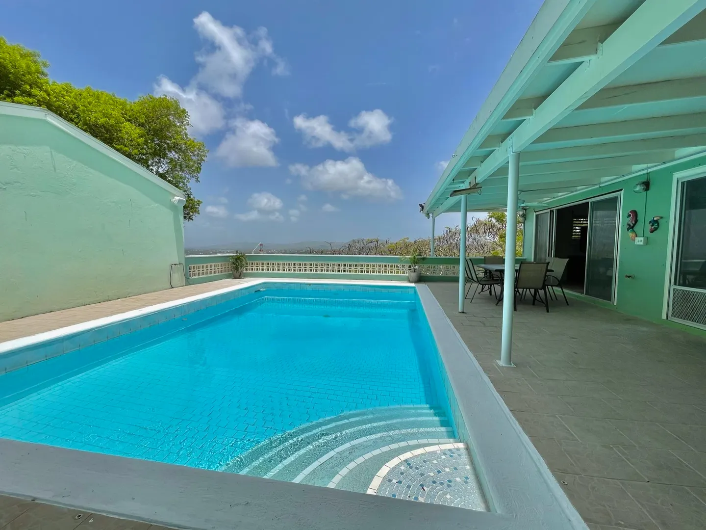 Nestled in the green hills and with beautiful views of the Caribbean Sea, this 3 bedroom 2 bathroom house is private and inviting. The updated kitchen with stainless steel appliances and large kitchen island opens up to the living and dining room. Open the sliding glass doors and enjoy the breeze and inviting pool area. The spacious master bedroom has ensuite bathroom, walk-in closet and its own private access to the pool. The two large additional bedrooms are perfect for hosting guests with its extra Murphy style beds. Cool off in the pool or enjoy dining al fresco under the covered gallery. The garage has ample space for storage and a workshop. The house comes with a 12.5KW - propane generator with 500 gallon tank and solar hot water heater.