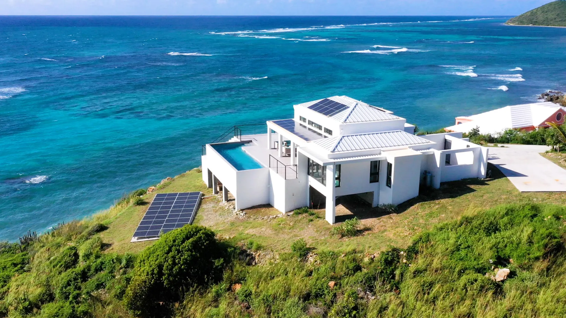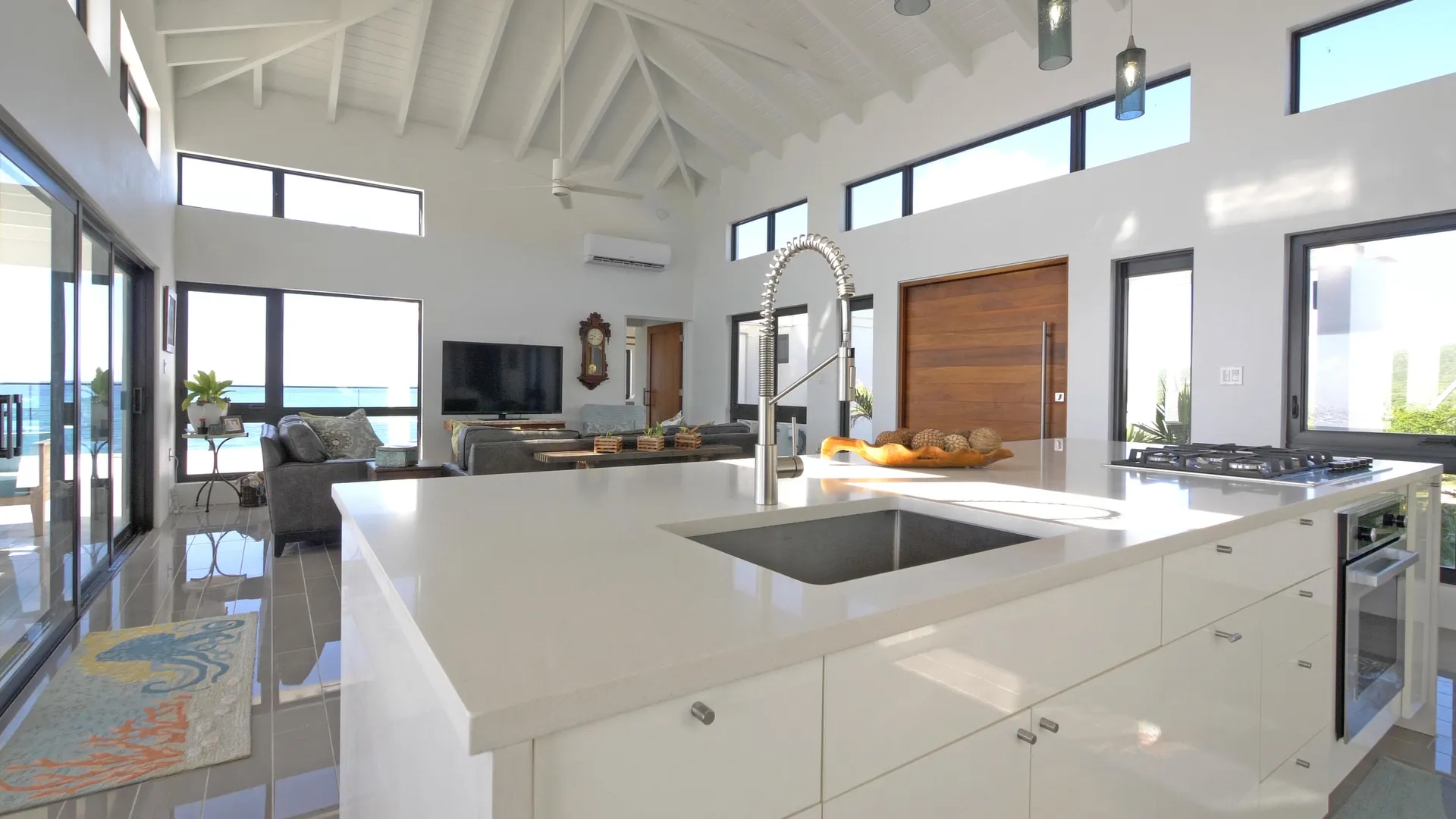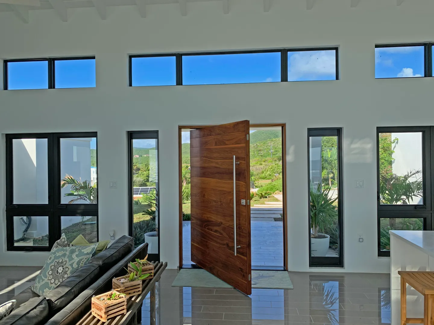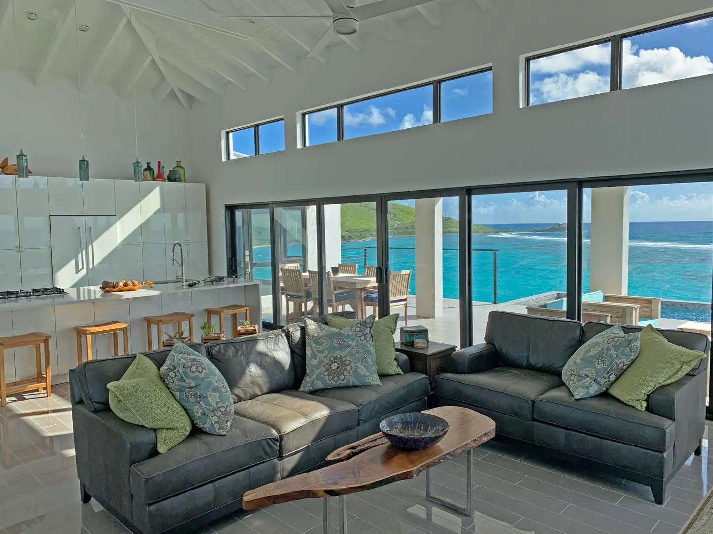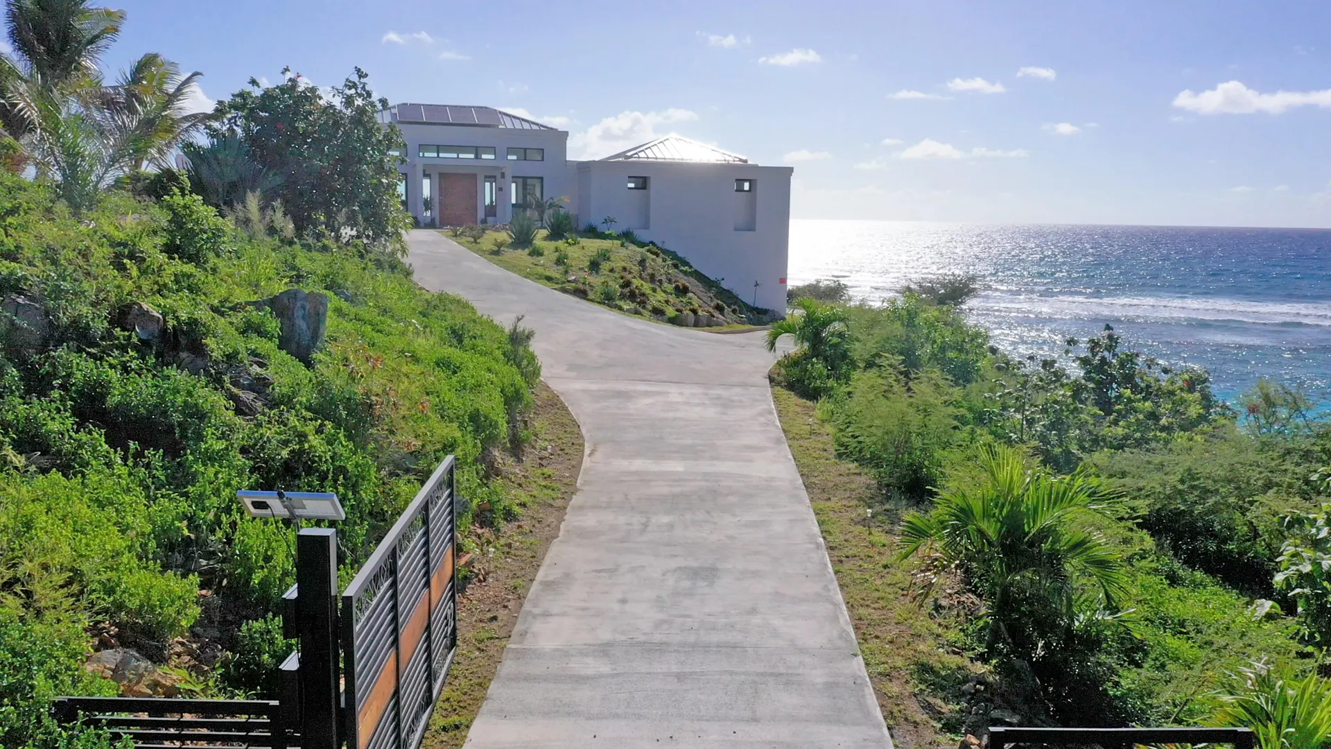 Luxury meets sustainability in this beautiful new build on St Croix's South Shore. Boasting an array of high end finishes and a thoughtful layout, this immaculate 2 bedroom 2 bath villa lays claim to unobstructed panoramic views of Rod Bay, the sparkling sapphire sea, and glorious sunsets. The gated concrete drive leads to a welcoming entrance featuring a custom walnut pivot door that reveals the breathtaking views of the location the minute you pass through. Inside you will find an open and airy living space and kitchen full of quality finishes such as Mod Cabinetry, Krause stainless sink and faucet, Fisher Paykel appliances, and a quartz covered waterfall island. The indoor living area blends seamlessly with the alluring outdoor veranda that gives center stage to