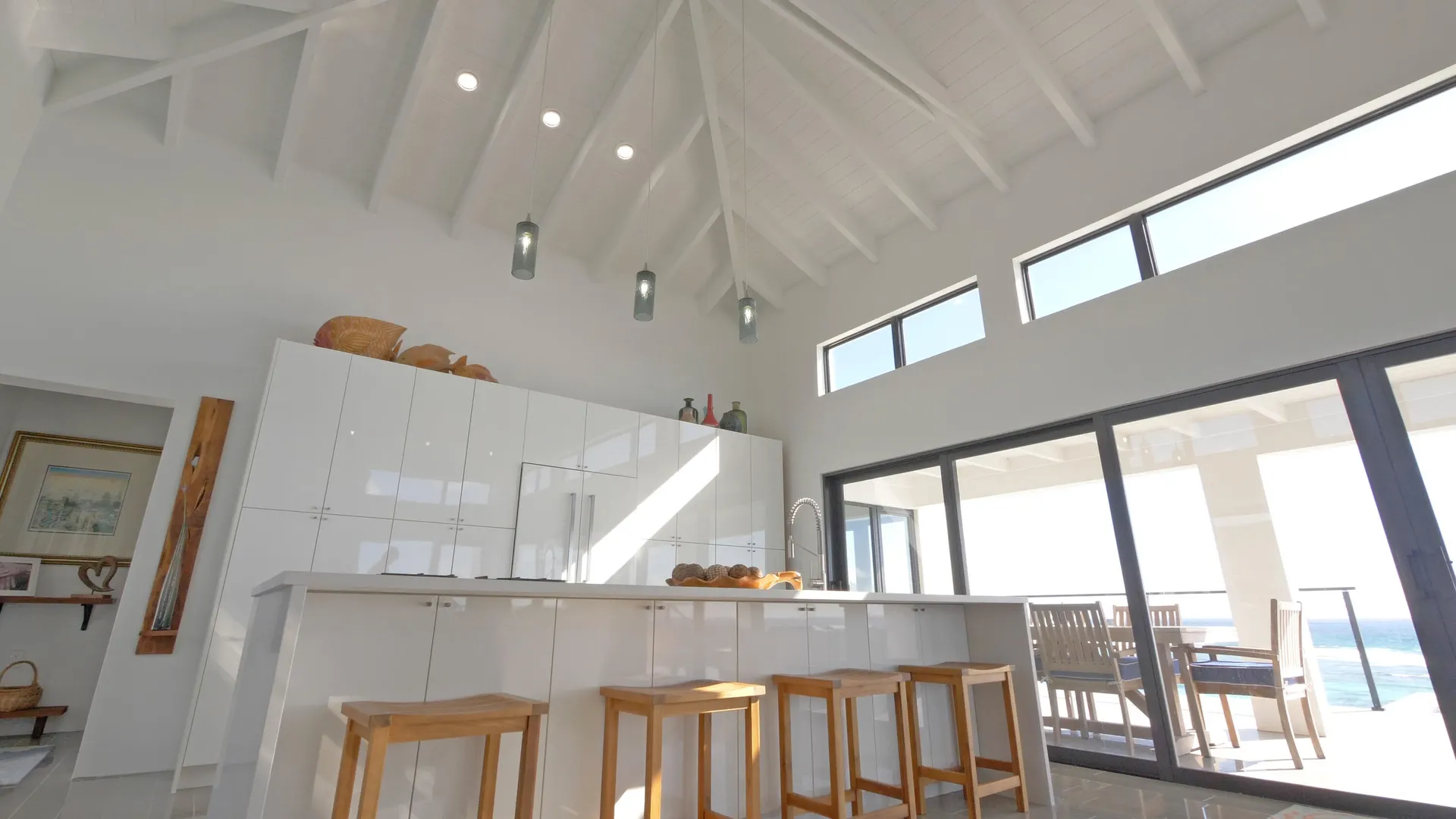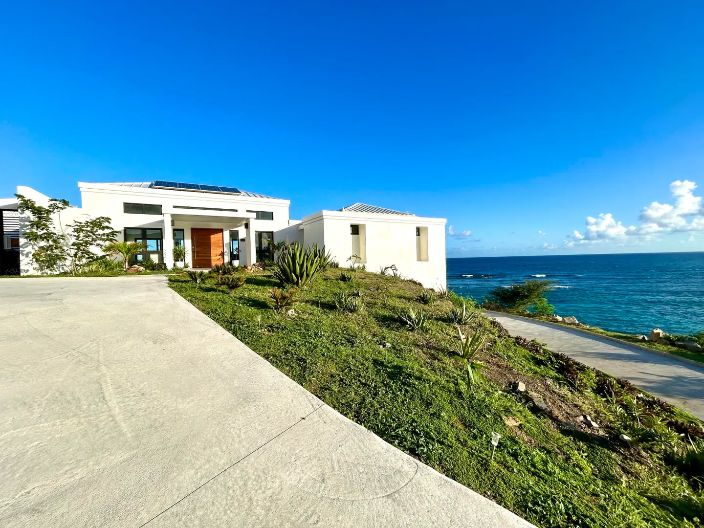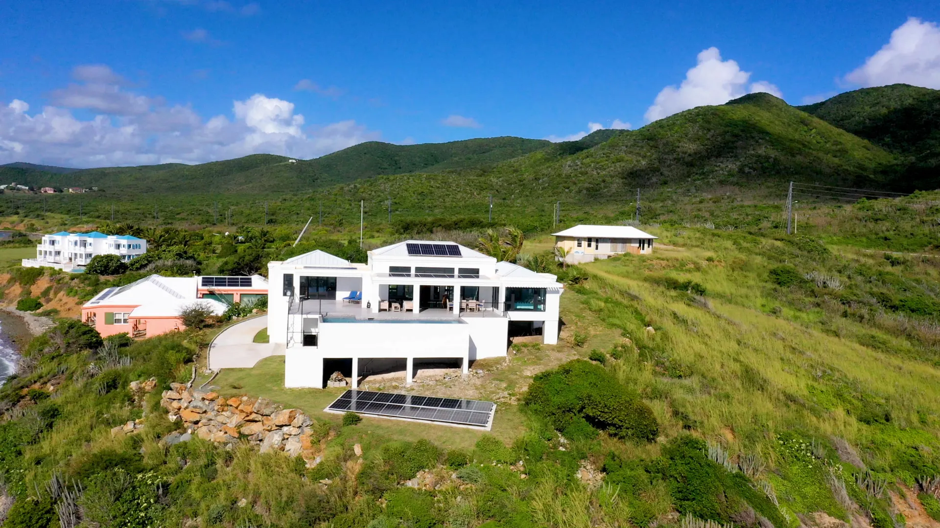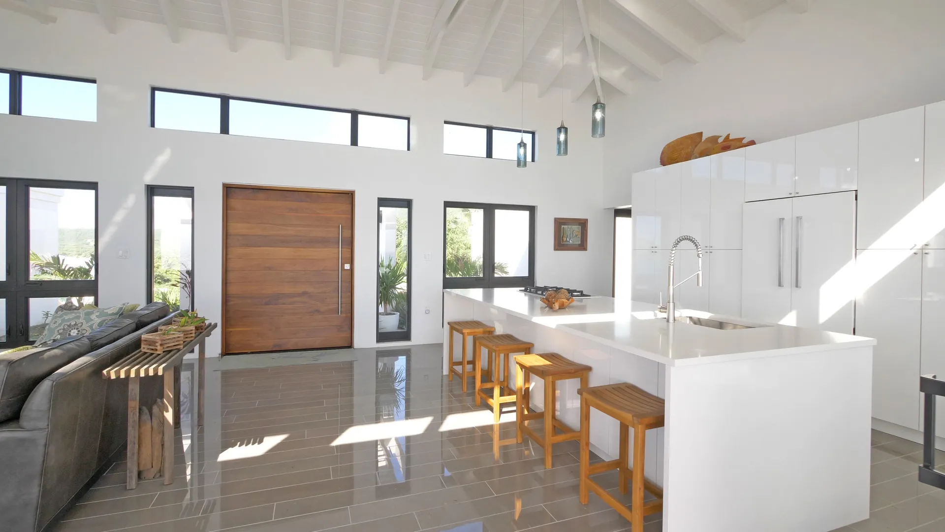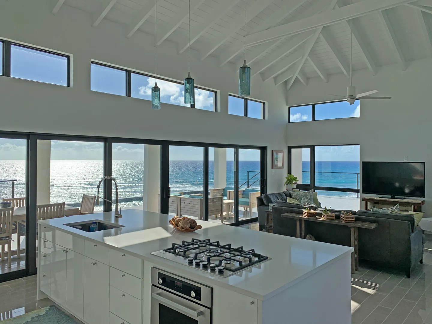 Luxury meets sustainability in this beautiful new build on St Croix's South Shore. Boasting an array of high end finishes and a thoughtful layout, this immaculate 2 bedroom 2 bath villa lays claim to unobstructed panoramic views of Rod Bay, the sparkling sapphire sea, and glorious sunsets. The gated concrete drive leads to a welcoming entrance featuring a custom walnut pivot door that reveals the breathtaking views of the location the minute you pass through. Inside you will find an open and airy living space and kitchen full of quality finishes such as Mod Cabinetry, Krause stainless sink and faucet, Fisher Paykel appliances, and a quartz covered waterfall island. The indoor living area blends seamlessly with the alluring outdoor veranda that gives center stage to