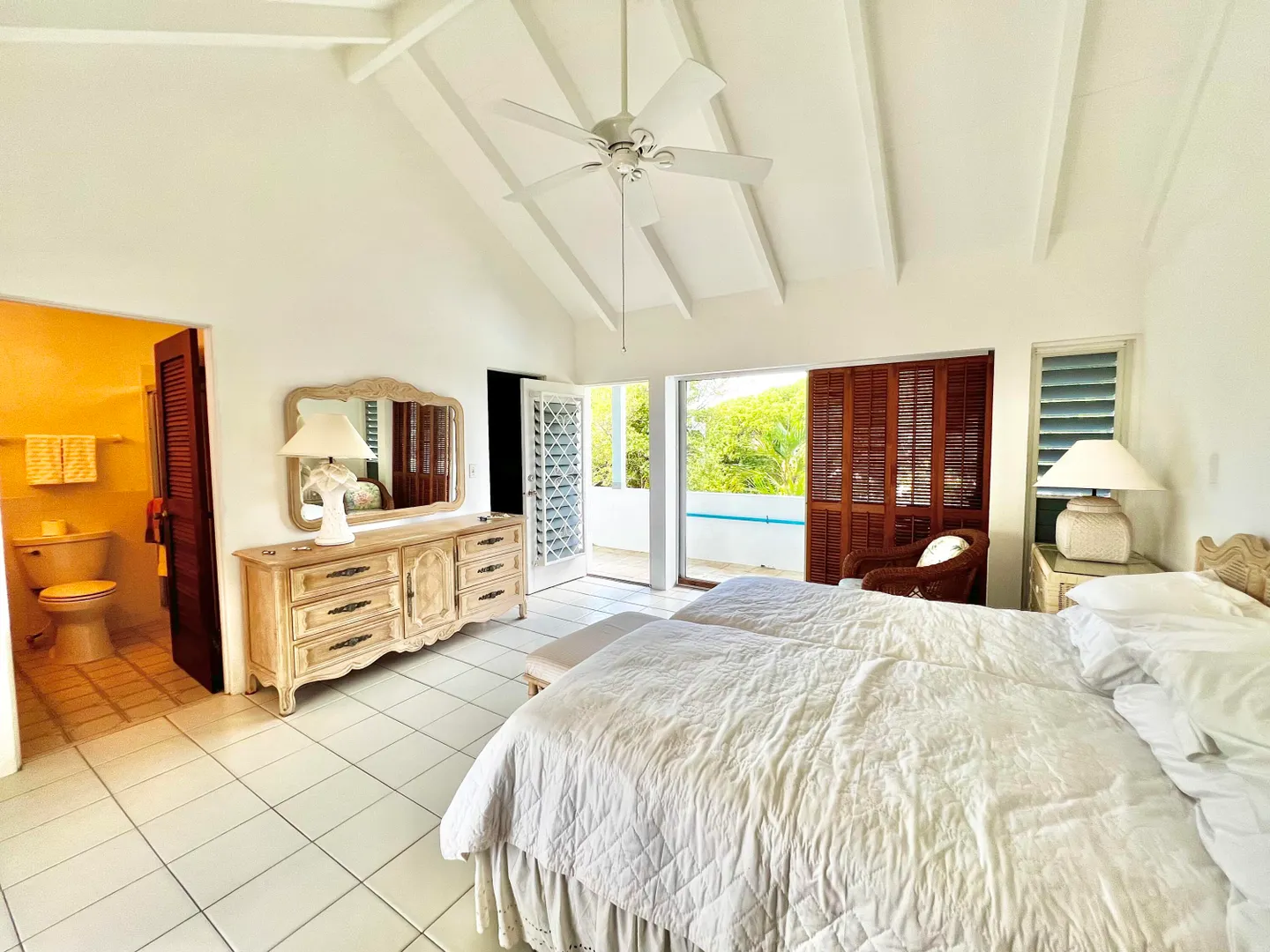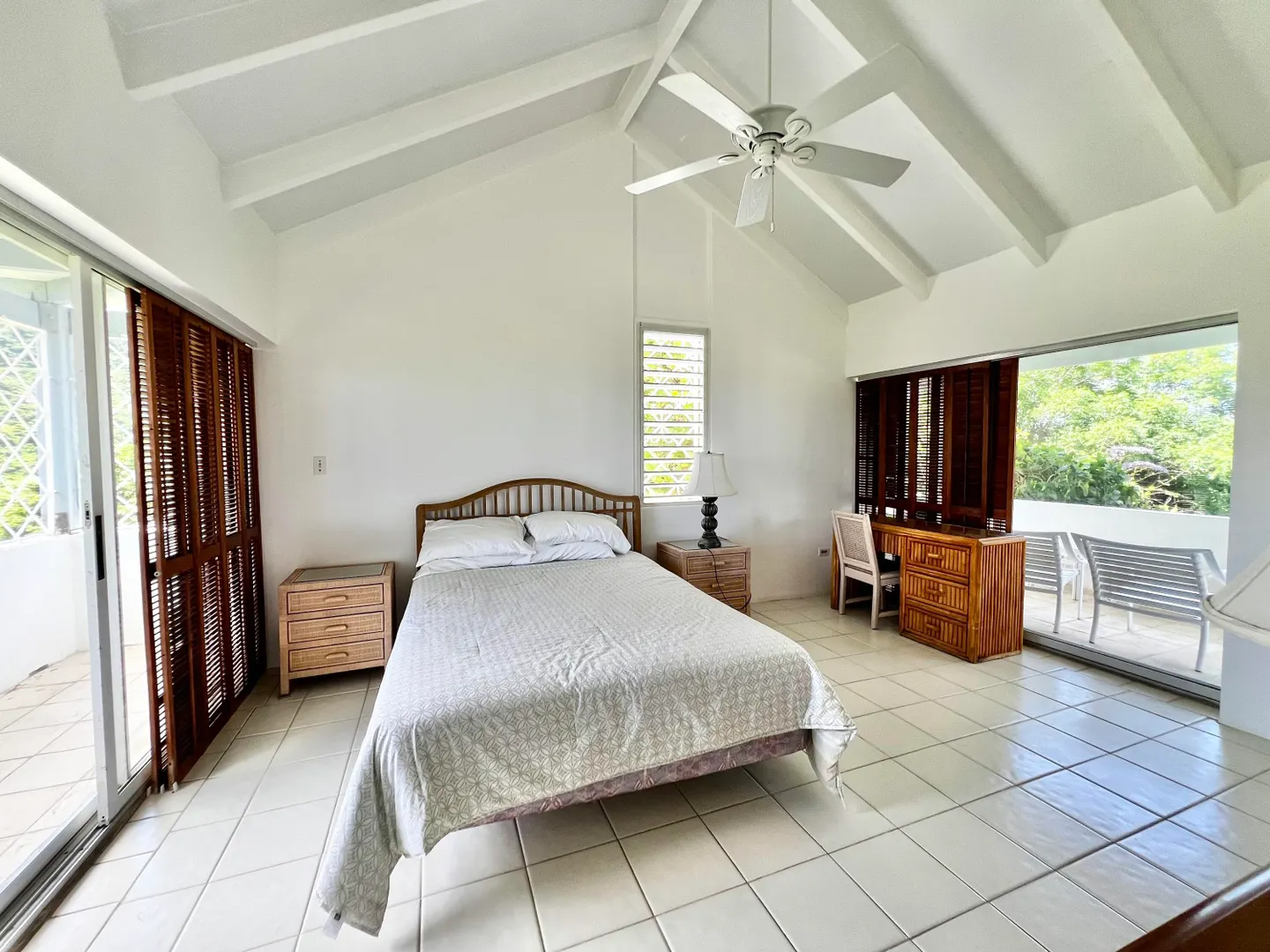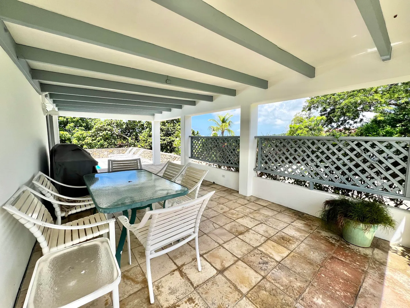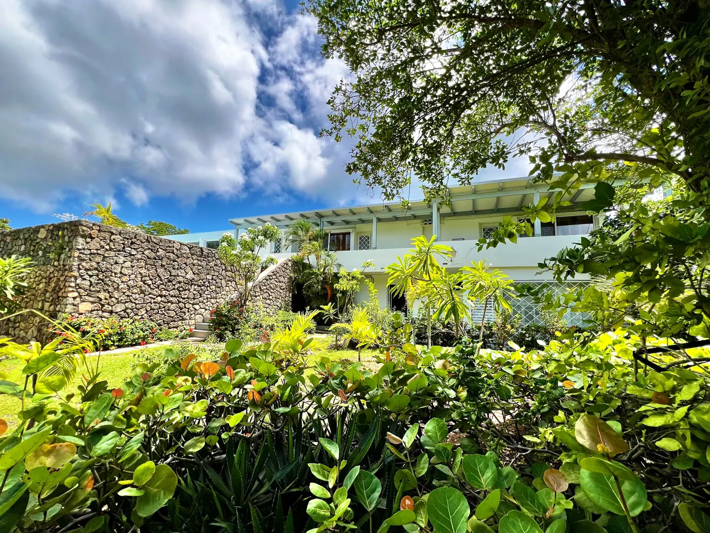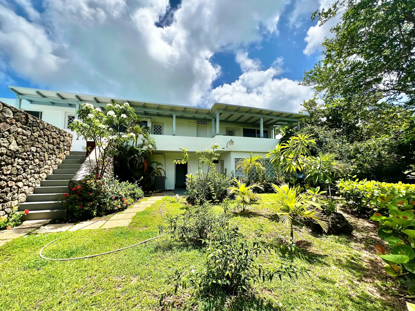 Experience island living at its finest in this three-bedroom villa with a spacious apartment featuring a large swimming pool and a sunlit deck. Nestled amid tranquil outdoor alcoves and shaded seating areas throughout, the property, set back from the Hermon Hill neighborhood road, offers privacy and serenity. The villa, set on a large yard, is surrounded by majestic old trees and lush landscaping adding to its tranquil vibe. The home has a large great room that is flanked by sea views and galleries to the north and the swimming pool to the south, with potential sea views in that direction. Two primary bedrooms, each with a private entrance via a covered exterior walkway, open to a sea-facing gallery and a shaded outdoor living area. The third bedroom, which can also serve as an officeis located off the large living room, making it versatile for guests or hybrid use.
